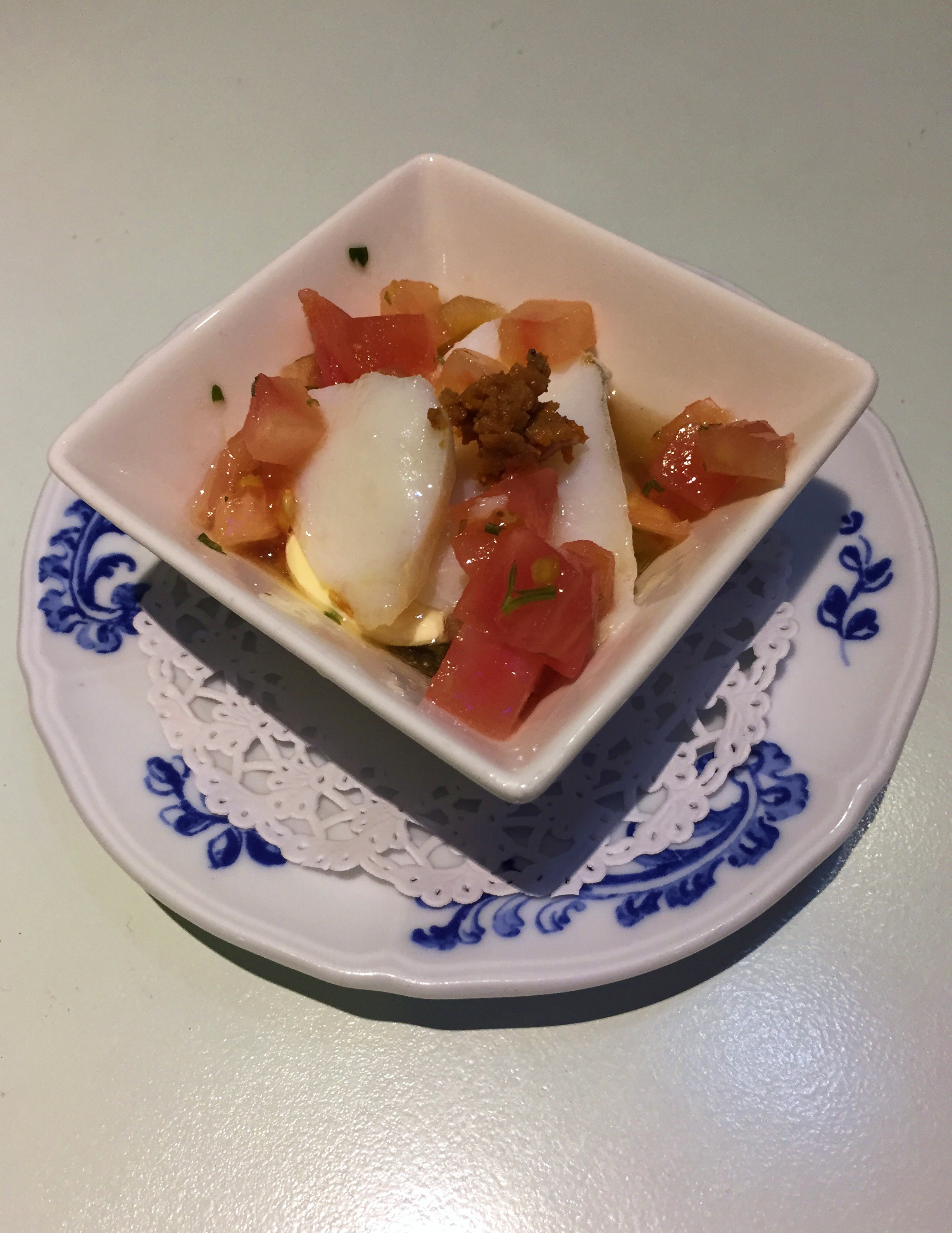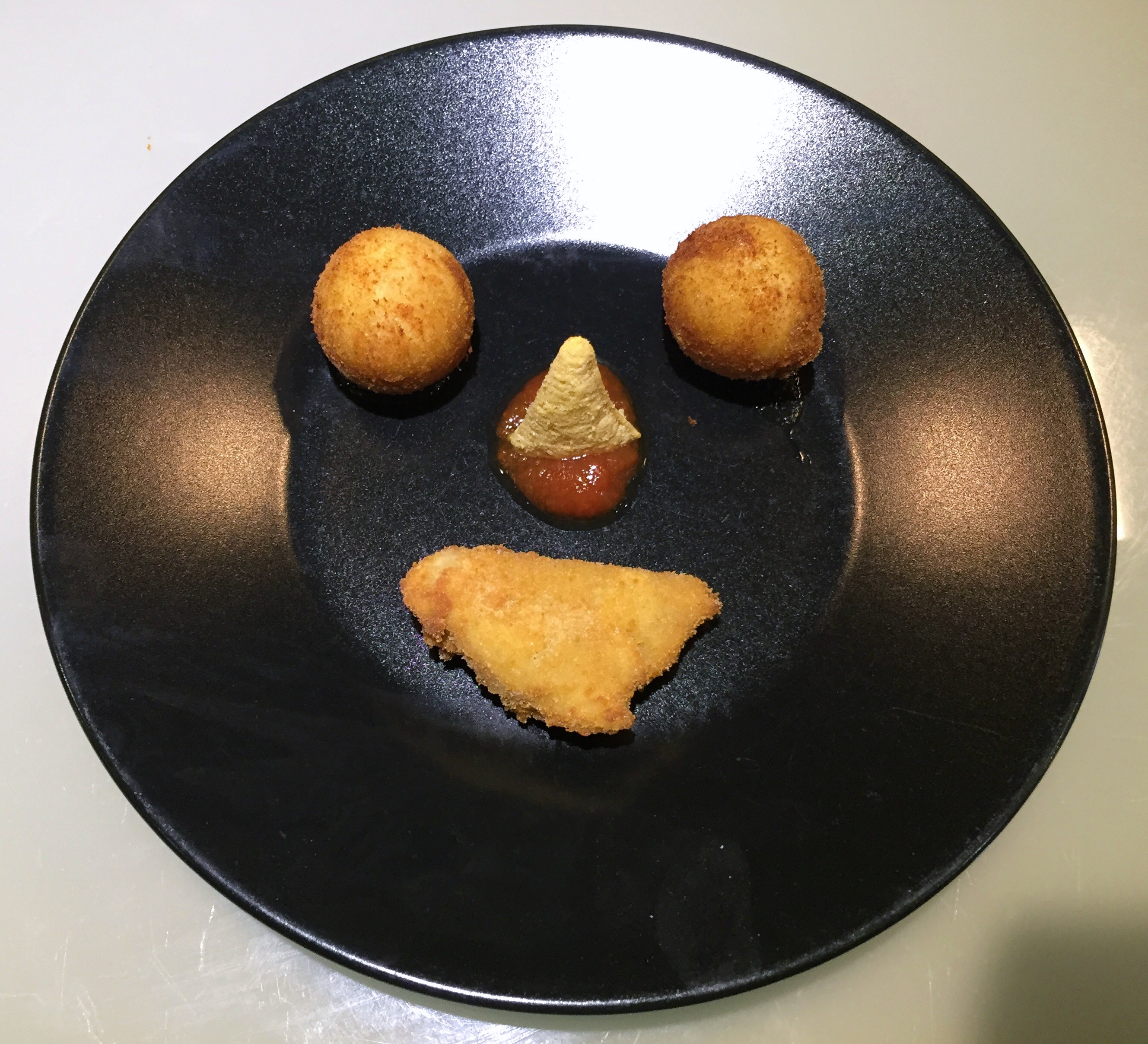 Croquetas de bacalao y gamba, frito de bacalao relleno con huevo acompañado de una mermelada de tomate y un Matutano 3D. El juego del 3D simulando el capirote resulta cuanto menos chocante, la presentación en plan emoticono dudosa y el contenido nada del otro mundo como para que tuviese que ir por segunda vez ya que sólo lo servían hasta las 3 y yo aparecí a las 3:15.