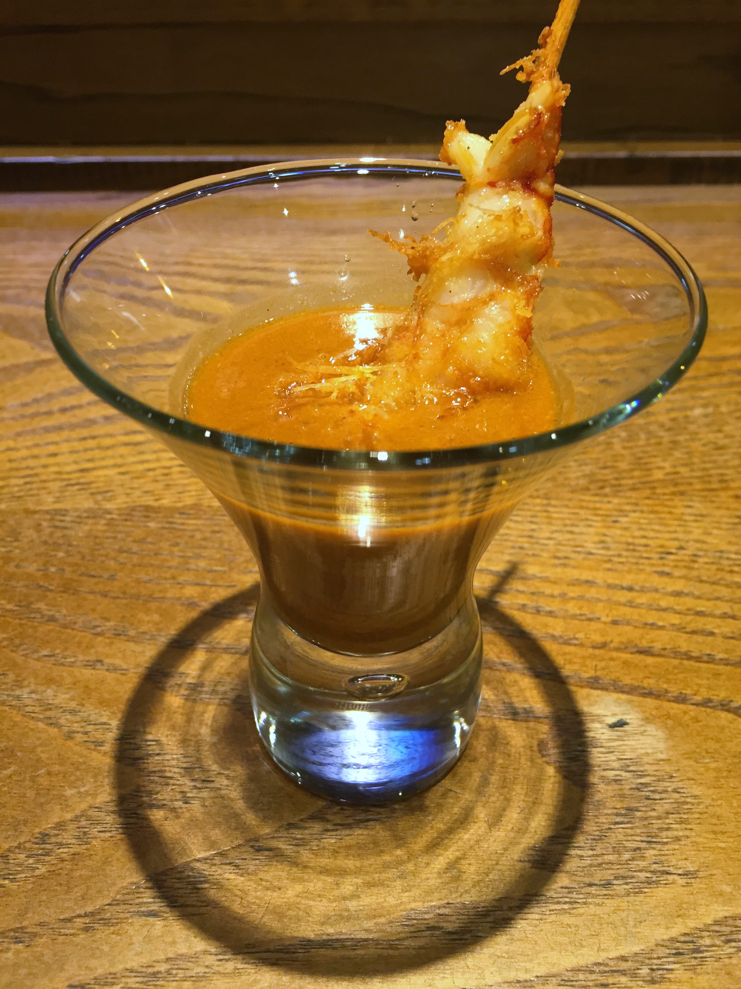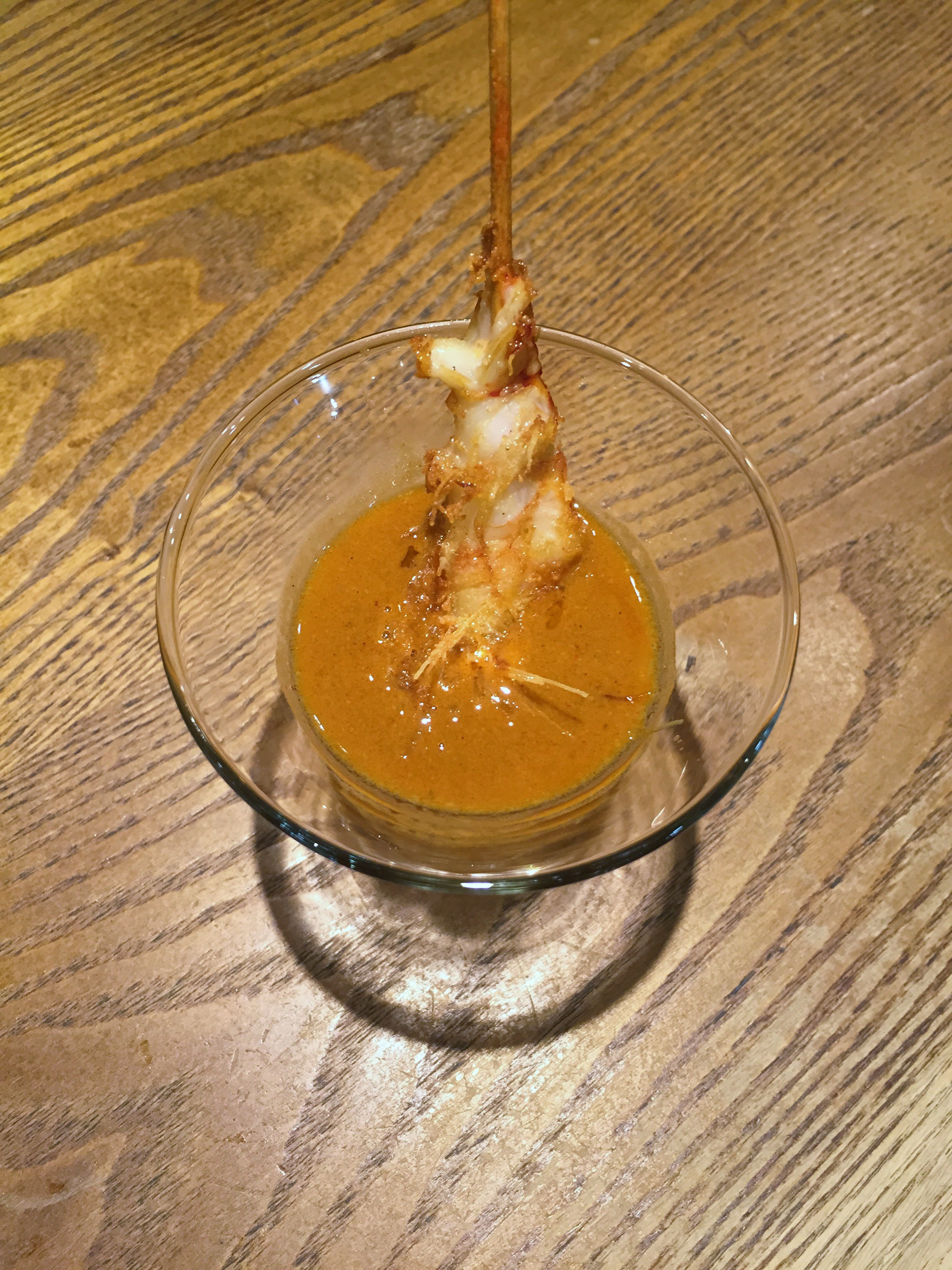 Brocheta de langostino con pasta kataifi y salsa de sus propios jugos. Langostino grande, jugoso, crujiente y la salsa de potente sabor a marisco. Sencillo y bien presentado.