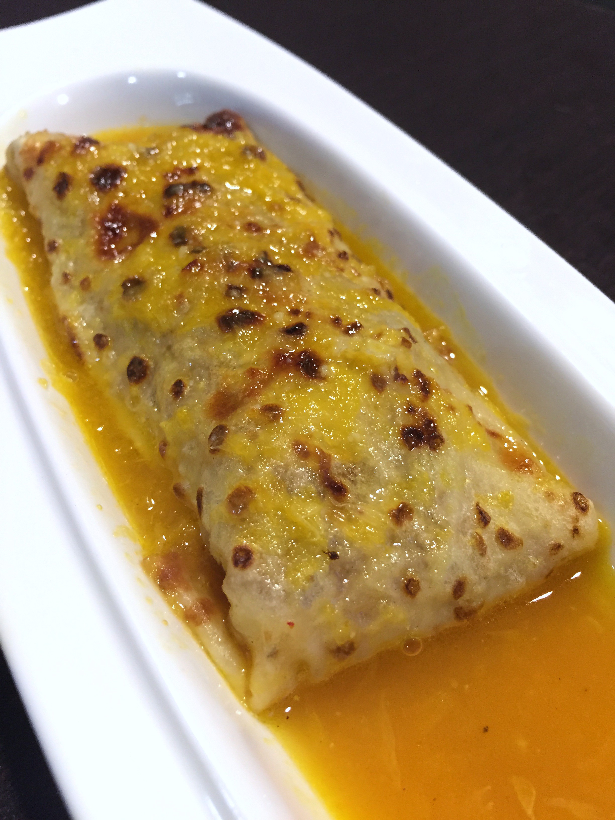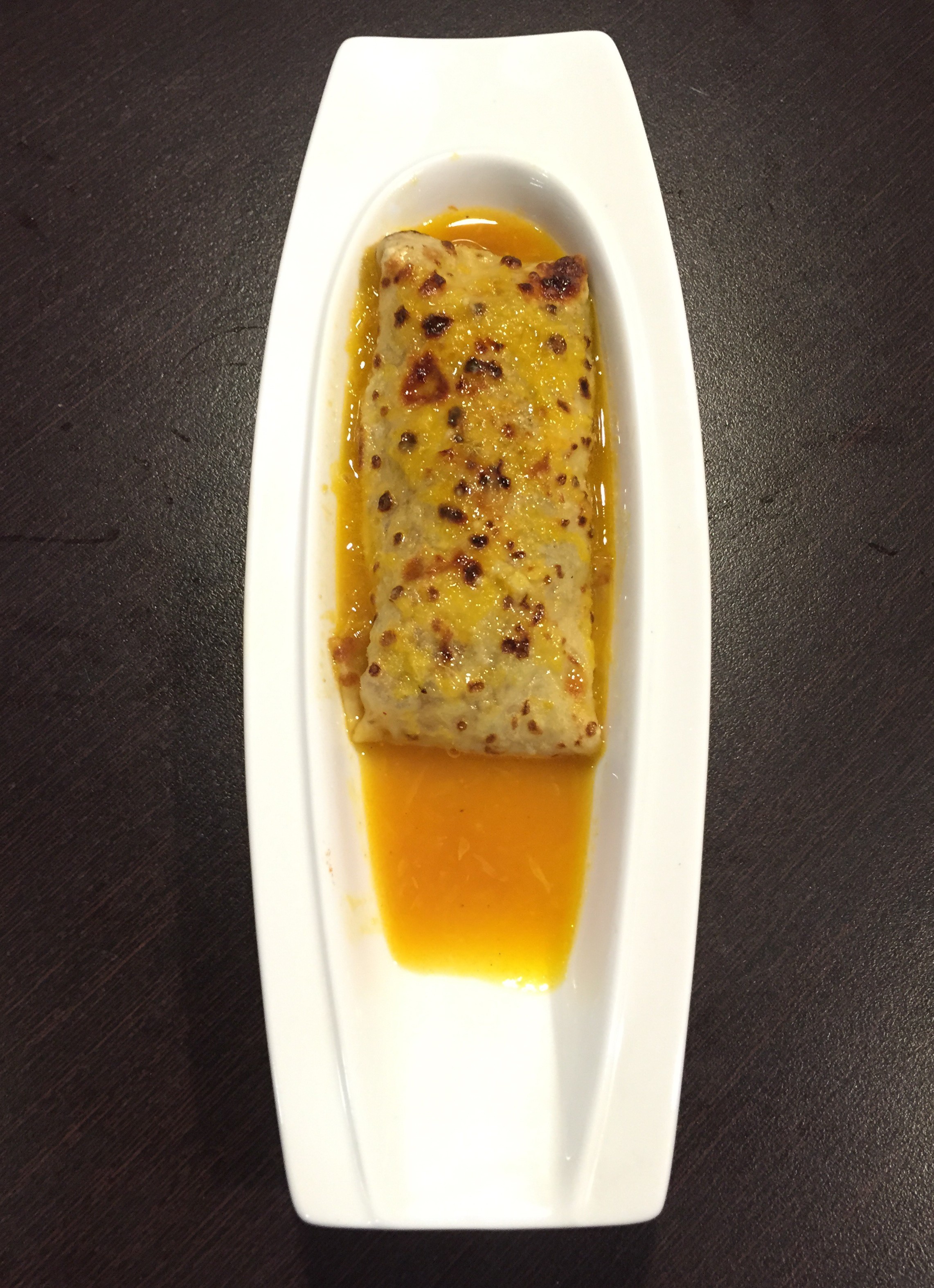 Frixuelo relleno de ñocla, centollo y gambas con una salsa de naranja al horno. Bocado muy pensado queriendo representar el dorado con el manto de naranja, pero camufla el sabor de un excelente relleno de marisco y un rico frixuelo. Una pena porque además está bien presentado y es abundante.