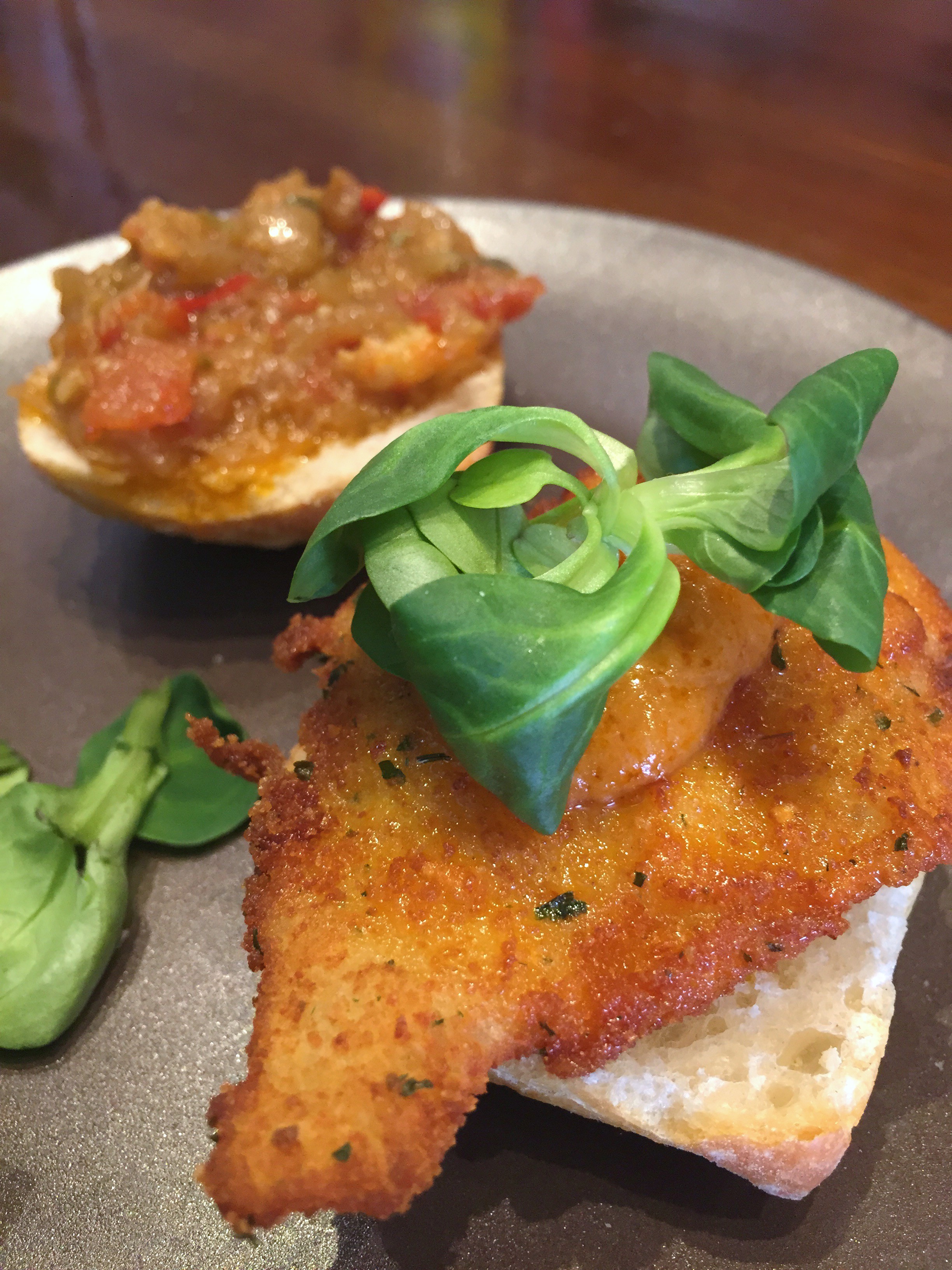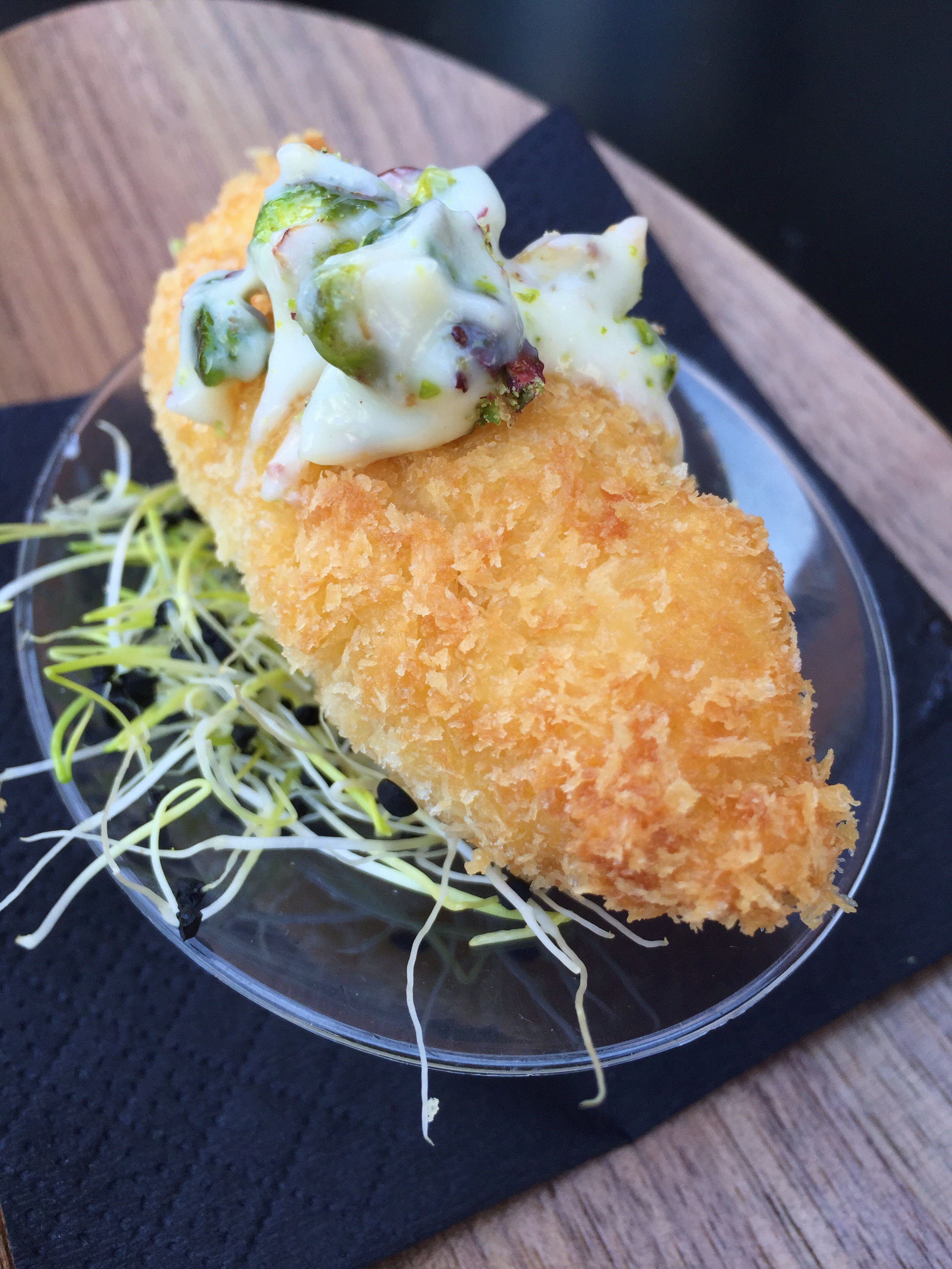 Gambón a la gabardina de panko con alioli de pistacho sobre cama de germinados. Para no tener cocina está defendido, crujiente, recién hecho y curioso toque el del alioli de pistacho. Cuidada presentación, pero ni por nombre, ni contenido, hace referencia al espíritu de los Bocados, exceptuando que es marisco.