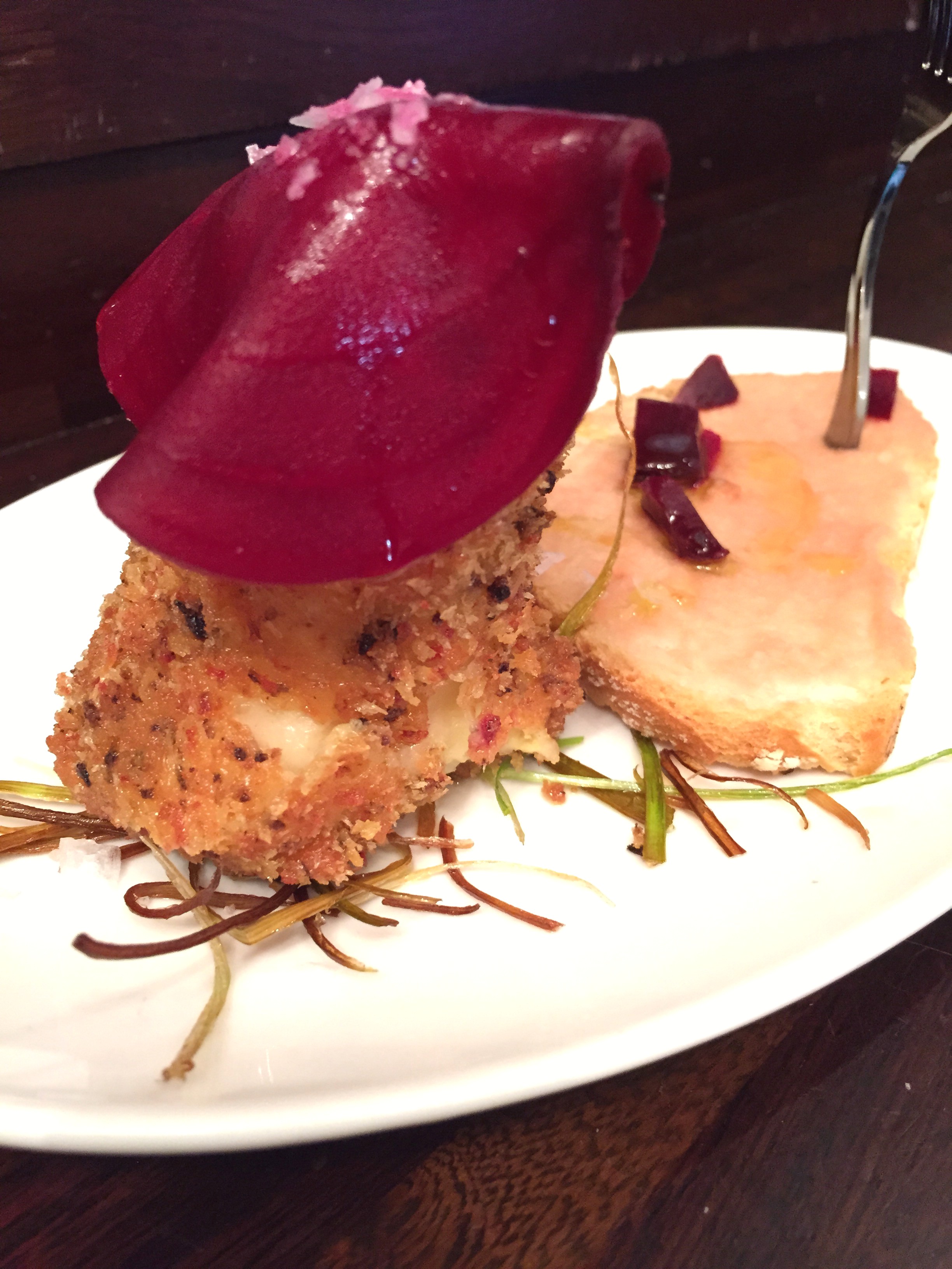 Croquetón de bacalao rebozado en panko con forma de capirote, coronado con una rodaja de remolacha con sal Maldon sobre crujientes de puerro y acompañado de una tosta crujiente con salmorejo salpicada con remolacha y un chorrito de AOVE. Conseguida la emulación de un paso por forma y colores. Abundante y contundente.