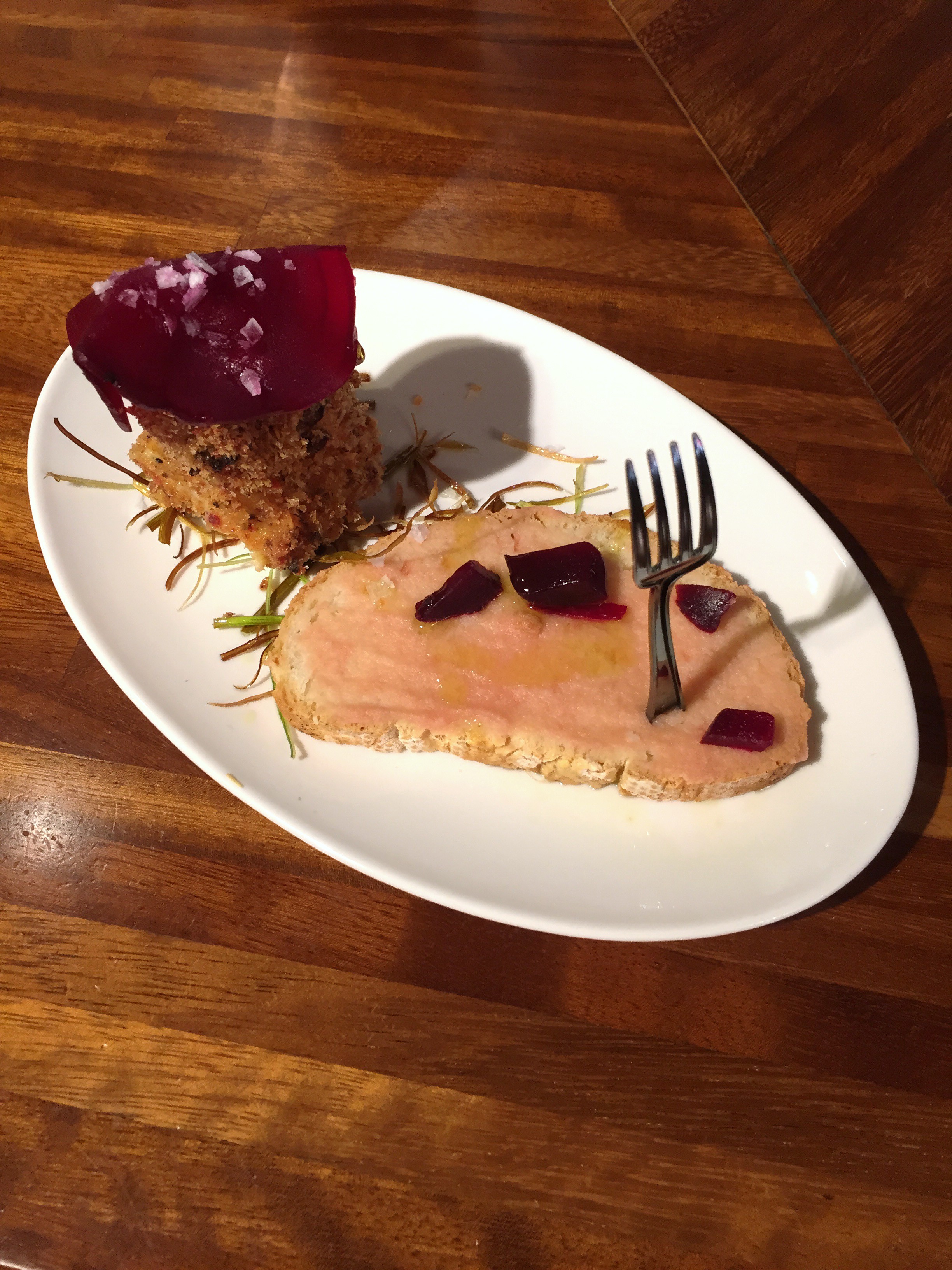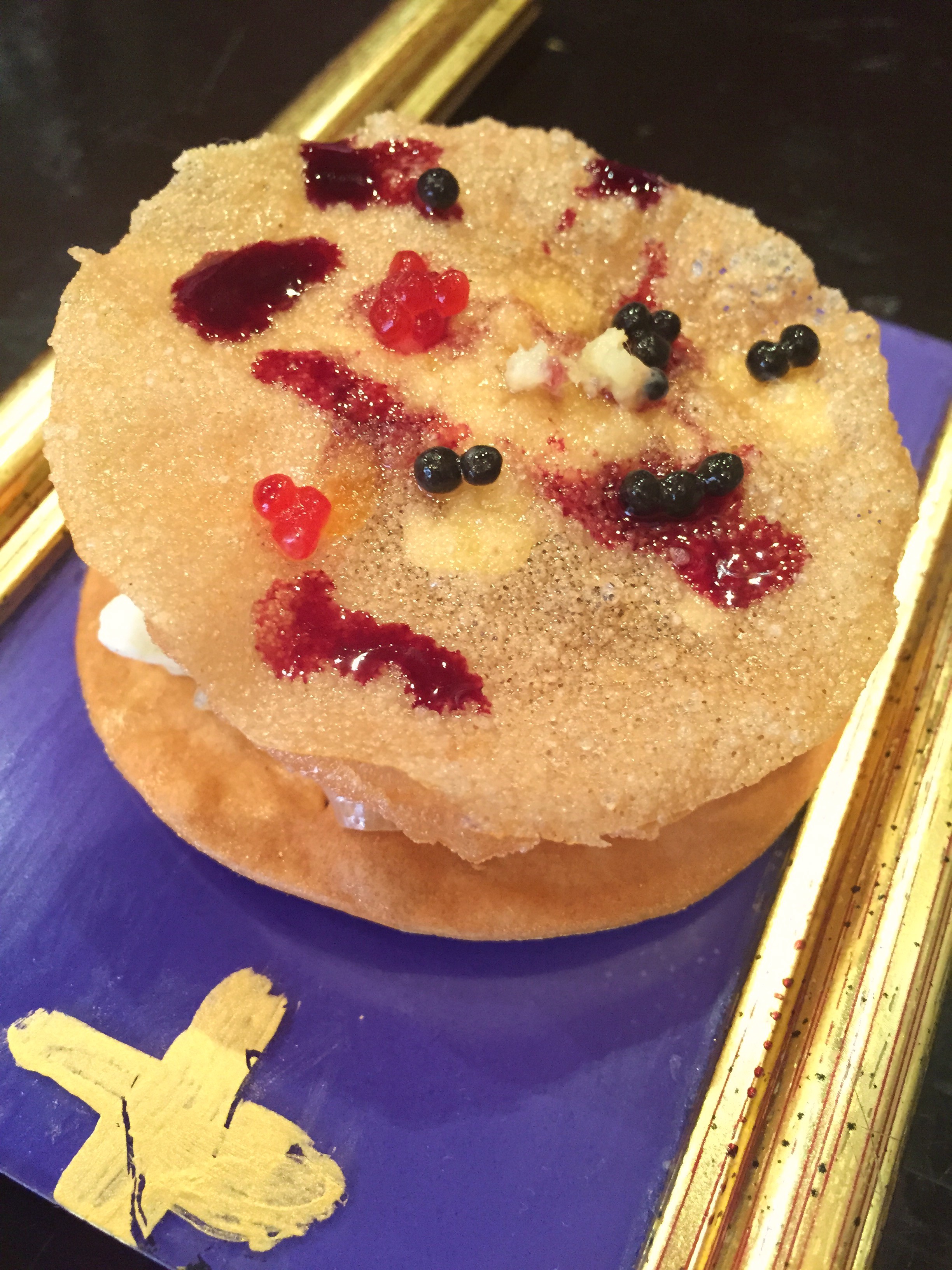 Tosta con verduras asadas por separado, patata teñida al vino, anchoa y palitos de mar con dos reducciones, una de cebolla con tomate y otra de balsámico y miel. La decoración con unos arándanos salvo por el color no aporta demasiado. Sabroso aunque para mi gusto esos palitos sobran. Cuidada presentación que se salva en temática por la patata teñida.