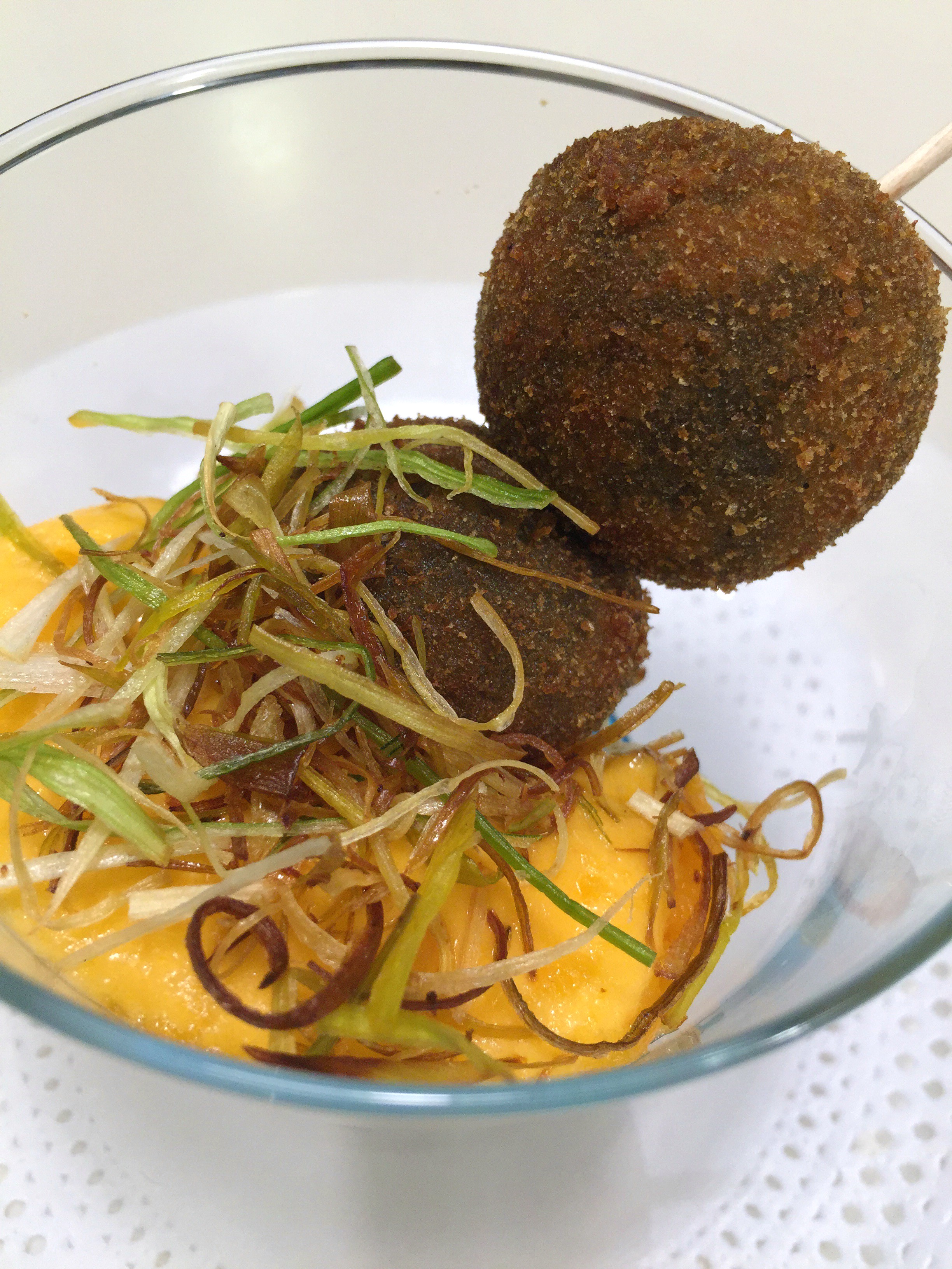 Albóndiga de patata, cebolla caramelizada, palitos de mar y pulpo, rebozada en pistacho y acompañada de una crema de champiñones con trozos de pulpo y dos biscotes de pan. Esmerado, la albóndiga rica, el pulpo queda diluido por la rica crema de champiñones, la presentación no resulta muy atractiva.