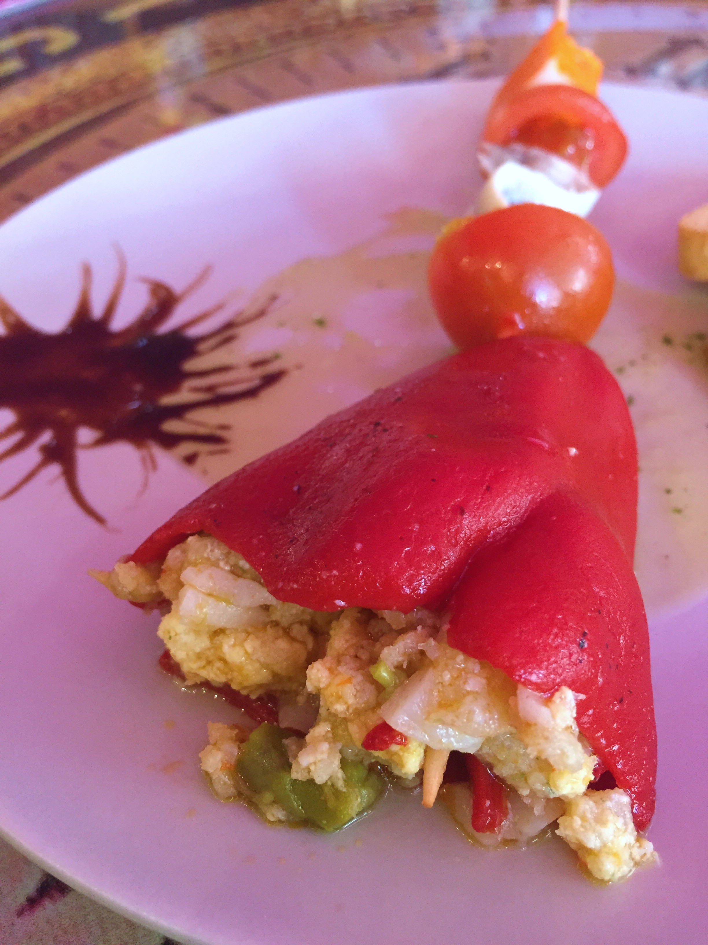 Correcta composición con el pimiento de piquillo simulando a un capirote. Esta relleno de revuelto de gambas, trigueros y palitos de mar. Ensartado a modo brocheta con un tomate cherry, boquerón en vinagre y palito de mar. Decorado artístico de reducción de vinagre de Módena. Da la cara y salva los muebles honrosamente.