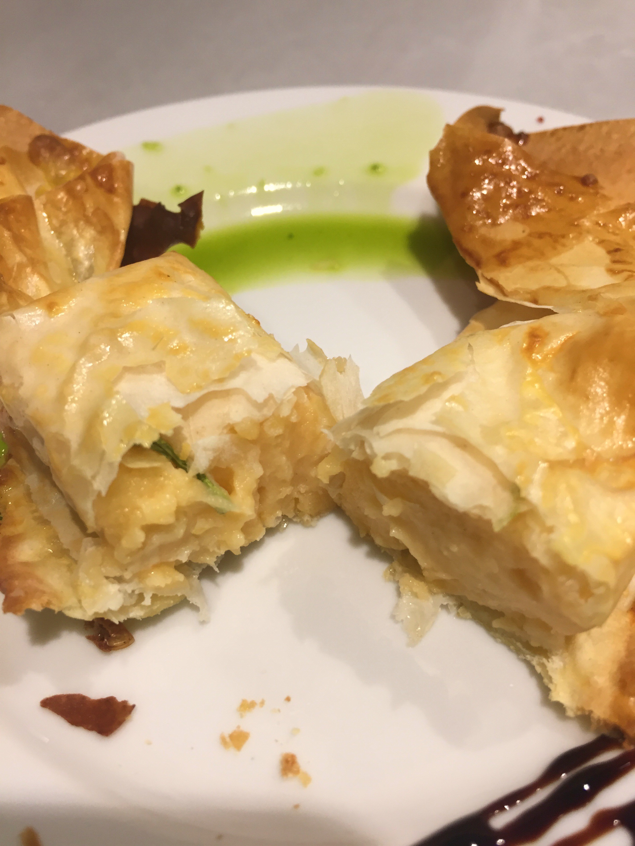 Caramelo de hojaldre relleno de una bechamel con berberechos y gambas. Caliente, crujiente, sabroso, pero con una presencia mala y sin relación alguna con la temática.
