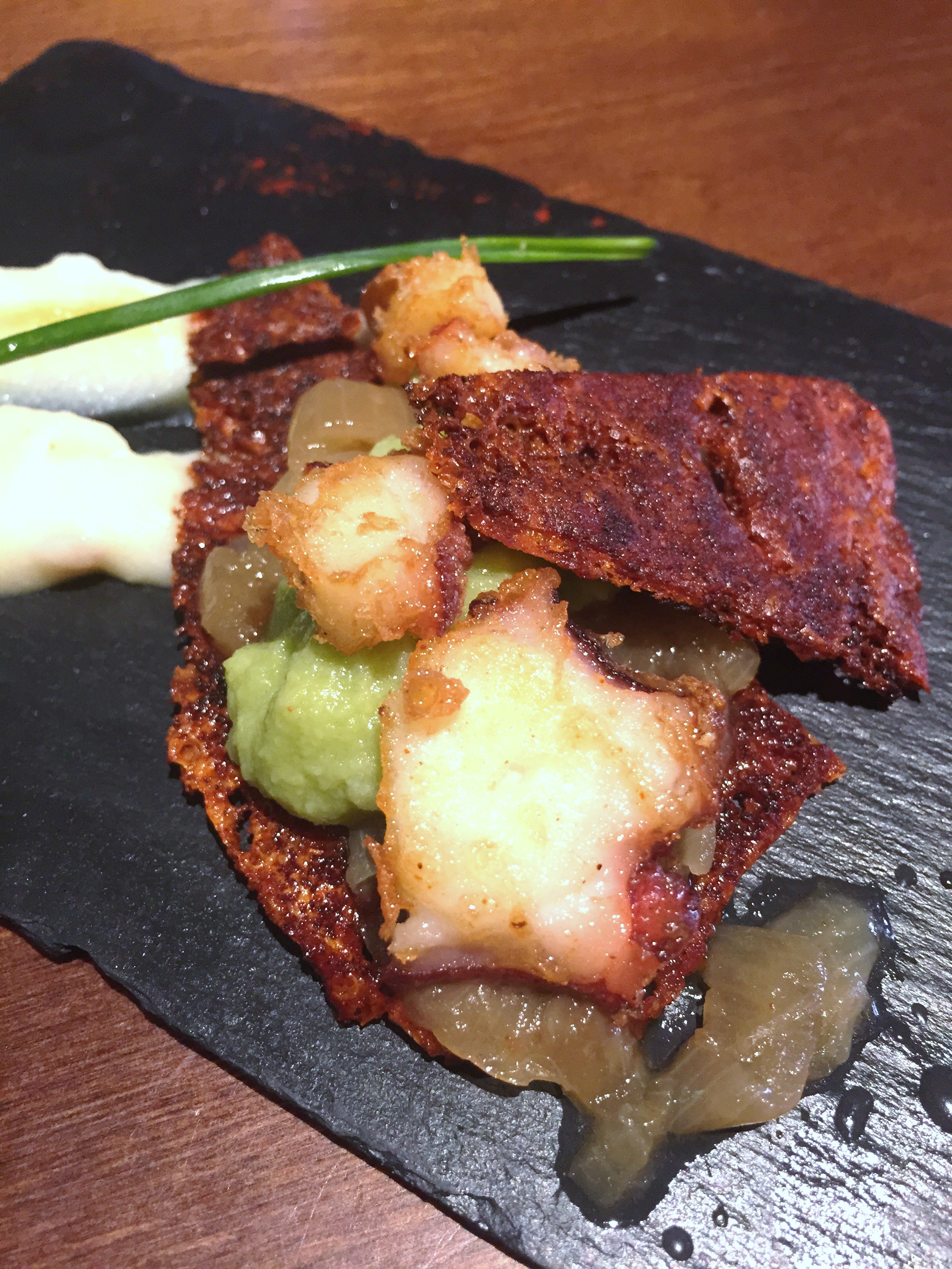 Crujiente de pimentón con tempura de pulpo, cebolla confitada, guacamole y puré de patata. La tempura no es buena aunque el conjunto se disfruta. Presentación embarullada, el crujiente creo que quería simular al capirote pero le faltaba el pico.