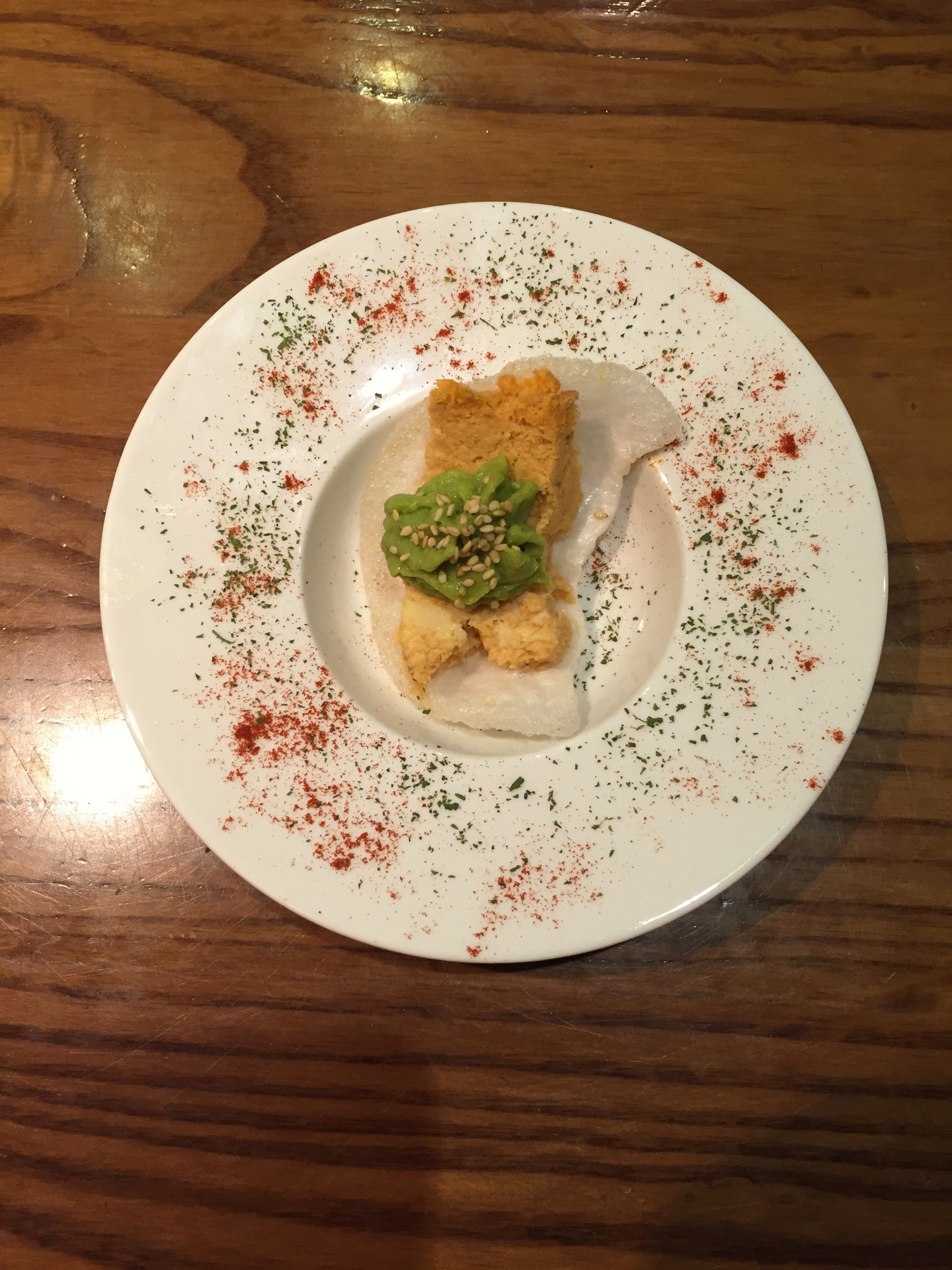 Nos presenta un crujiente pan de gamba sobre el que yace un pastel de salmón con guacamole y un toque de tabasco. Decoración elegante con sésamo, perejil y pimentón. El pan aguanta bien el peso para comer como bocado, los sabores mezclan muy bien. No capté la intención del nombre. No me transmitió nada relacionado con el evento a pesar de que estaba rico.