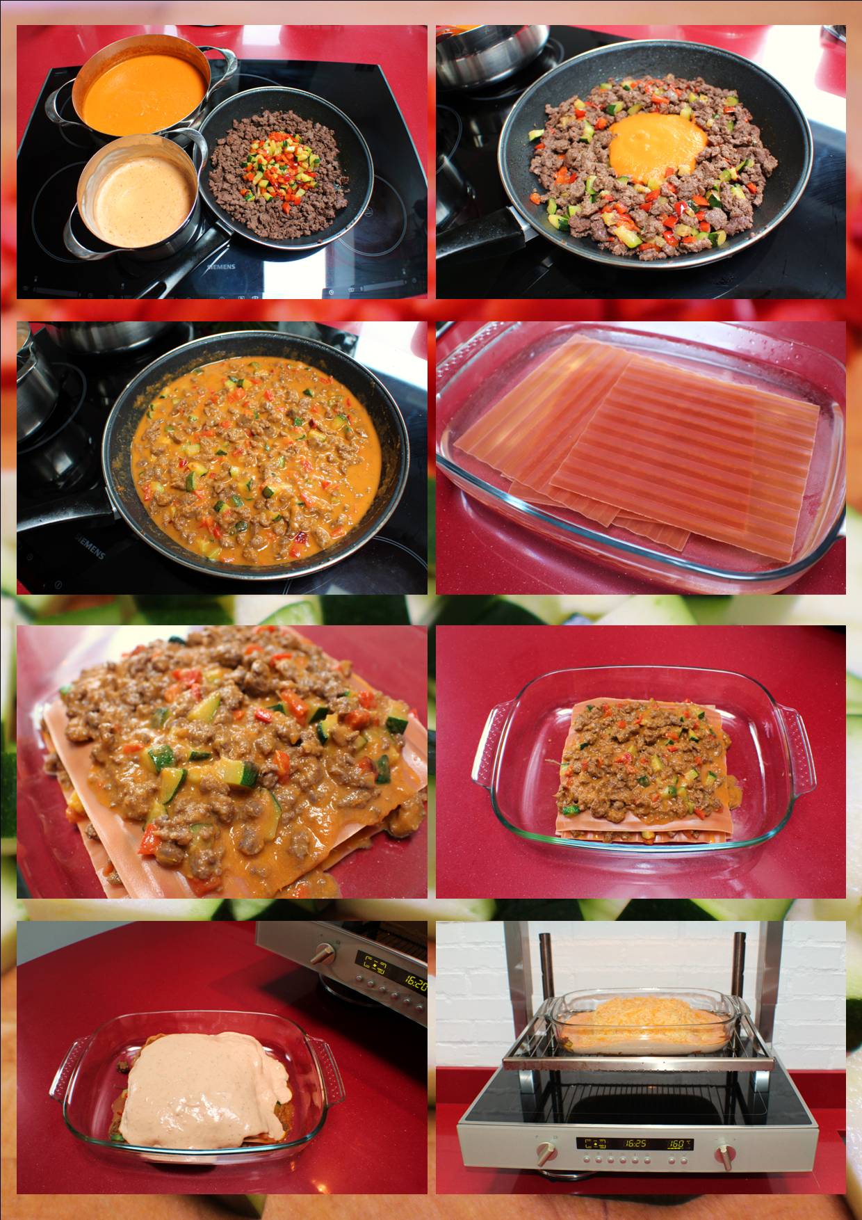 Placas de lasaña de tomate, 600grs de wagyu (4 hamburguesas), 2kgs de tomate, 1 cebolla, 1 pimiento rojo, 1 calabacín pequeño, leche, mantequilla, harina, tomates secos en aceite, 1 rama de laurel, 200grs de queso hilado, azúcar, aceite de oliva virgen extra, sal y agua.