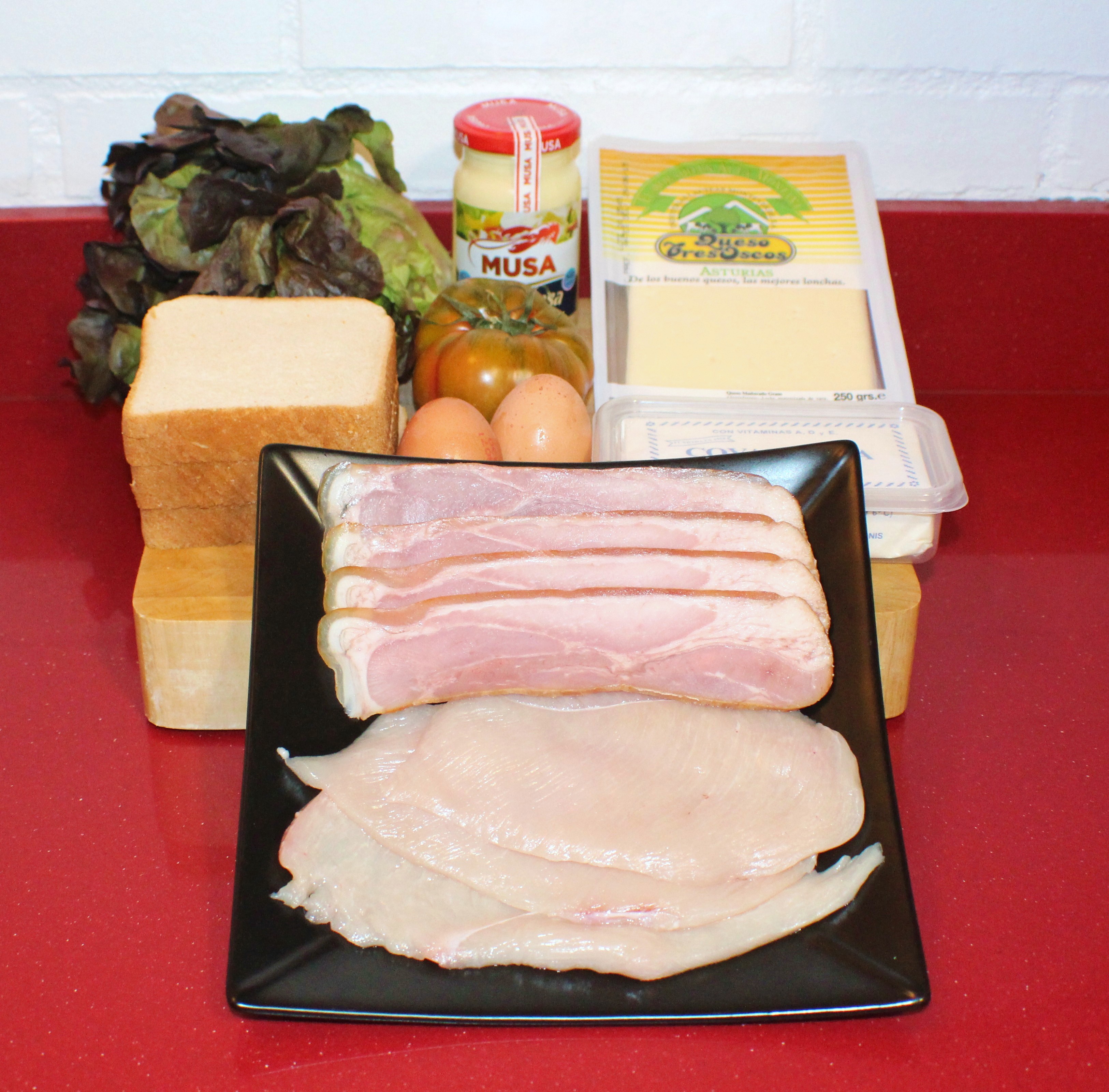 En la plancha o sartén primero tostamos el pan con la mantequilla por ambas caras, una de ellas ponemos una loncha de queso reservamos. Limpiamos y con un poco de aceite ponemos nuestra pechuga y bacon. Procedemos al montaje, base con la base que tiene el queso, bacon y tortilla, tapa untada por arriba con mayonesa, lechuga, tomate y pollo, cerramos con tapa untada de mayonesa.