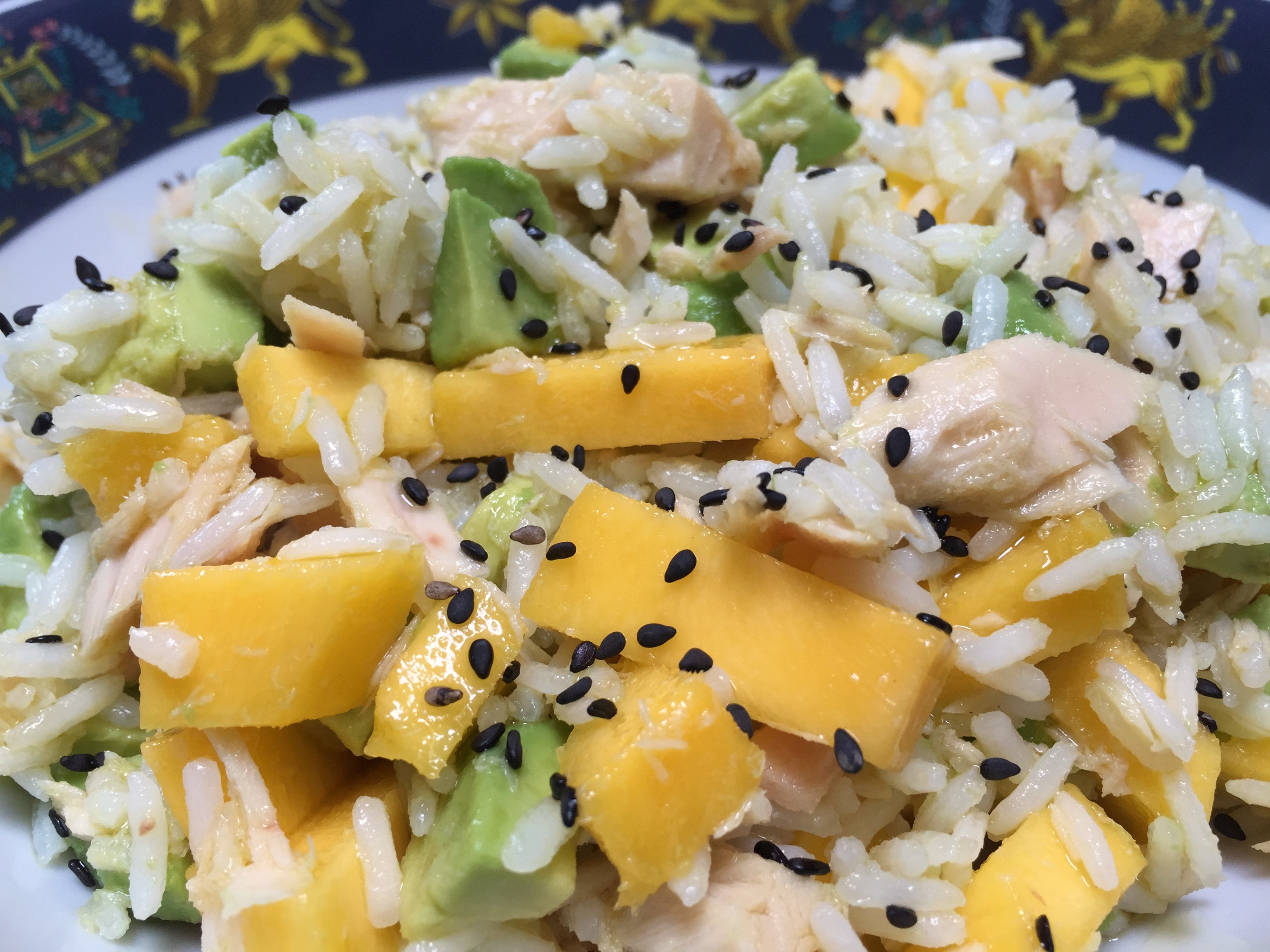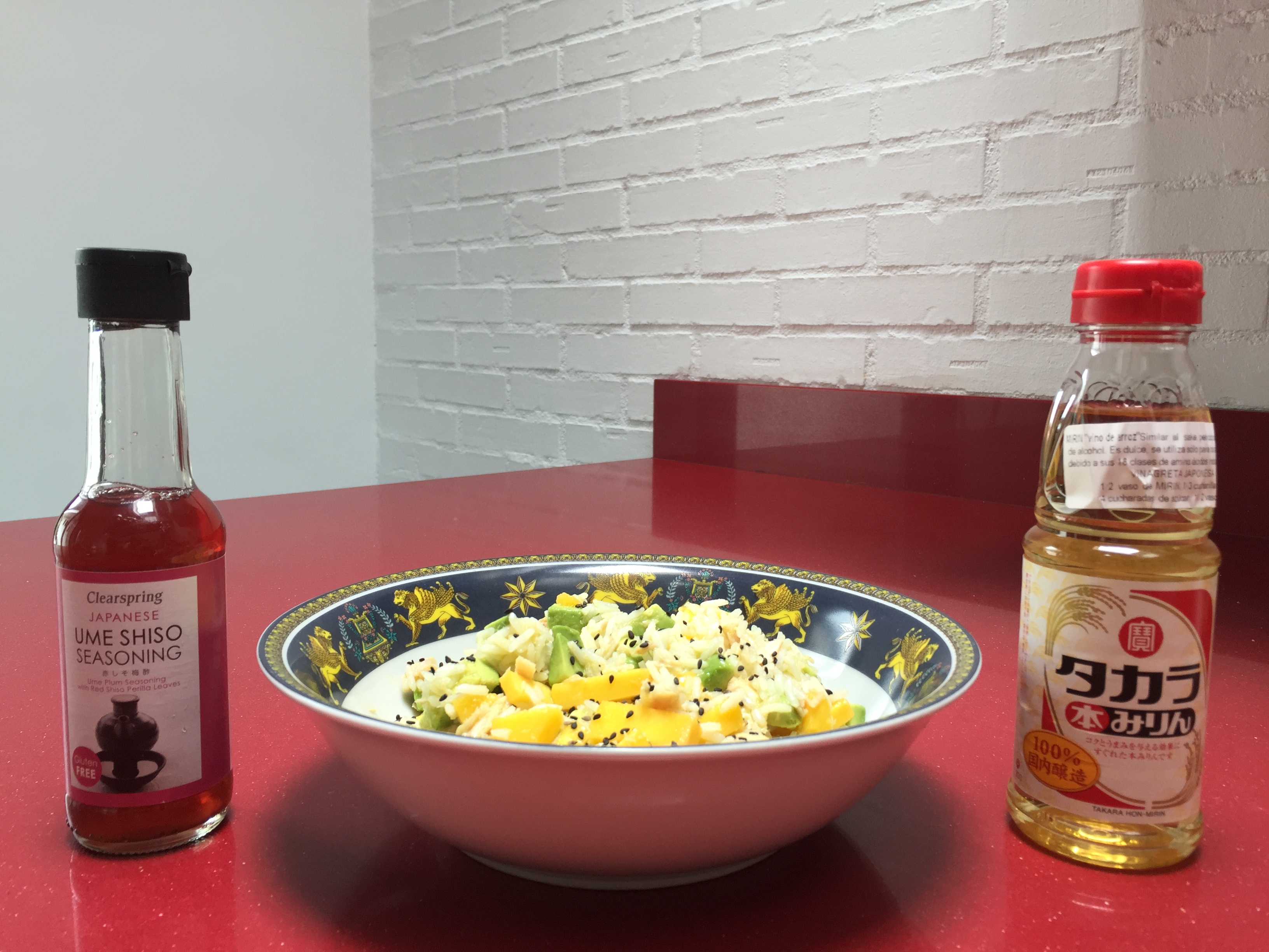 Arroz jazmín o basmati, 1 aguacate, 1 mango, bonito en aceite de oliva, ume shiso, mirin, sésamo negro, AOVE, sal y AOVE