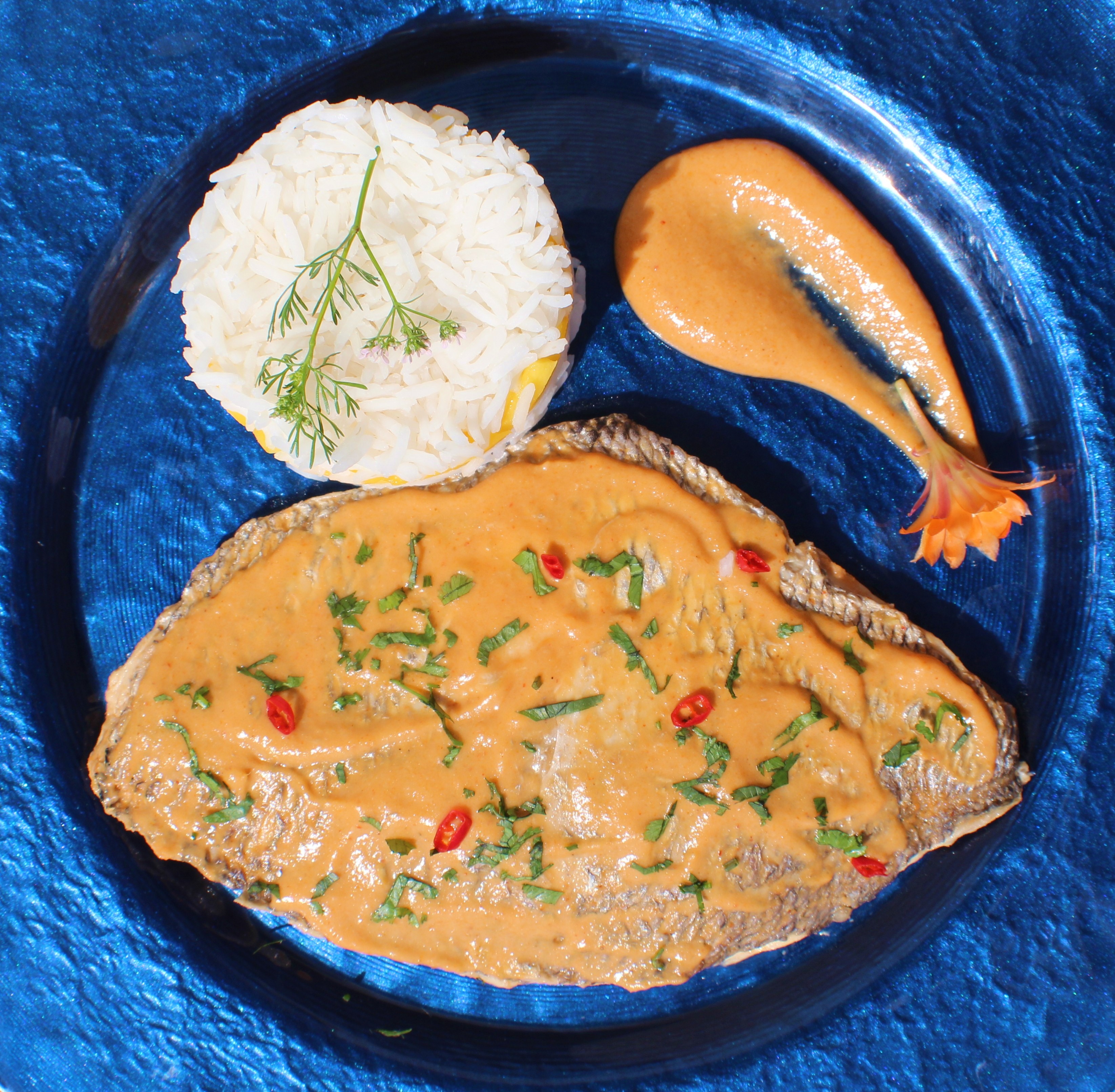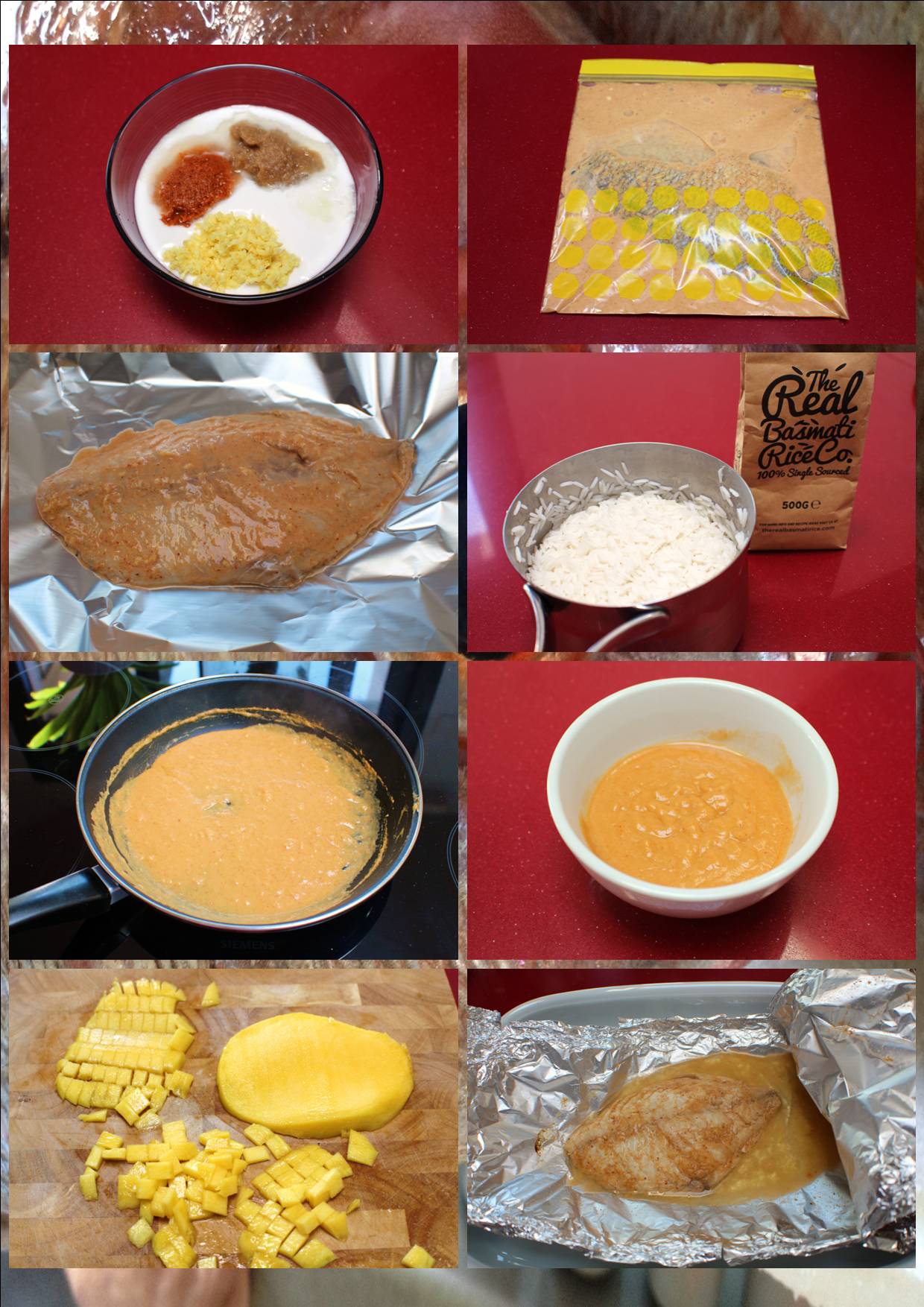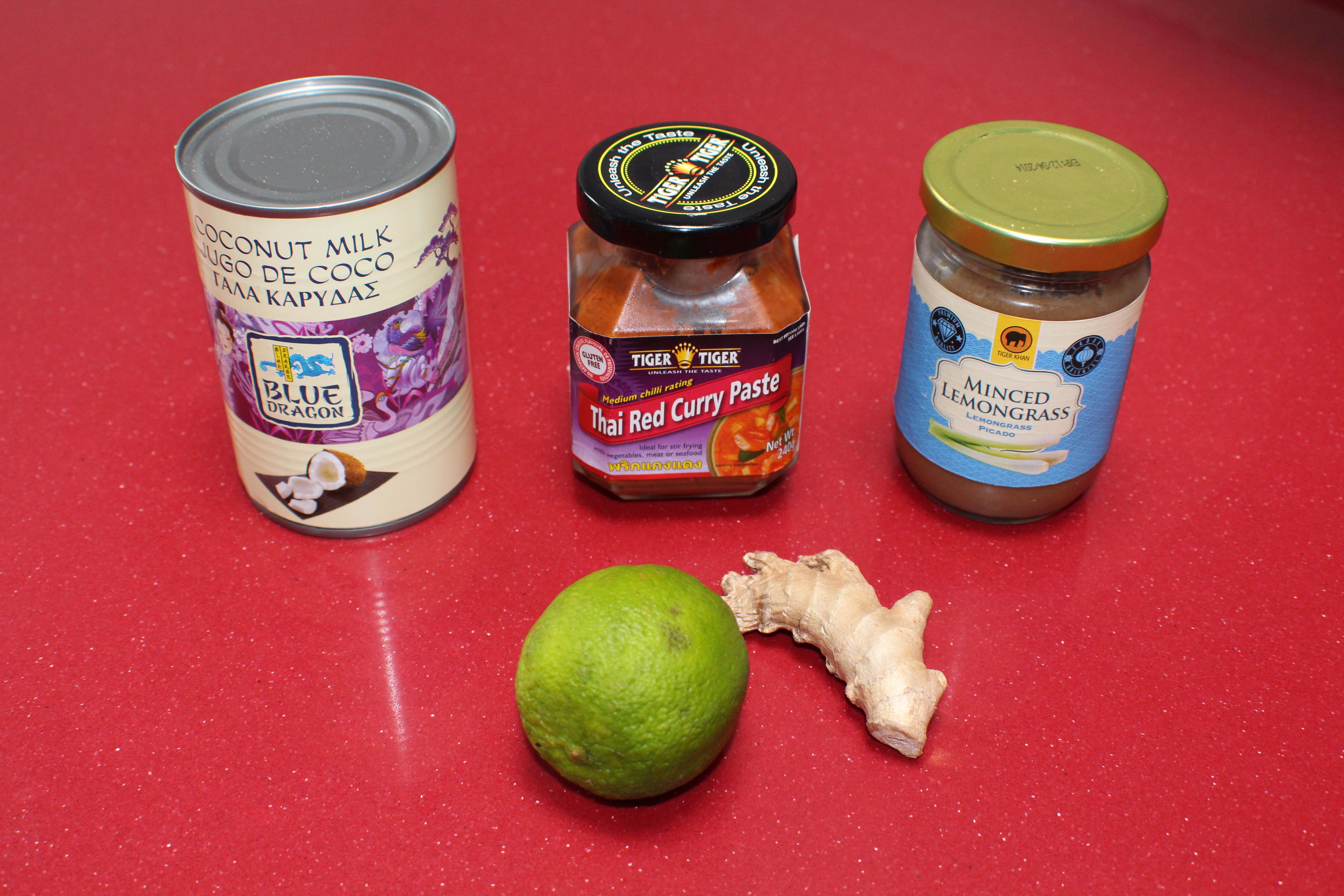 1 lomo de besugo, 200ml de leche de coco, 1 cucharada de pasta de curry rojo, 1 cucharada de lemongrass, 1 cucharada de jengibre natural rallado, 1/2 lima en zumo, 1 chile thai, cilantro picado, arroz jazmín, 1/2 mango, y una cucharadita de cafe de Maizena.