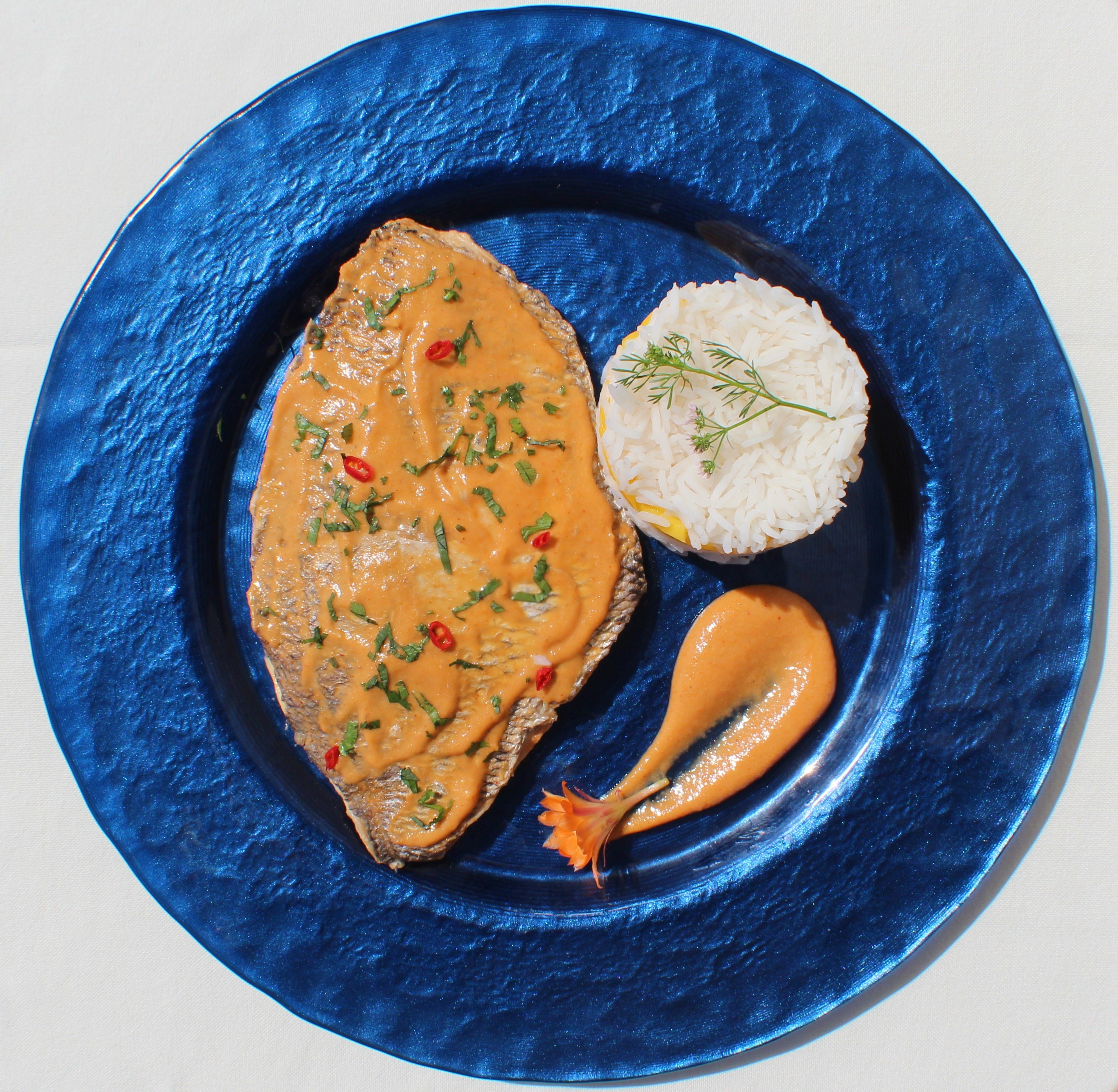Emplatamos el besugo y salseamos, esparcemos un poco de cilantro y chile y decoramos con una rama de cilantro en flor encima del arroz y una mimética flor de cactus no comestible.