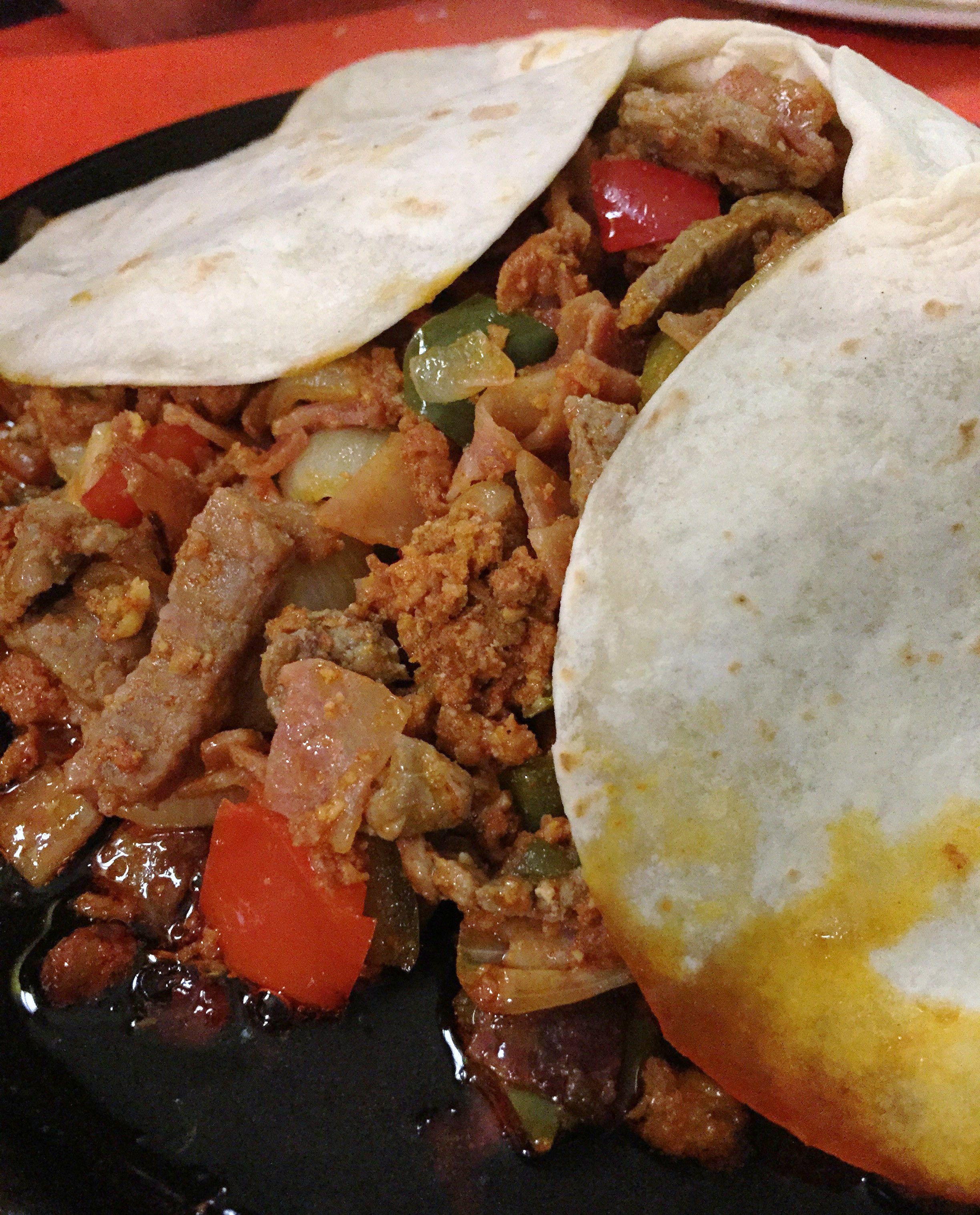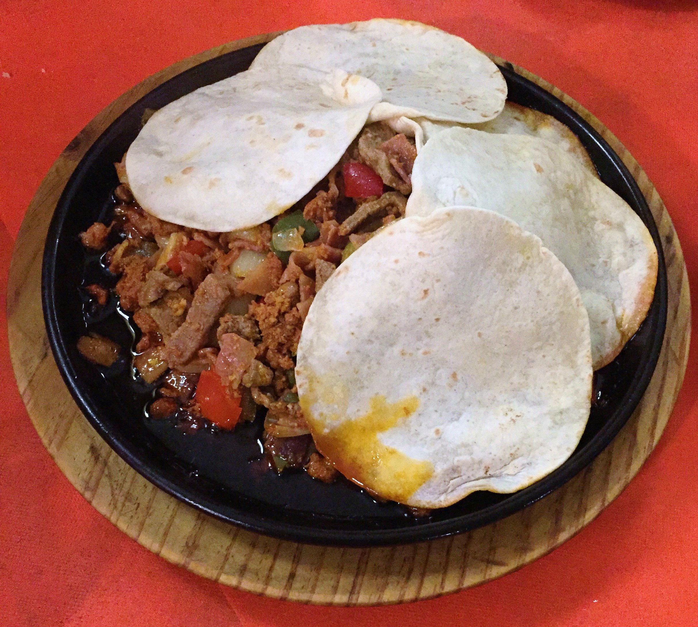 Llega el plato fuerte, una parrilla Jalisco que se compone de tiras de carne, cebolla, pimiento, picadillo, bacon y jamon. Se acompaña de unas tortillas para ir haciendo nuestros propios tacos a los que agregaremos la salsa picante que nuestro cuerpo aguante.