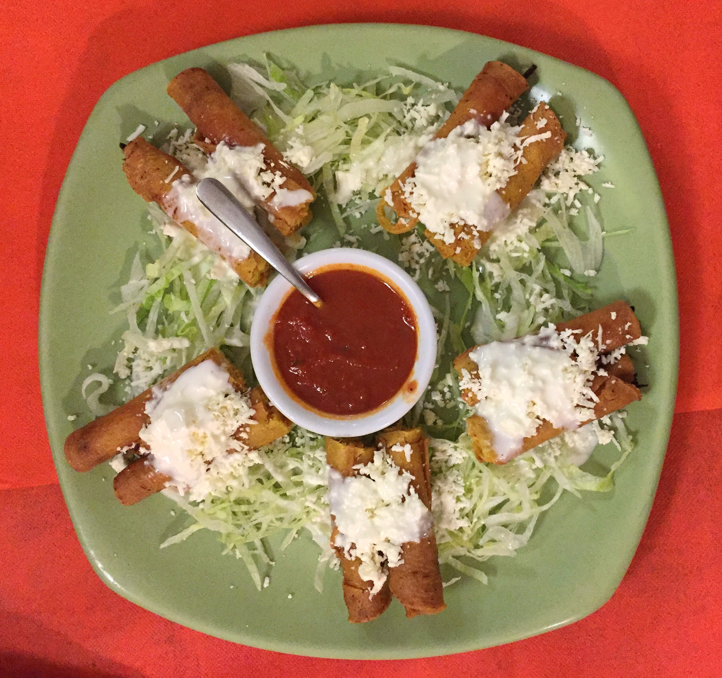 Continuaremos con unas flautas, es decir, tortillas de maíz rellenas de pollo, con queso, nata y lechuga.