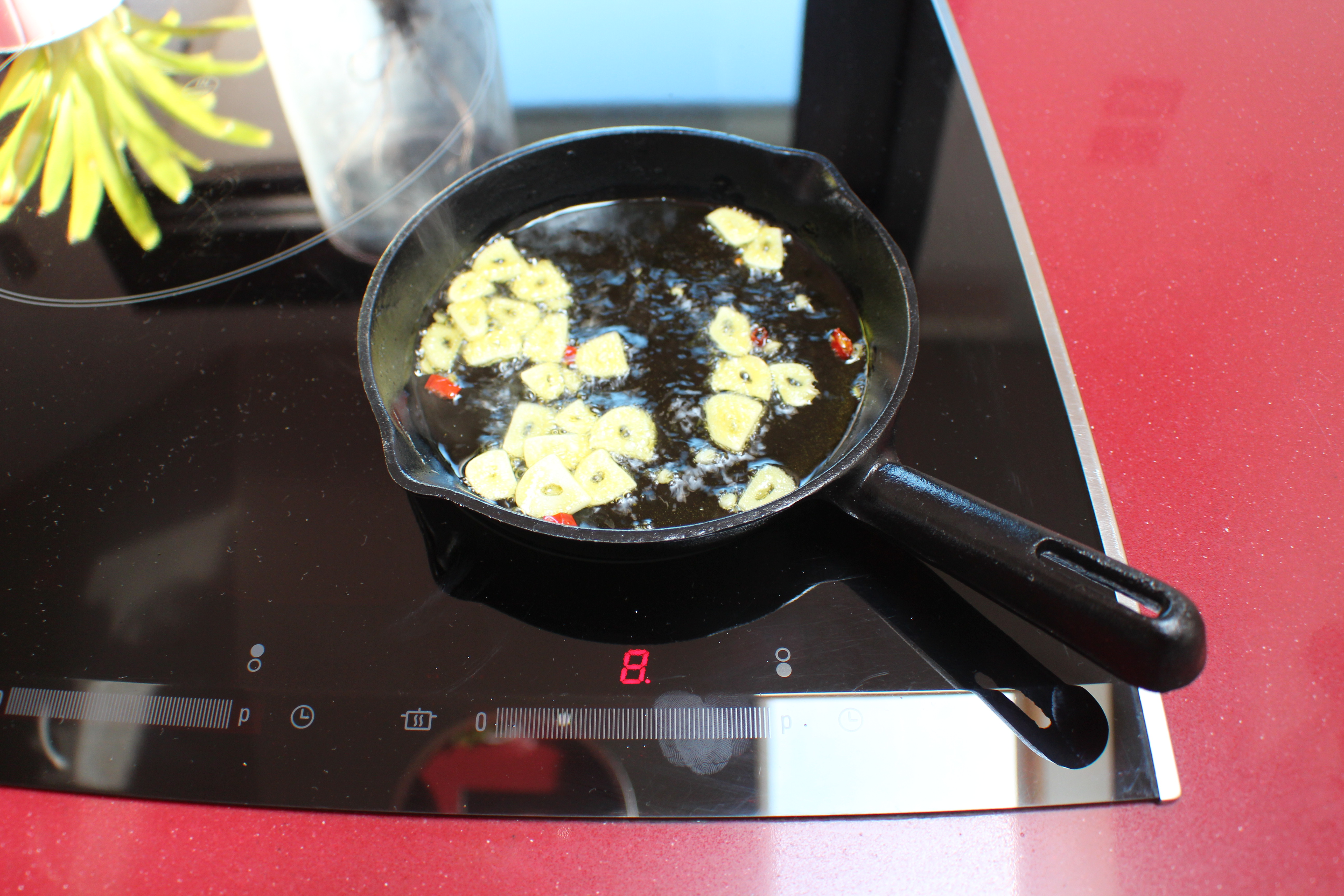 Es habitual utilizar un poco de vinagre para saborizar nuestro sofrito pero a mi se me ocurrió darle un toque diferente con un chorrito de Mirin, una clase de vino de arroz parecido al sake que aporta un ligero sabor dulce. El contraste con el picante y la fuerza del ajo nos aporta un equilibrio muy elegante.