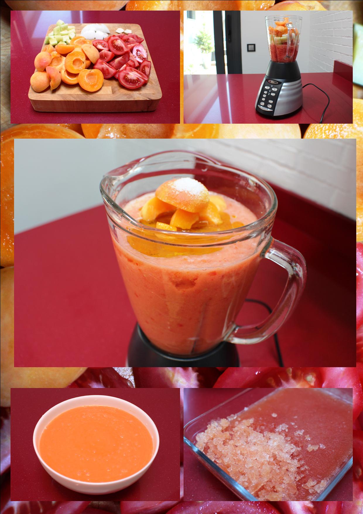 8 Albaricoques, 4 tomates maduros, 1/2 pepino, 1/2 cebolla, 1 diente de ajo, granizado de agua de tomate, aceite de oliva virgen extra, vinagre de vino y sal.