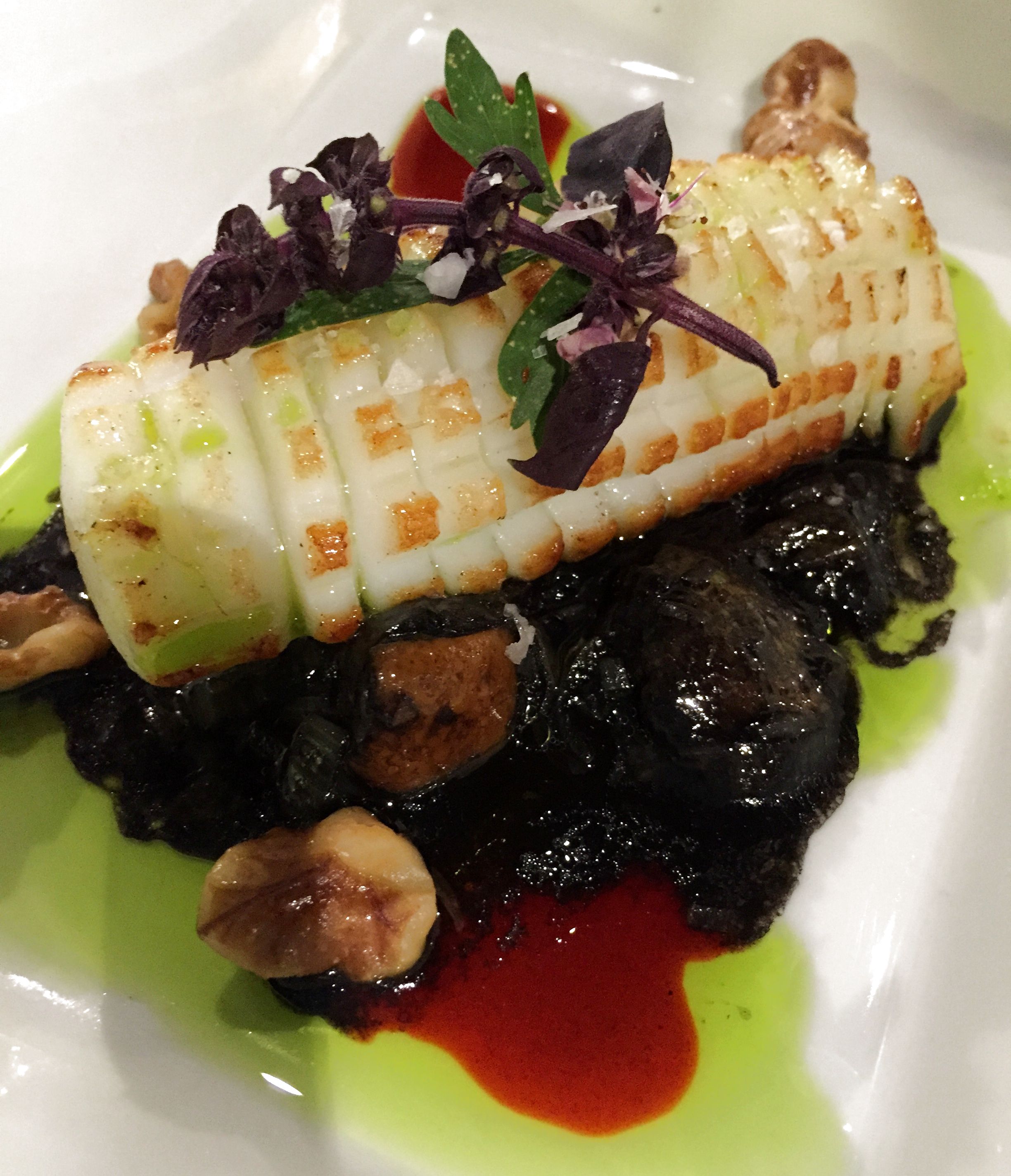 El calamar rizado, con hongos, sopa de su tinta y salteado de nueces y ajetes. Le faltaba un pelín más de plancha pero al igual que el pulpo y sepia, los cefalópodos me gustan al punto de tener que masticar, lo blandengue me resulta abominable.
