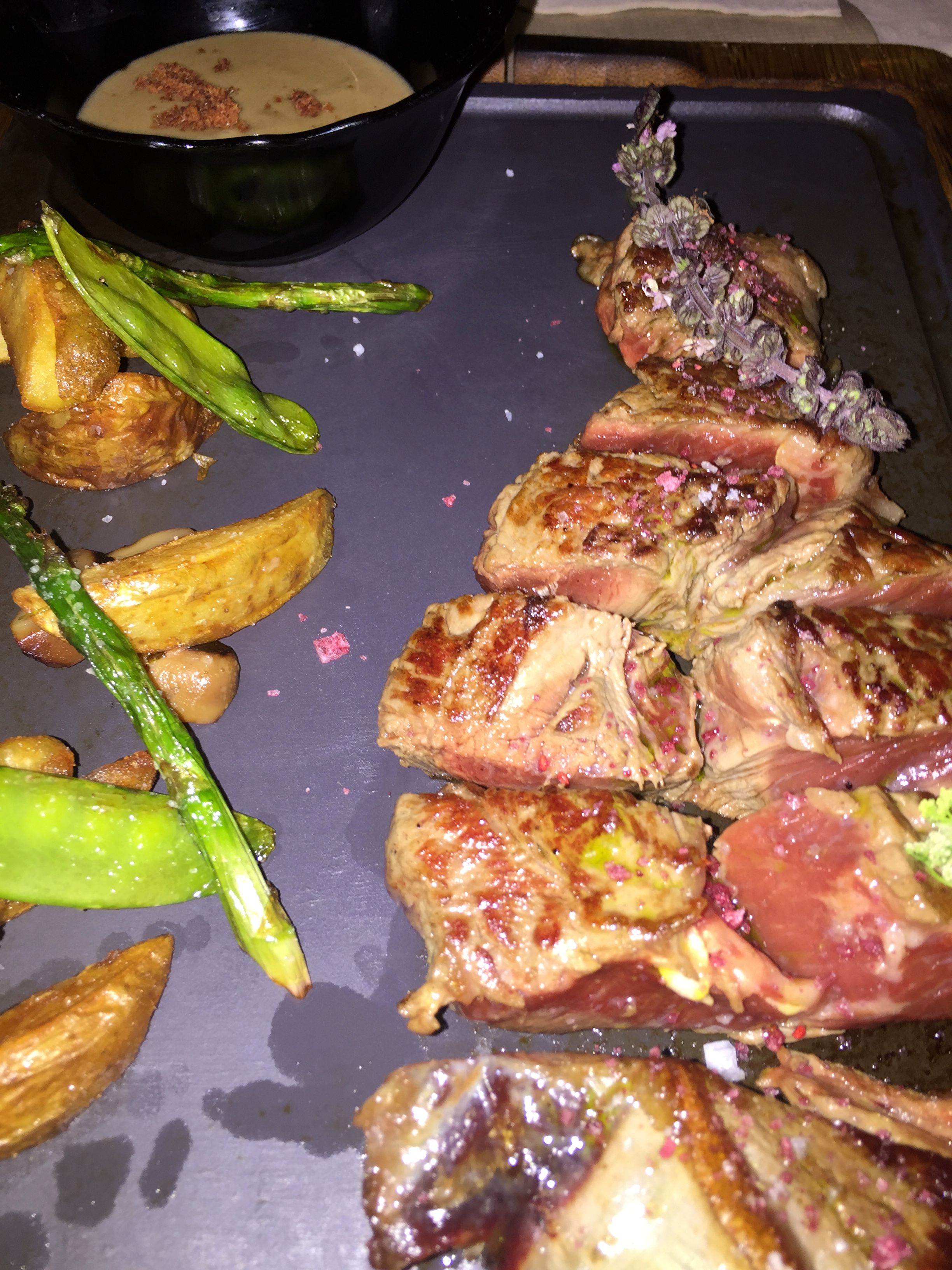 Cerramos el grueso del amplio menú con una chuleta trinchada de ternera con D.O. Extremadura. Definitivamente tenía un sabor diferente, más fuerte, comparada con una ternera gallega por poner un ejemplo, creo recordar que se trataba de berrenda. Dependiendo del trozo había partes más firmes (que no duras) y otras más tiernas.