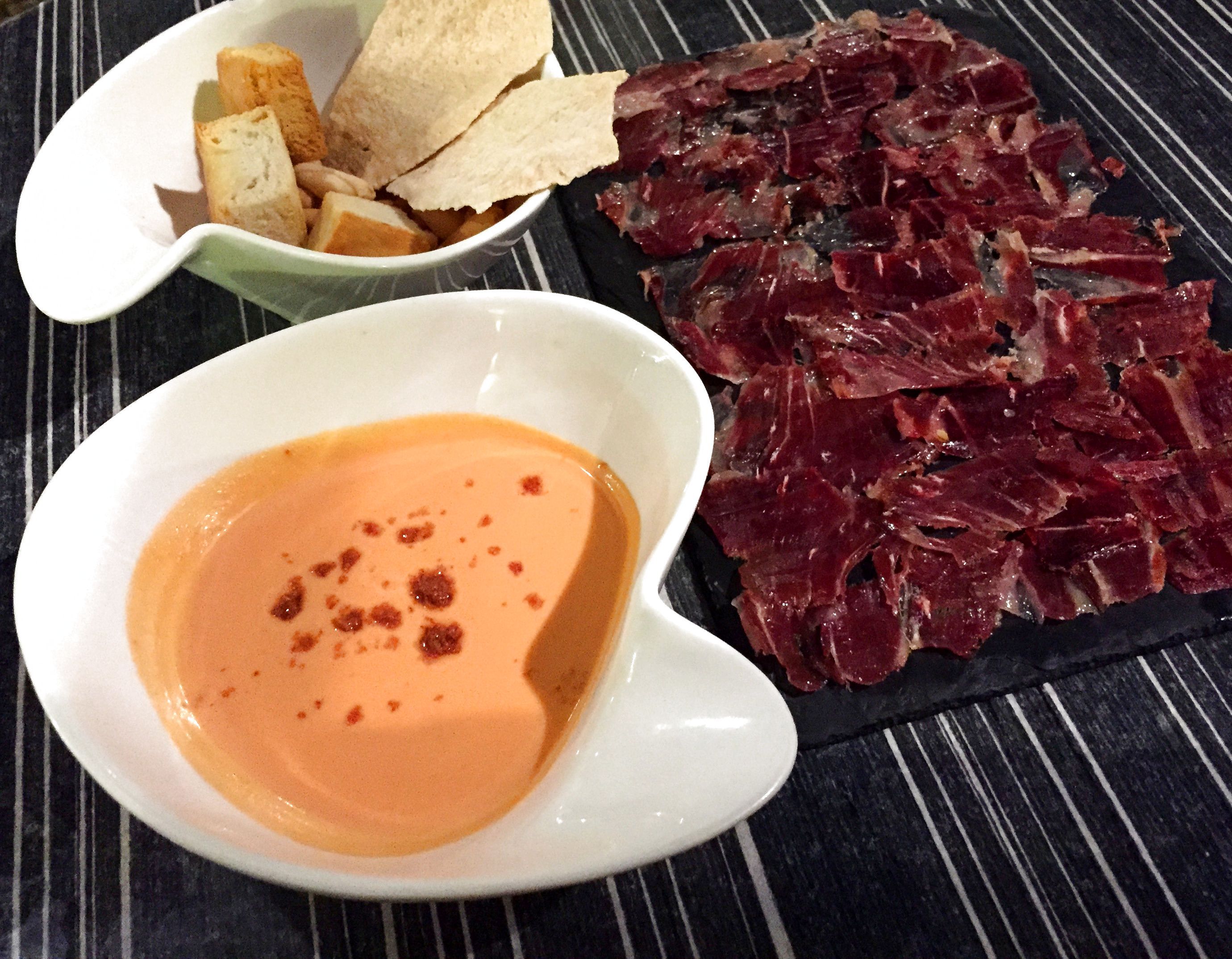 Extremadura es buena tierra de jamones, así que no pudo faltar una ración de jamón ibérico de bellota con tostitas de chapata, aceite de oliva, sal en escamas y salmorejo para untar. Delicioso y con ese calor ambiente sudado a la perfección.