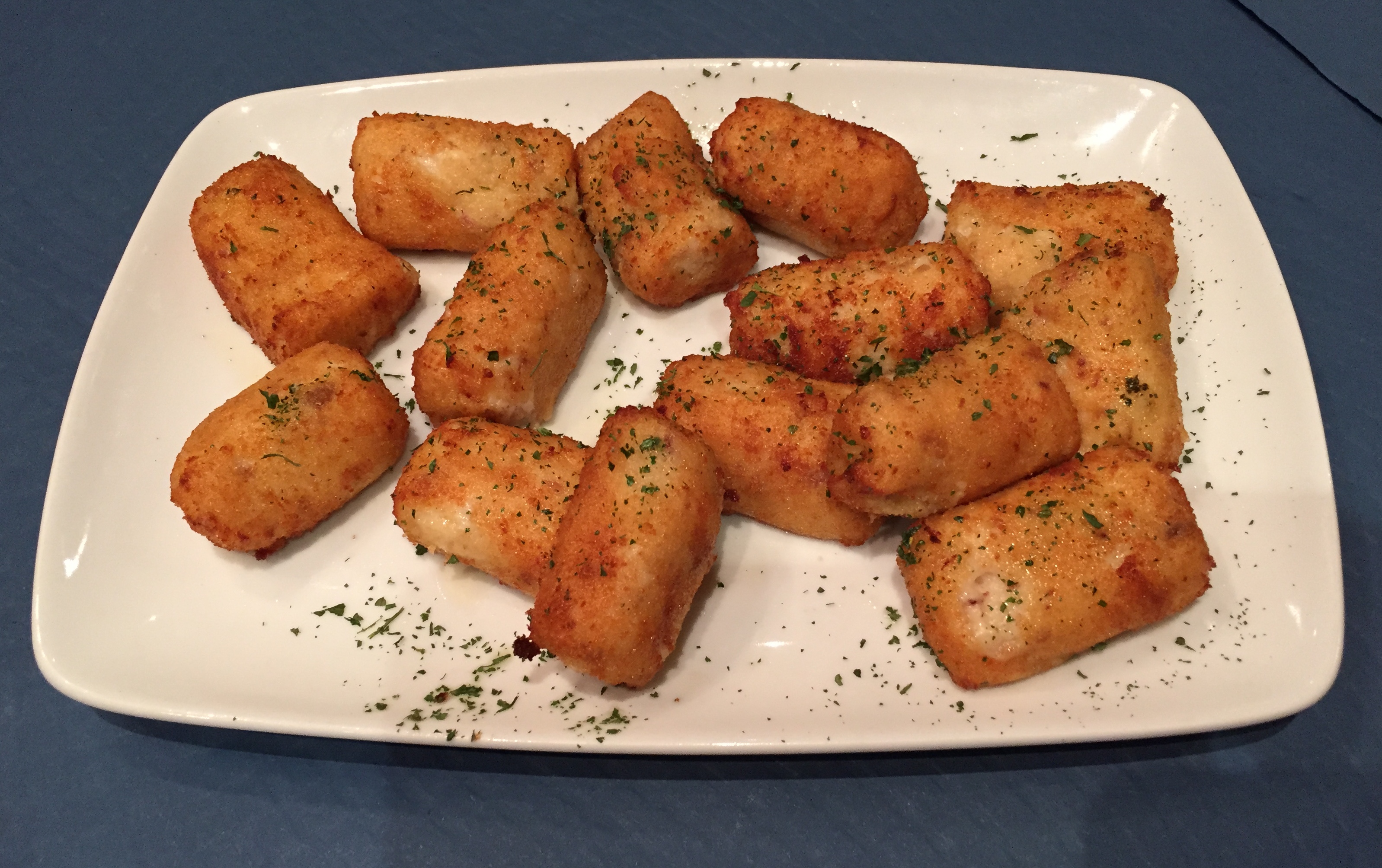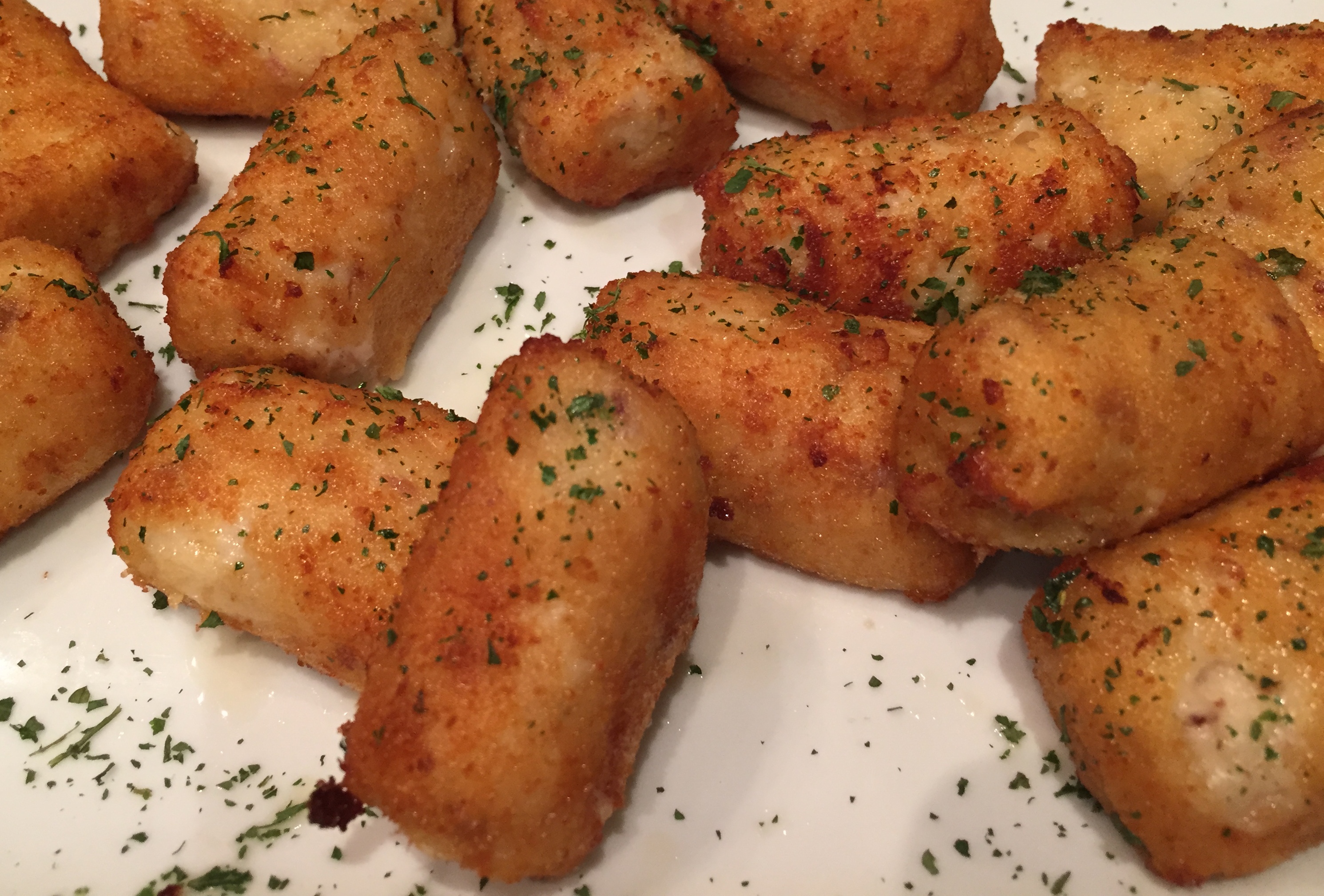 Tacos de solomillo que acompañan con una salsa de queso y patatas.