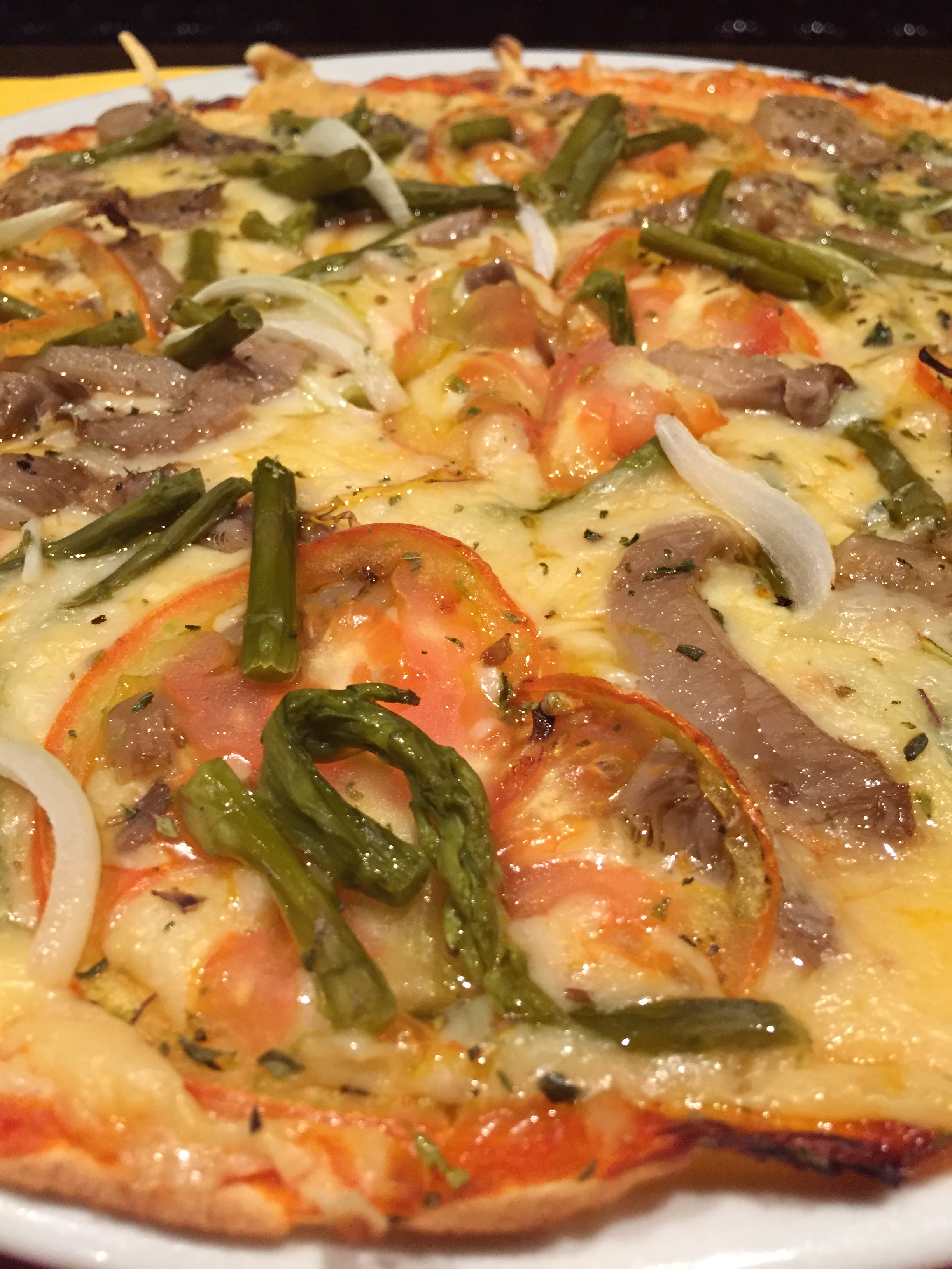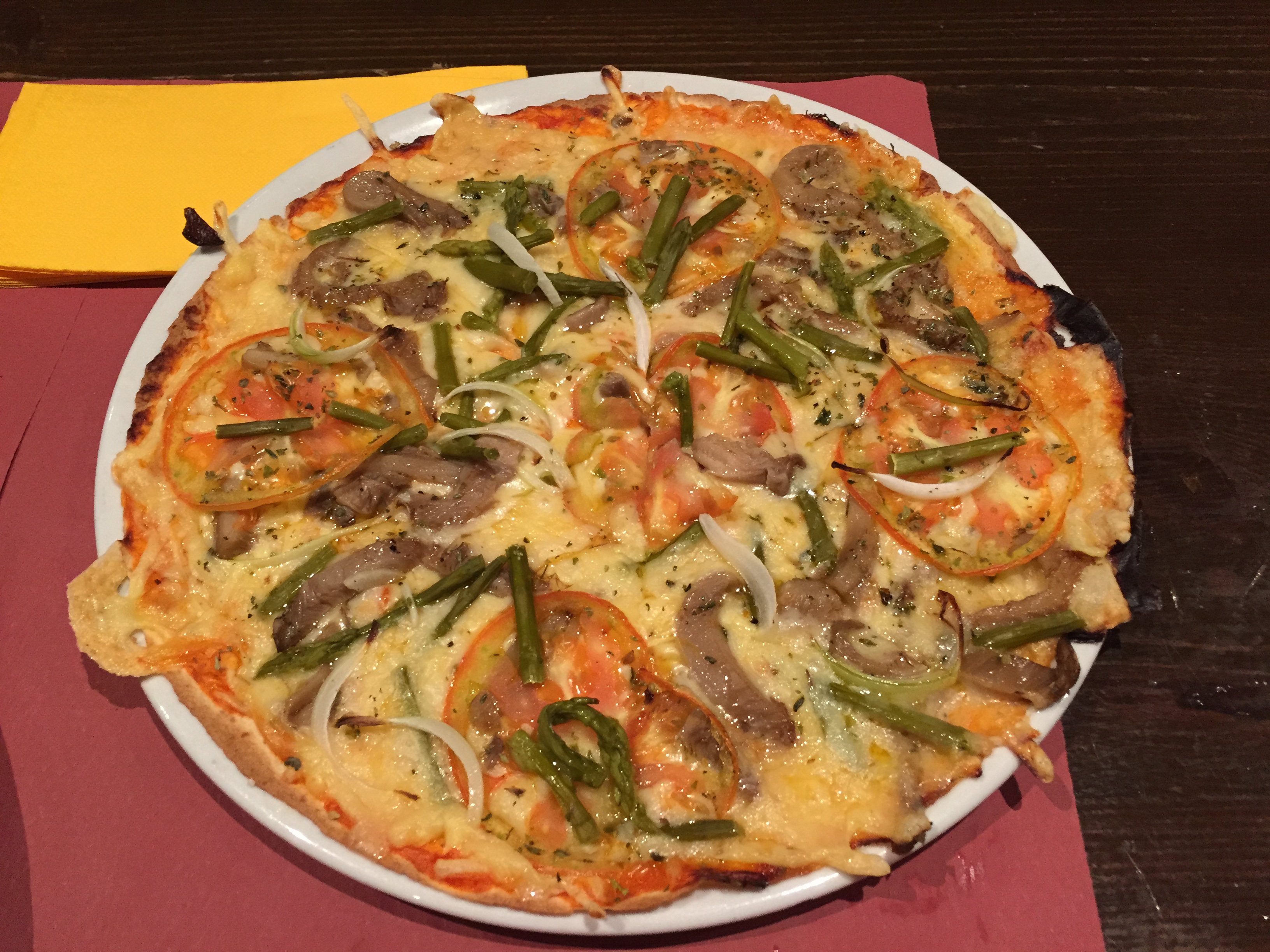 Pizza vegetal: setas, cebolla, tomate, trigueros y pimiento.
