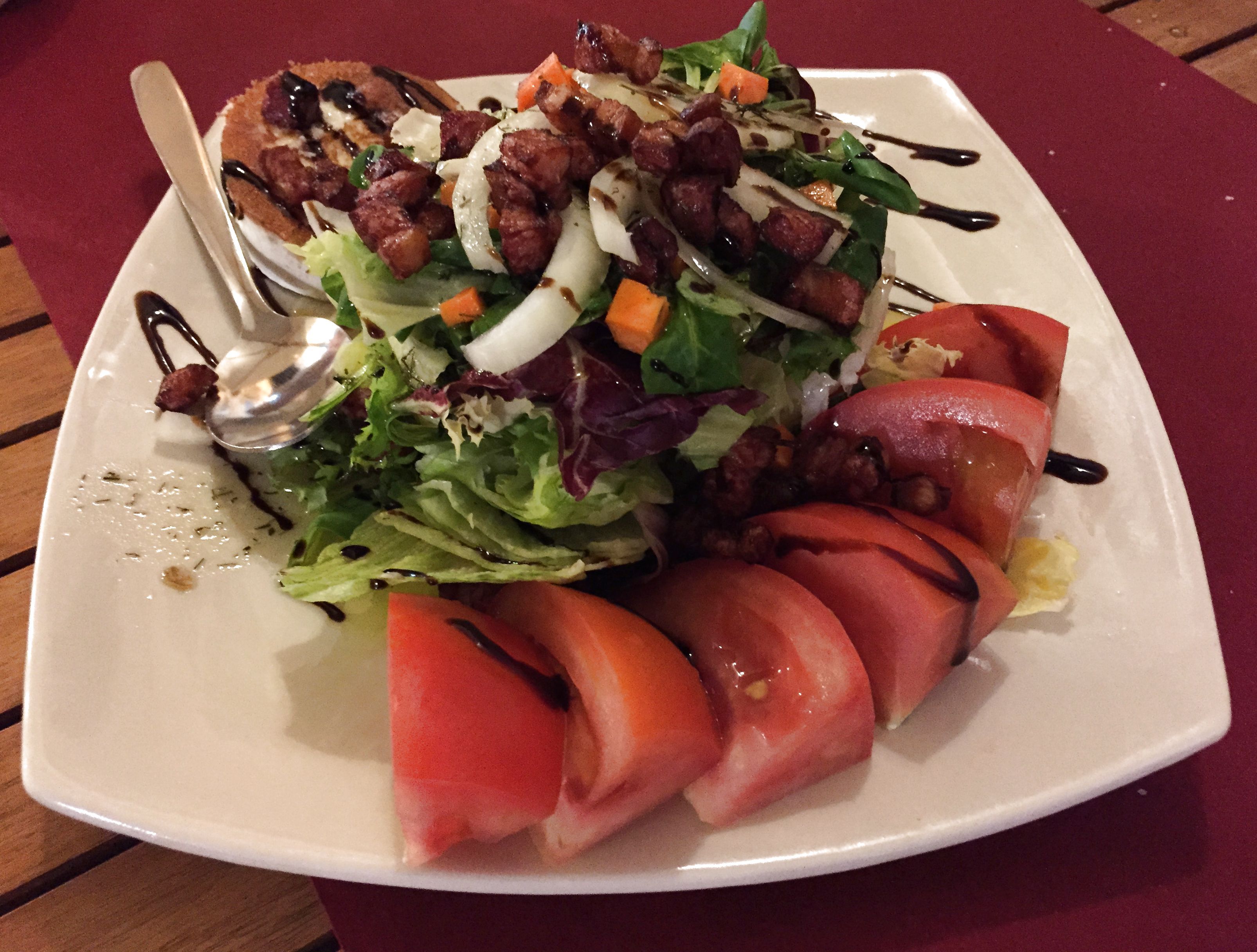 Nuestra primera elección fue una ensalada templada con taquitos de bacon tostado y queso de cabra al grill en vinagreta de eneldo y miel. Correcta sin ser la quinta esencia de las ensaladas.