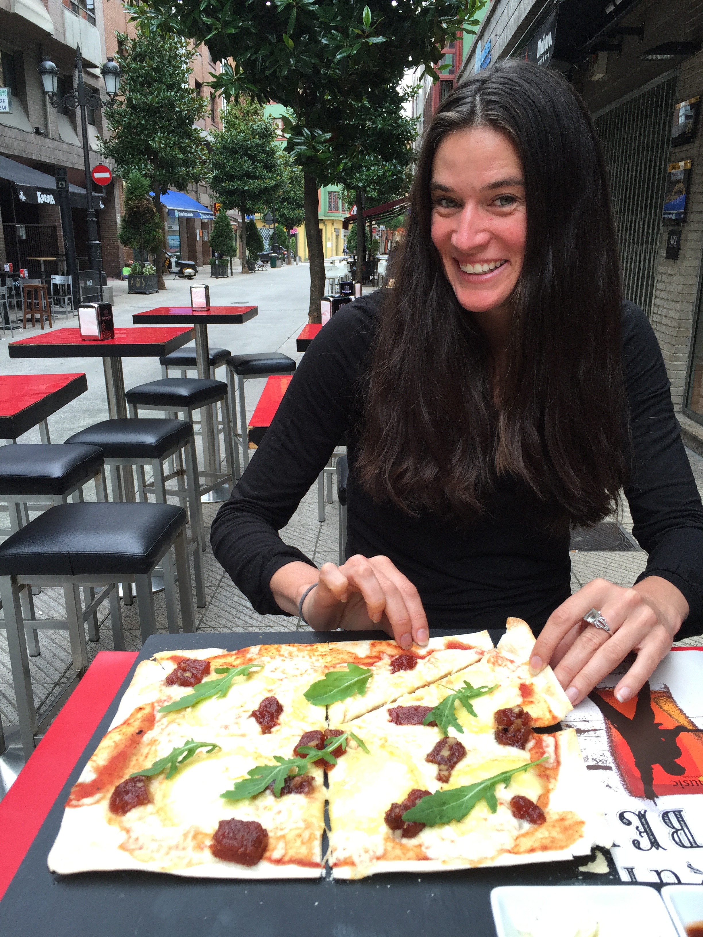 Turno de la pizza de queso afuega’l pitu Rey Silo con membrillo y nueces. Sobre una masa muy fina esta combinación es sobresaliente, fue la elección de Collette que en un principio se extraño por esa mezcla con dulce. Le encantó y creo que se le han abierto nuevos horizontes en su mundo vegetariano, aunque no creo que vuelva a probar nada como esto porque el Rey Silo es único, el mejor queso afuega´l pitu de Asturias.