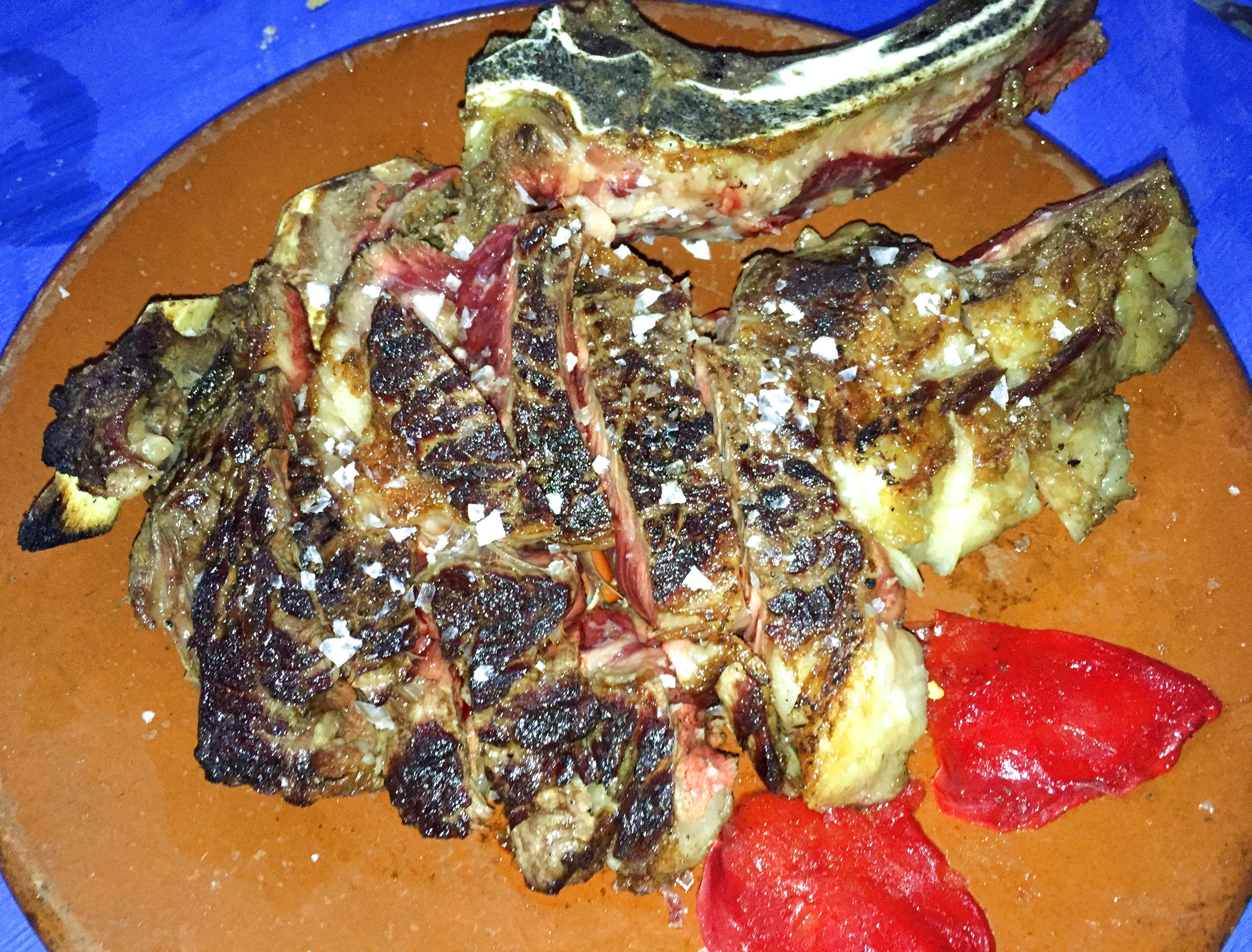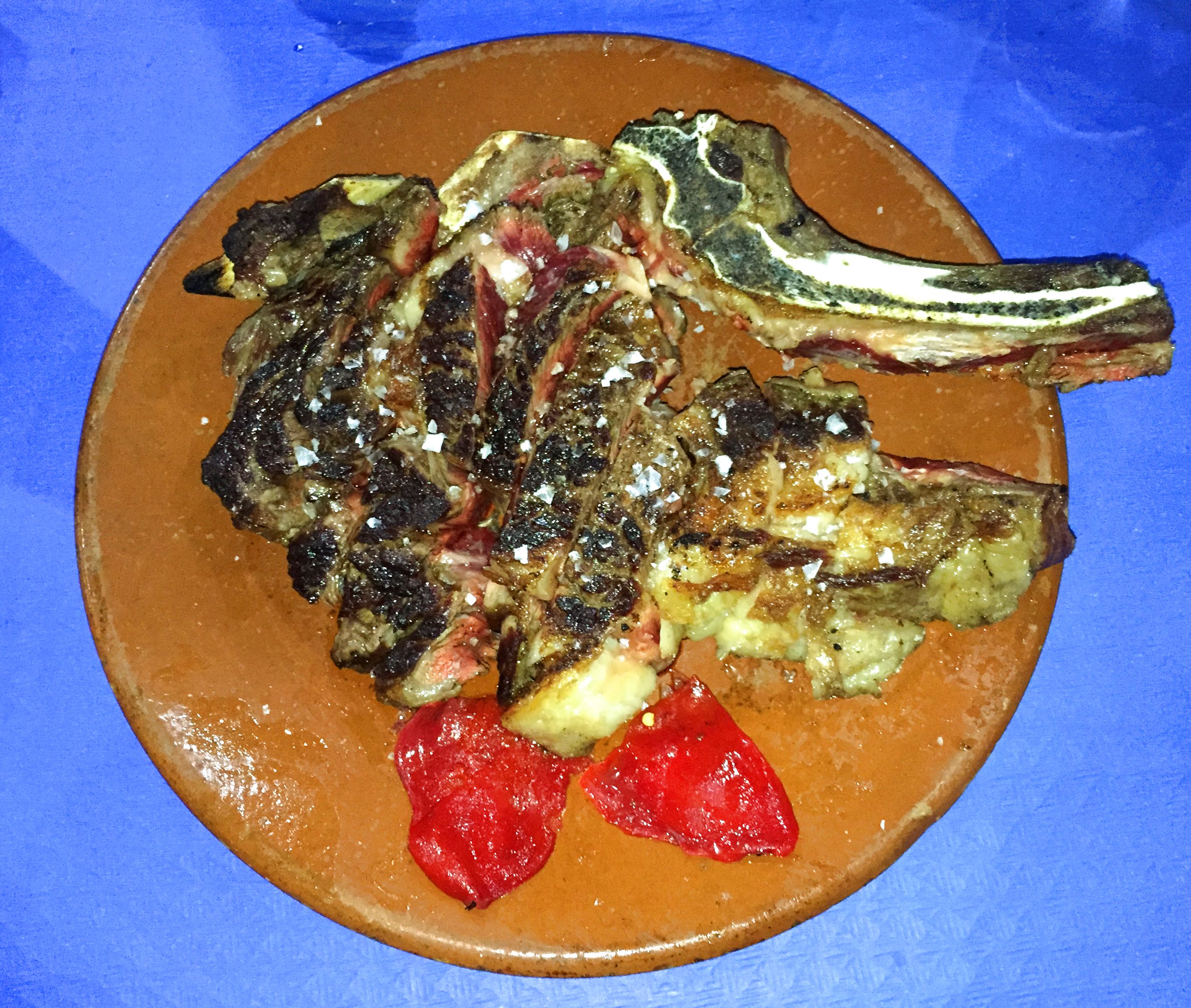 De plato fuerte estos dos hermosos chuletones de buey. Dos piezas de lomo alto al que supieron dar un punto perfecto en la parrilla.