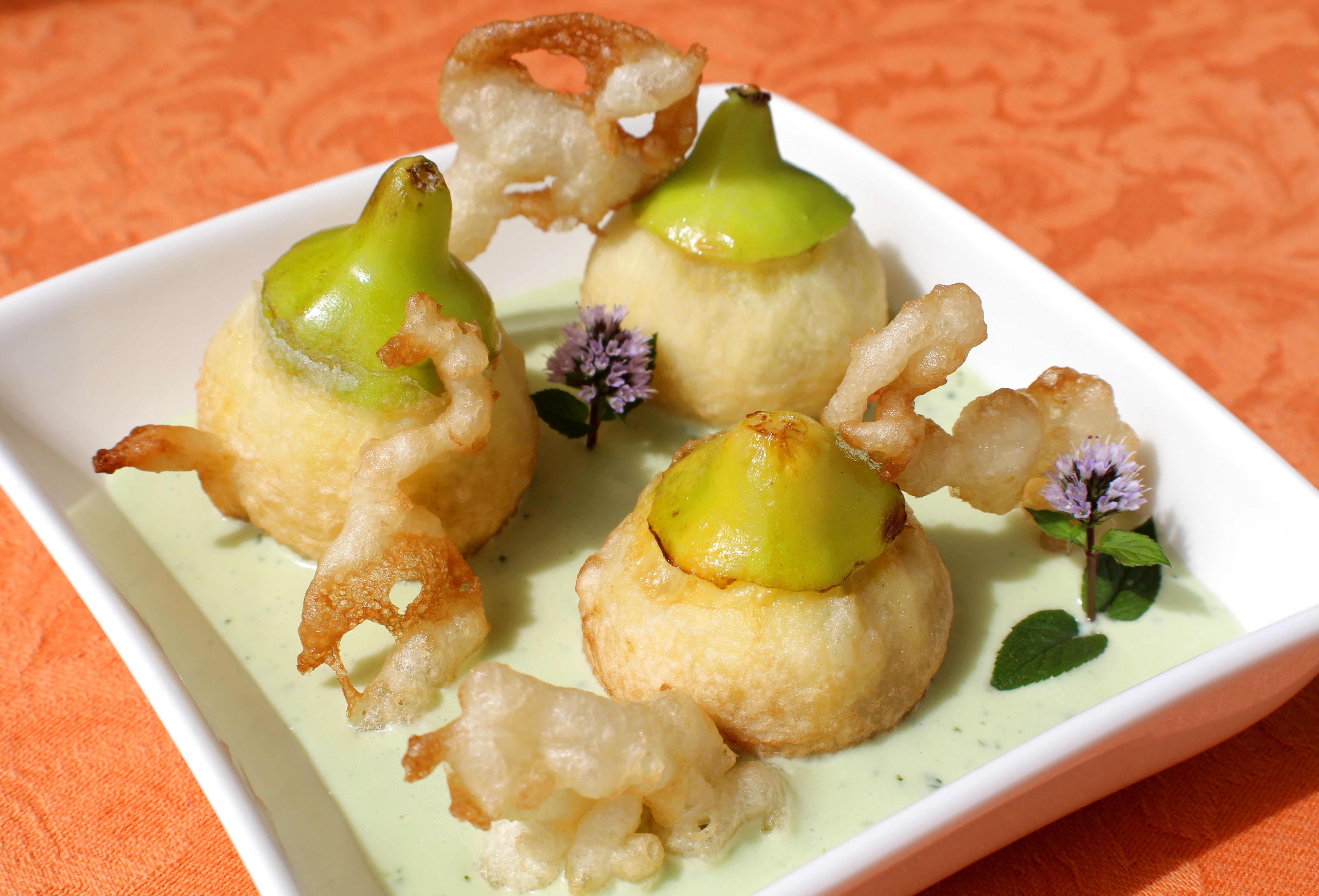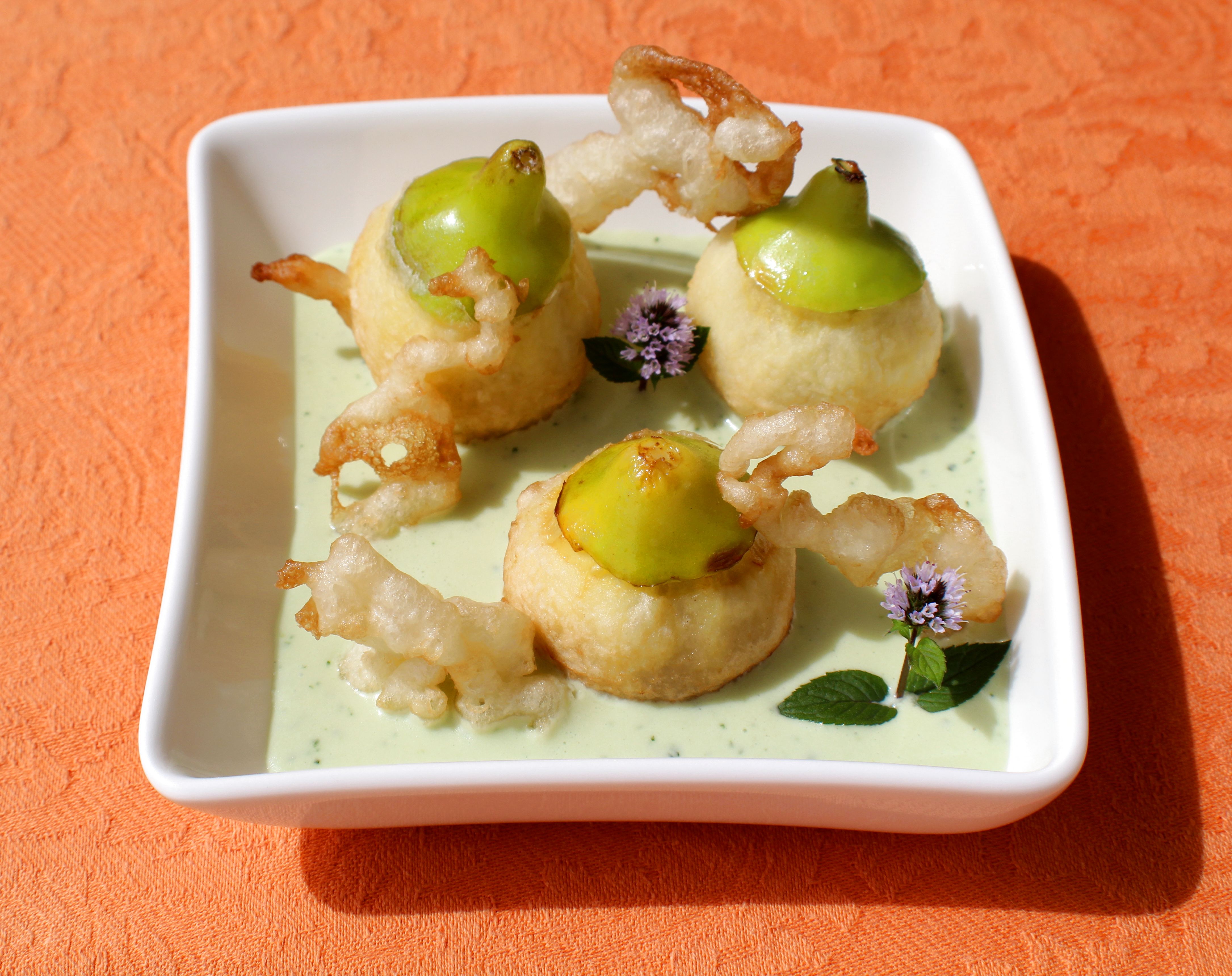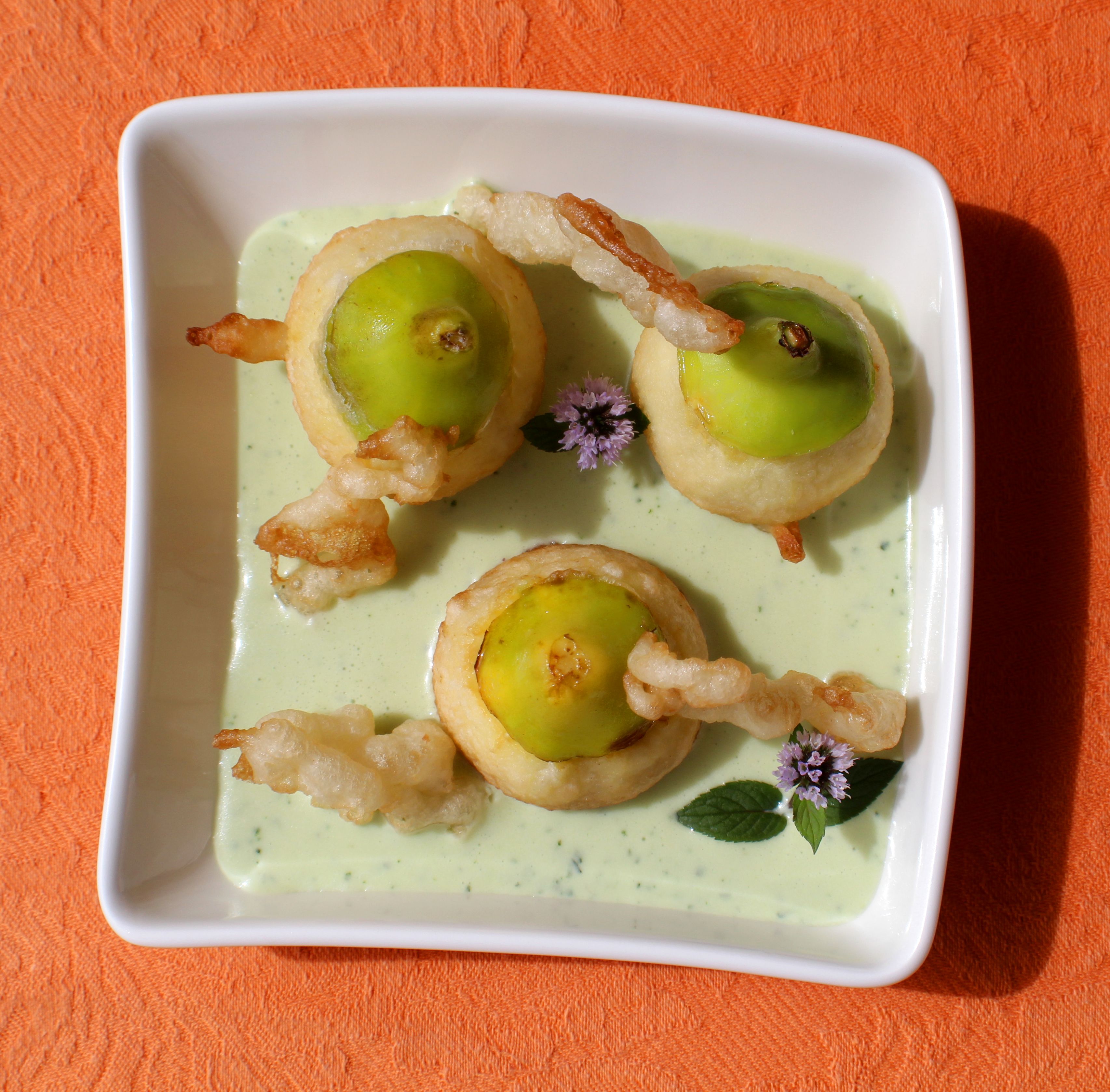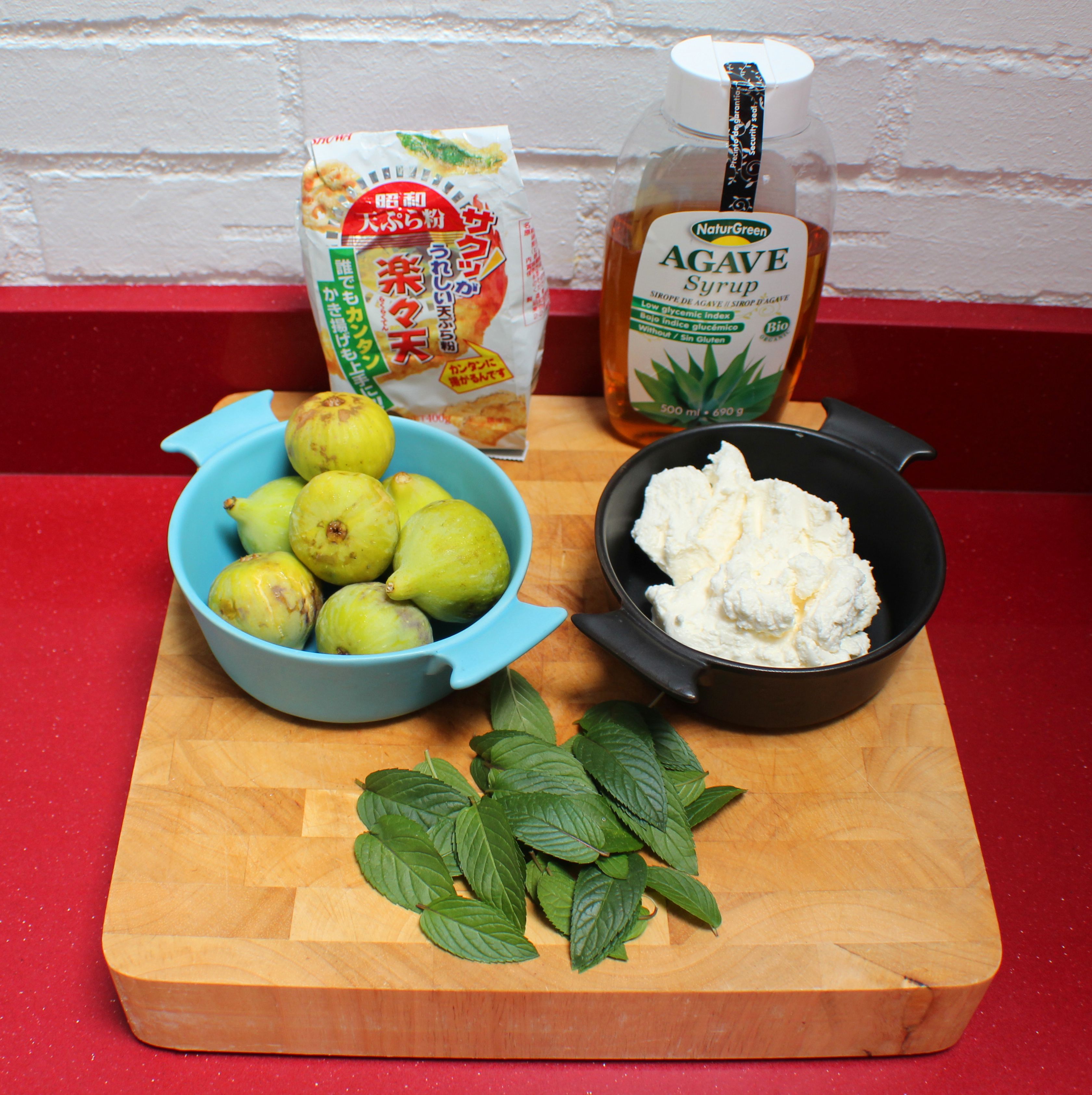 Higos, harina de tempura, requesón, sirope de agave, hojas de menta en abundancia y aceite de girasol
