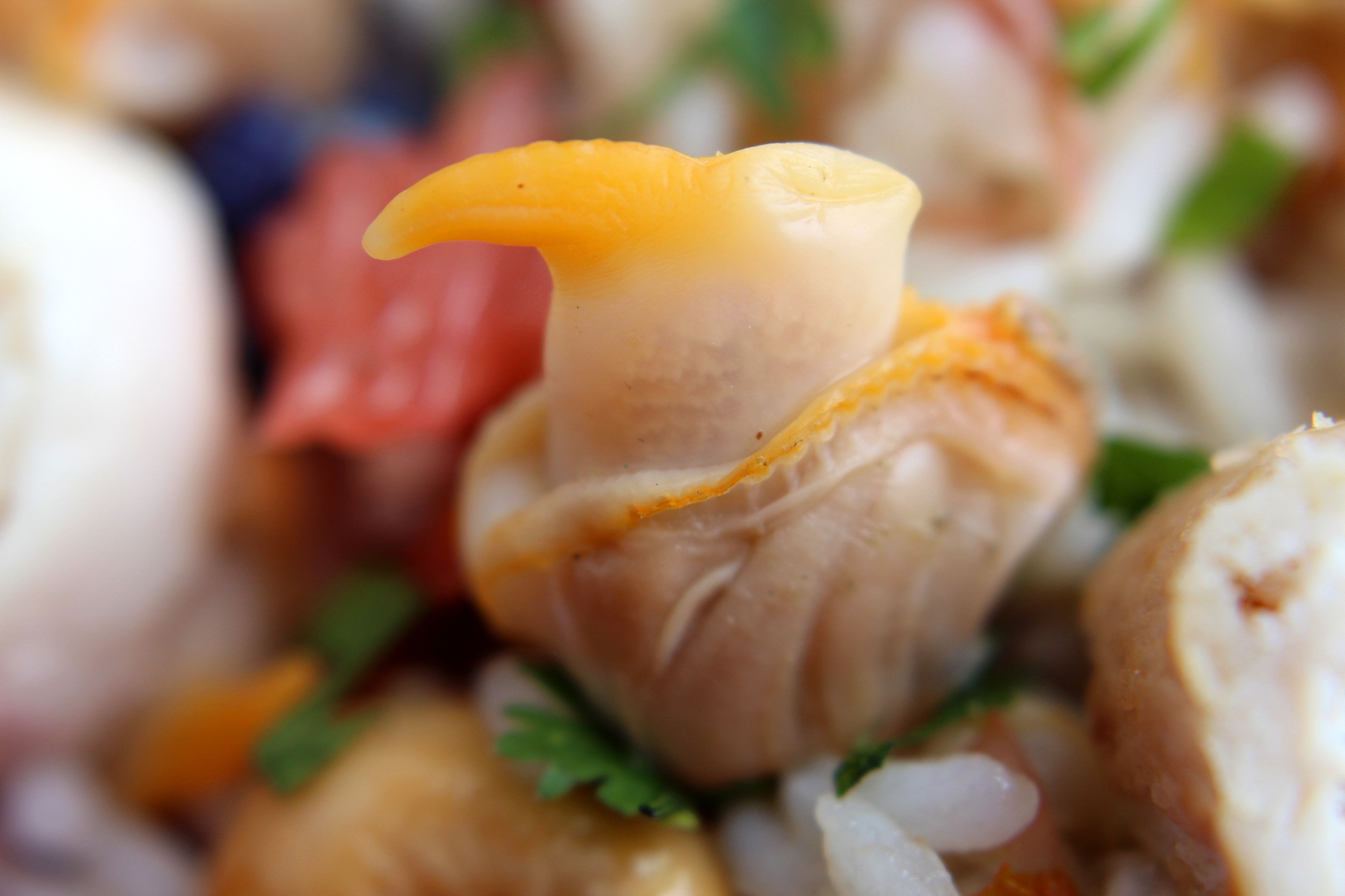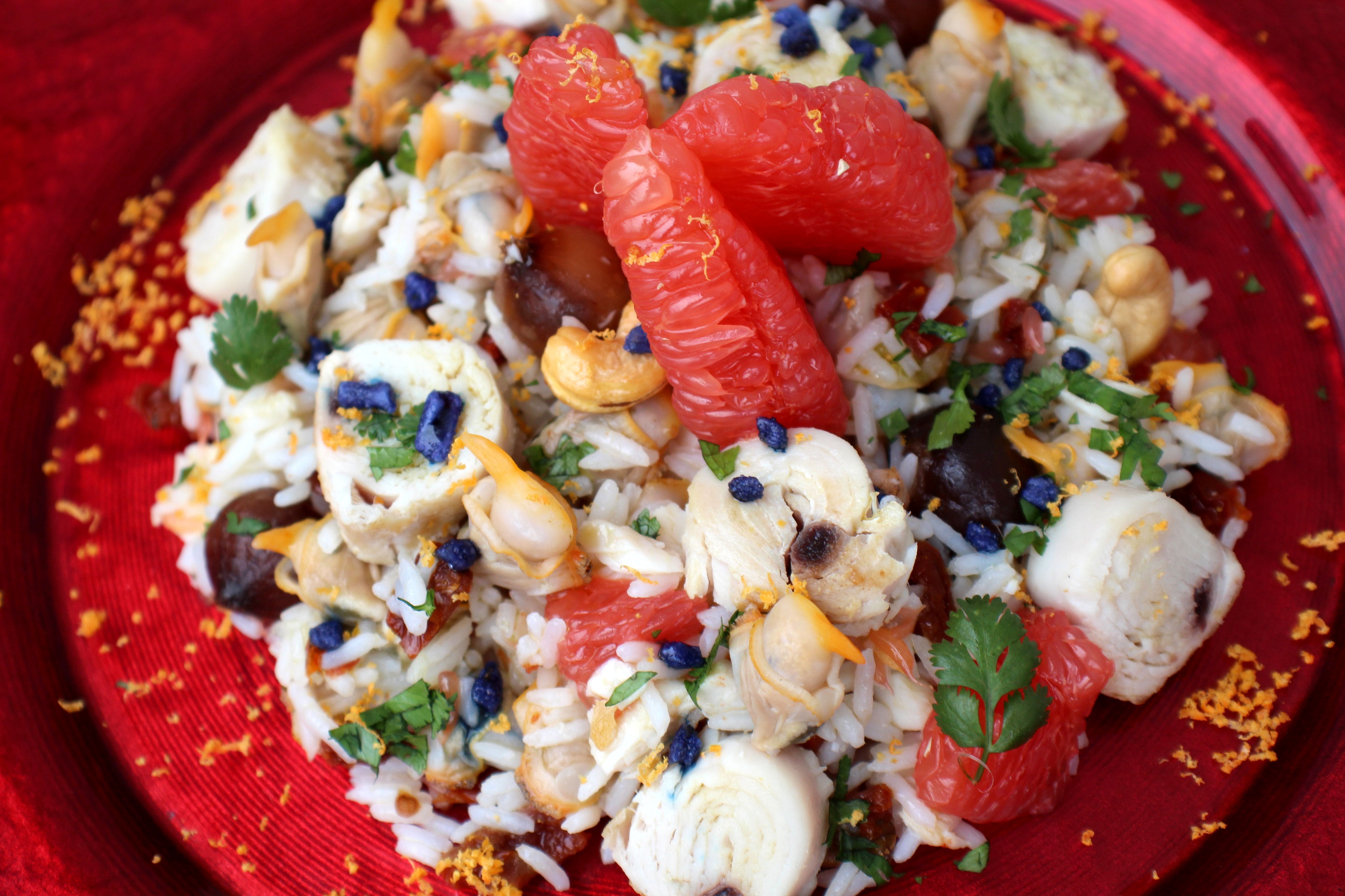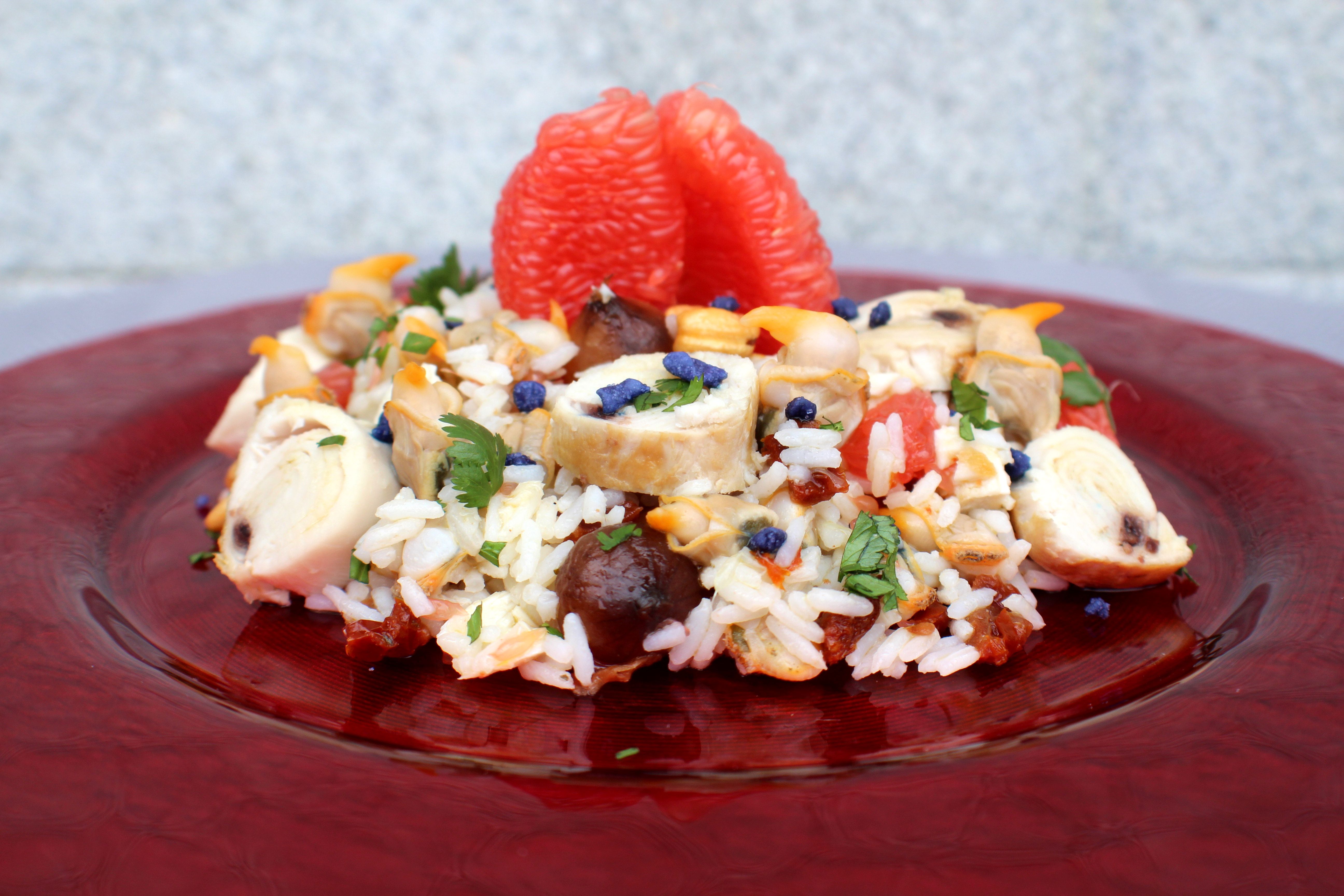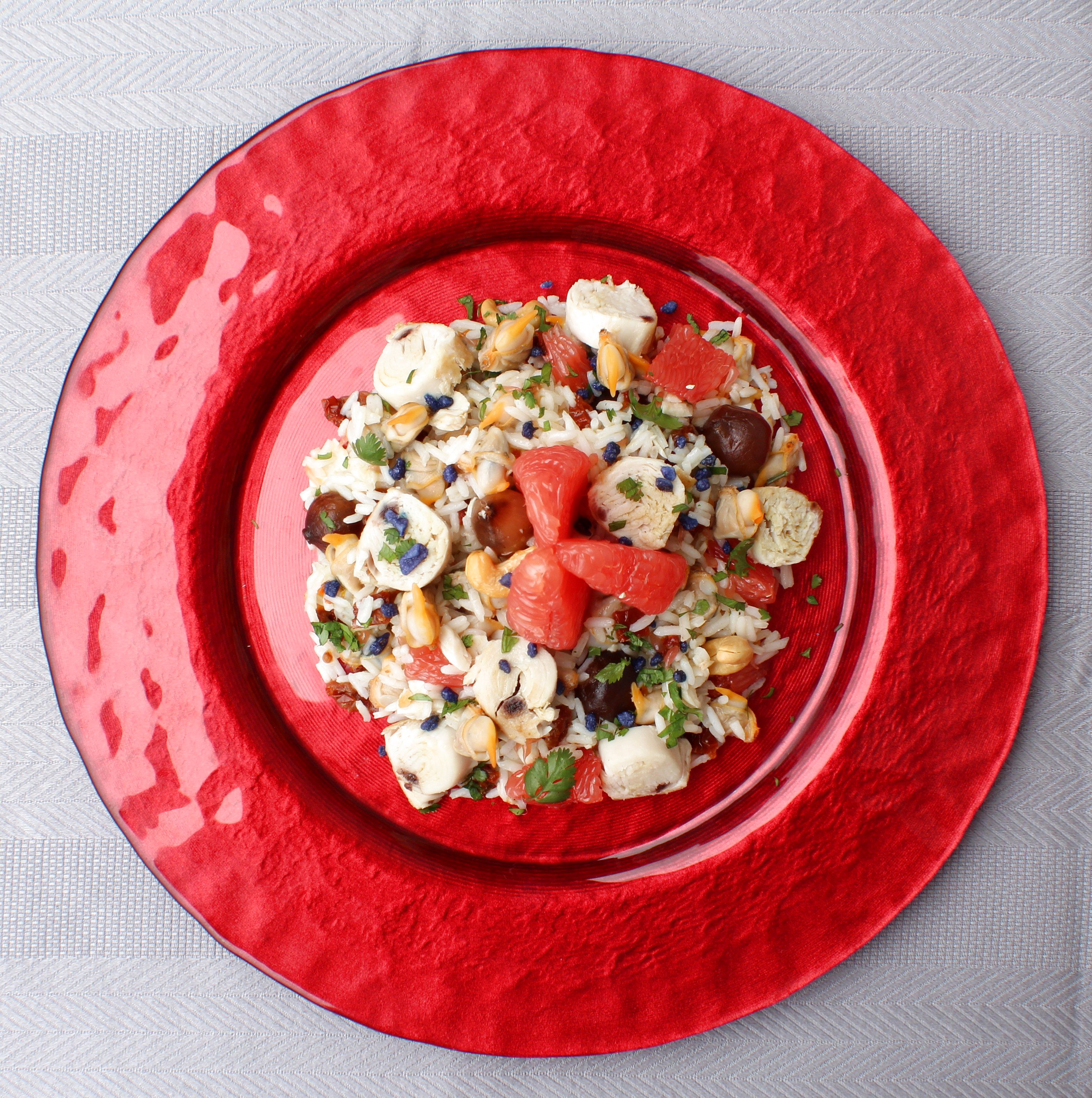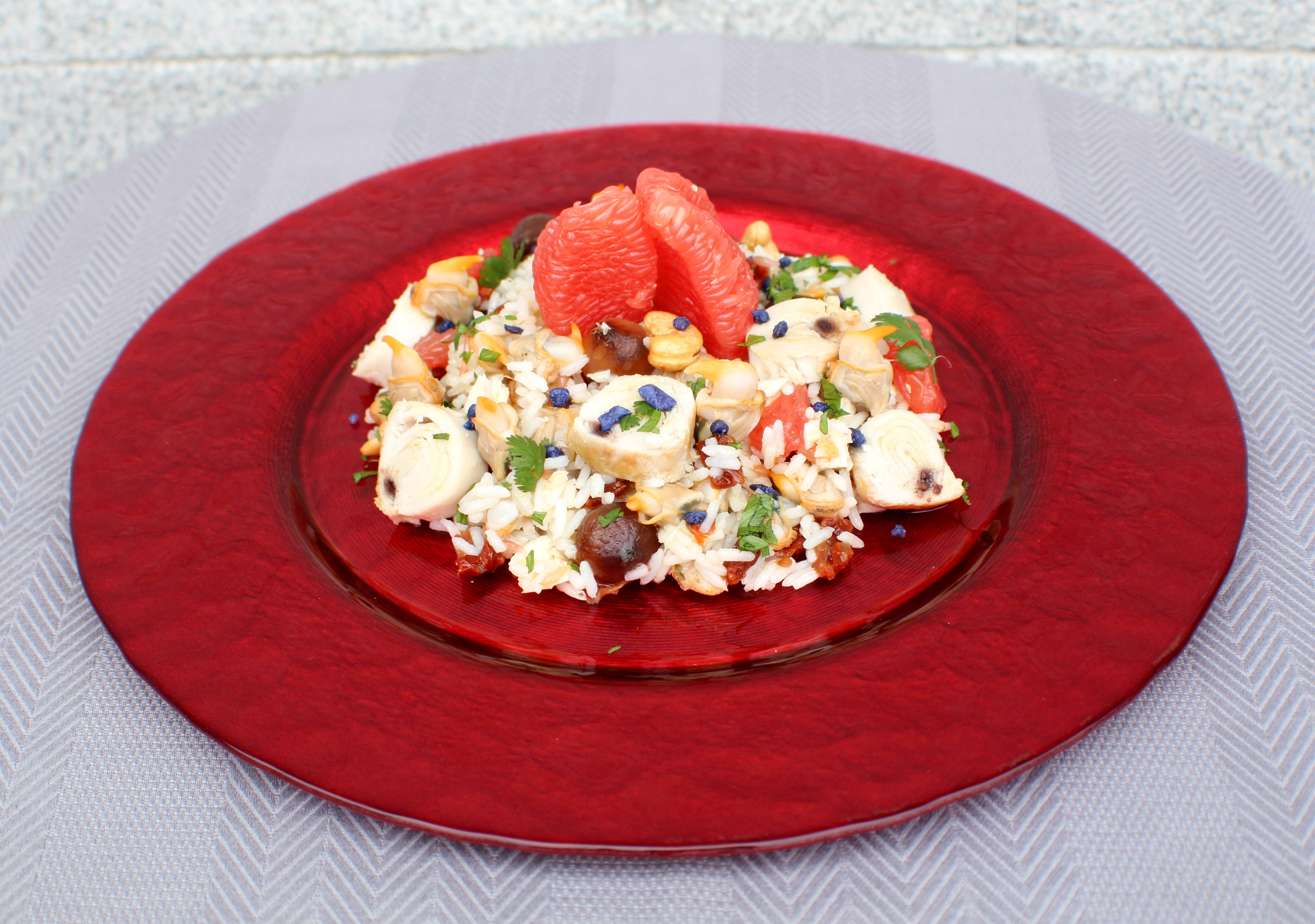 Arroz Jazmín, 1 pomelo, bonito del norte natural, berberechos, tomate seco en aceite, anacardos, violetas cristalizadas, cilantro, cebollitas encurtidas en balsámico, 1 lima, mirin, aceite de oliva virgen extra y sal.