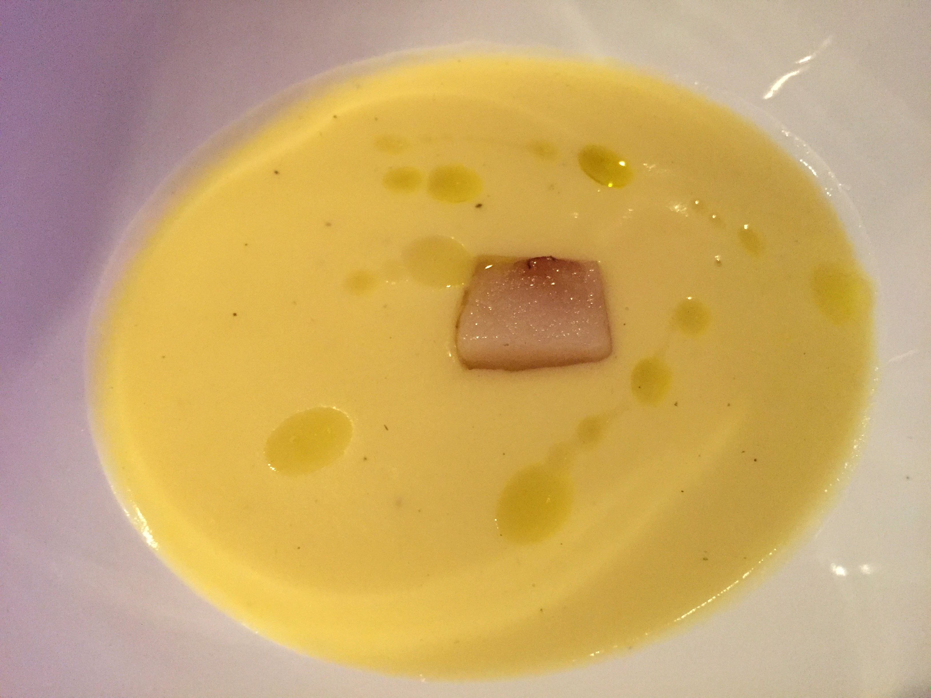 El aperitivo de la casa fue una deliciosa crema de calabacín con papada ibérica.