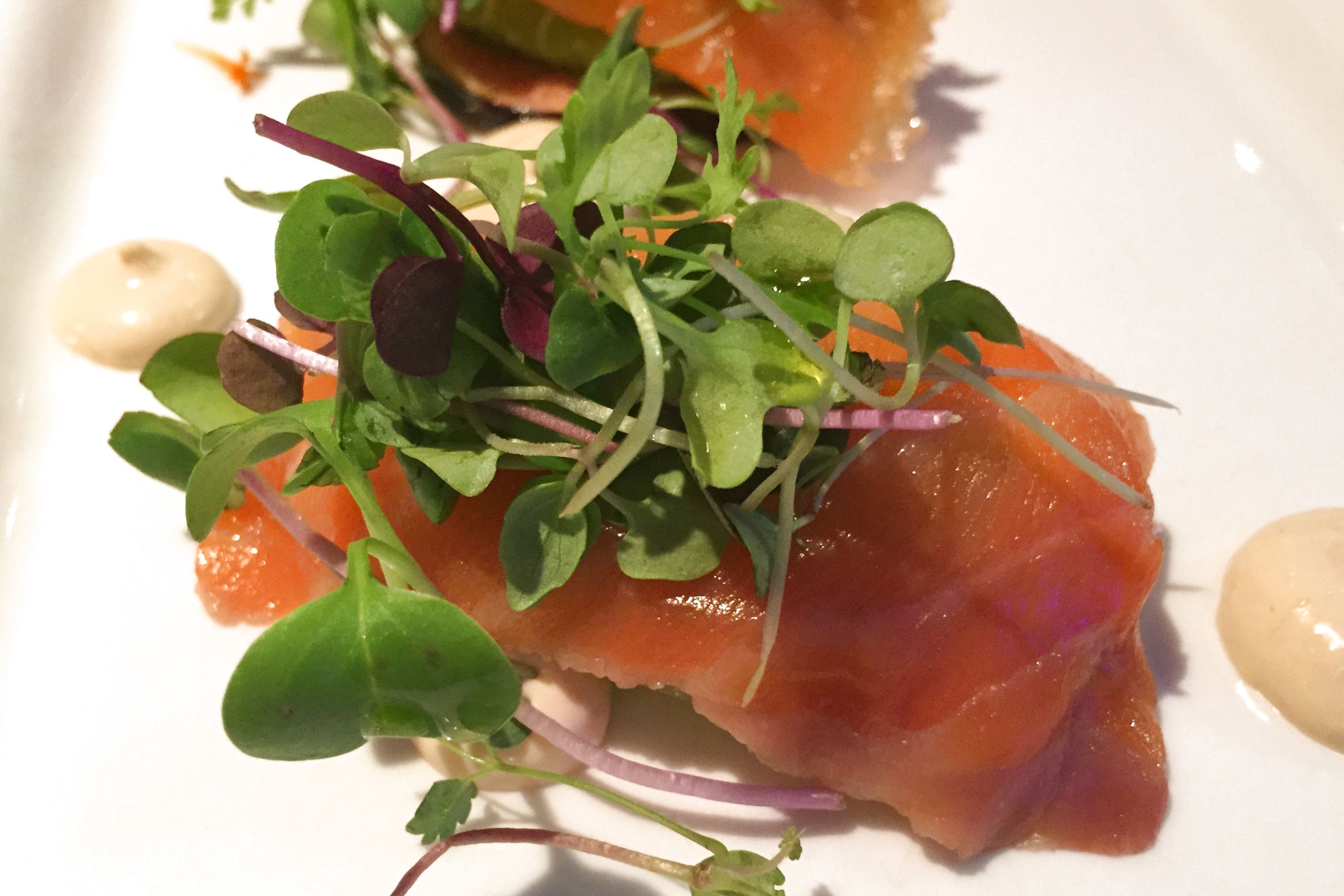 Por problemas de punto con el siguiente entrante y ante la demora tuvieron el detalle de traernos este plato a base de berenjena, guacamole y salmón ahumado.