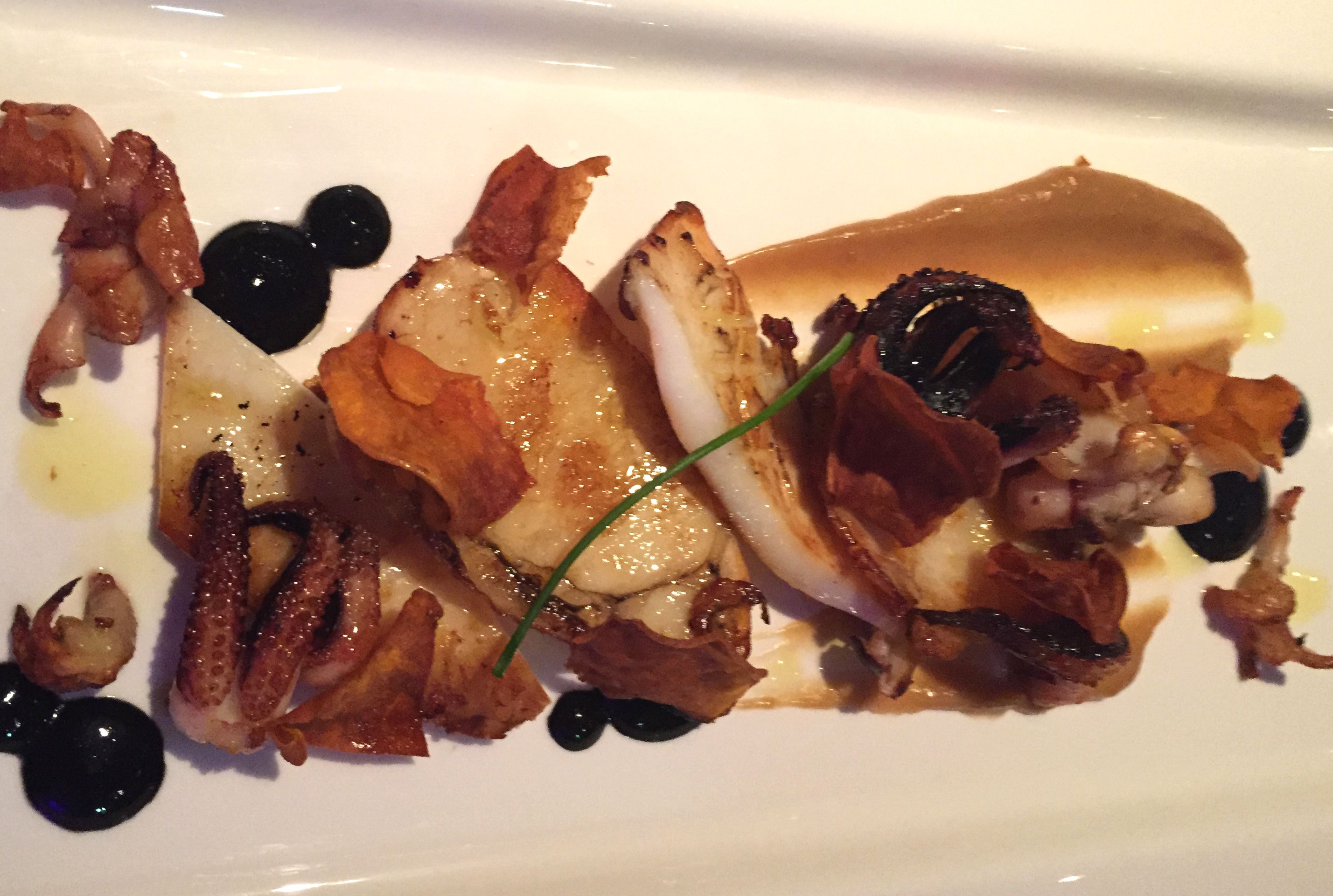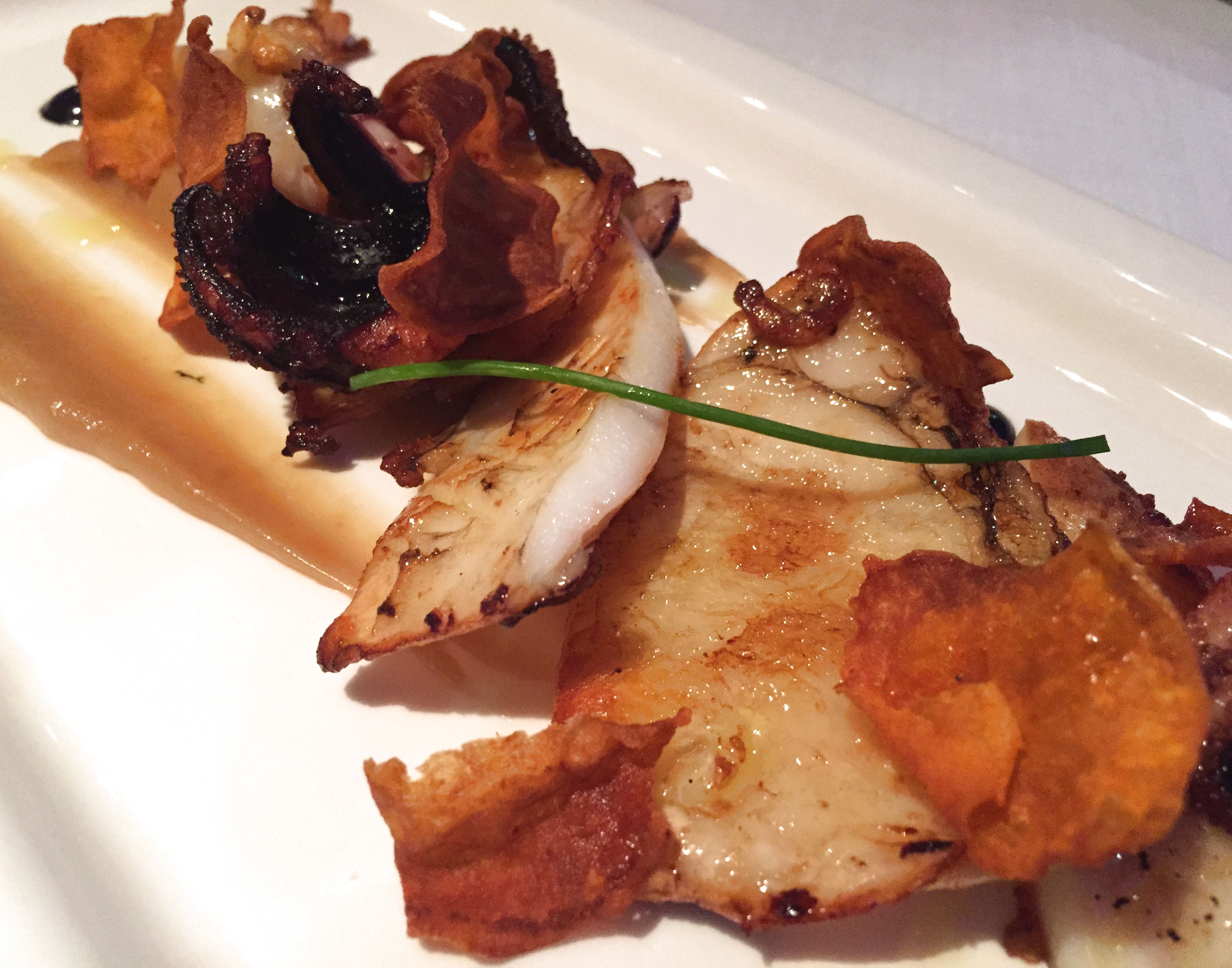 Llegaron los choquitos de la Ría a la parrilla con crema de ajos confitados y chips de boniato. El punto de los cefalopodos puede ser caprichoso por ello en calamares y sepia siempre soy partidario de hacer una limpieza extrema, lleva mucho tiempo pero eliminar todas las telillas ayuda a la buena cocción. La crema de ajos muy buena, nada fuerte pero la tinta resultó insípida, como parte de una salsa ligada habría mejorado el plato.