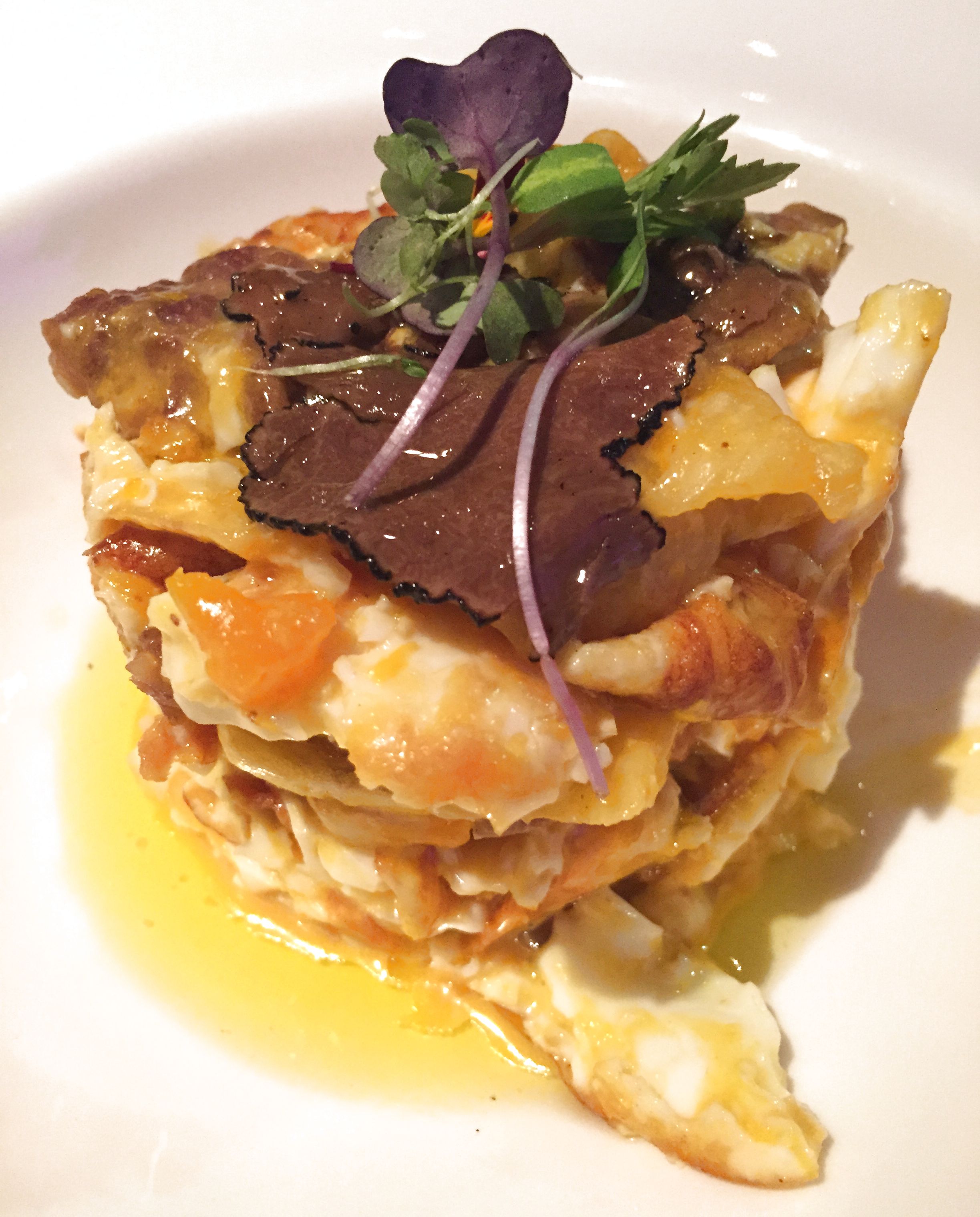 El timbal de huevos rotos con patatas, trufa negra y secreto ibérico tiene esta increíble pinta y aunque no lo probé mis tres acompañantes mostraron su beneplácito 3/3.