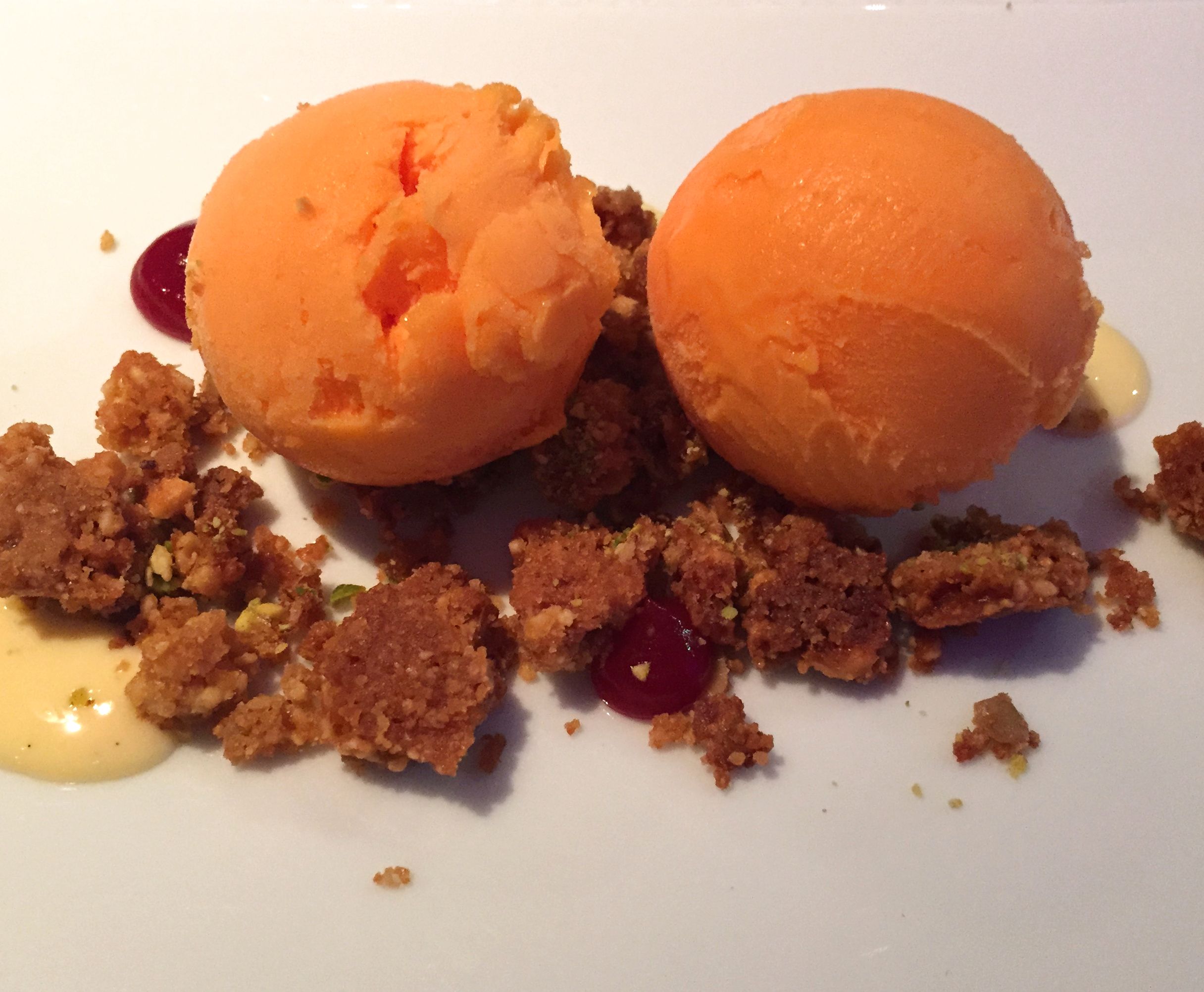 El segundo postre fue un helado artesano de mandarina sobre streussel de frutos secos, la opción mas refrescante y menos pesada.