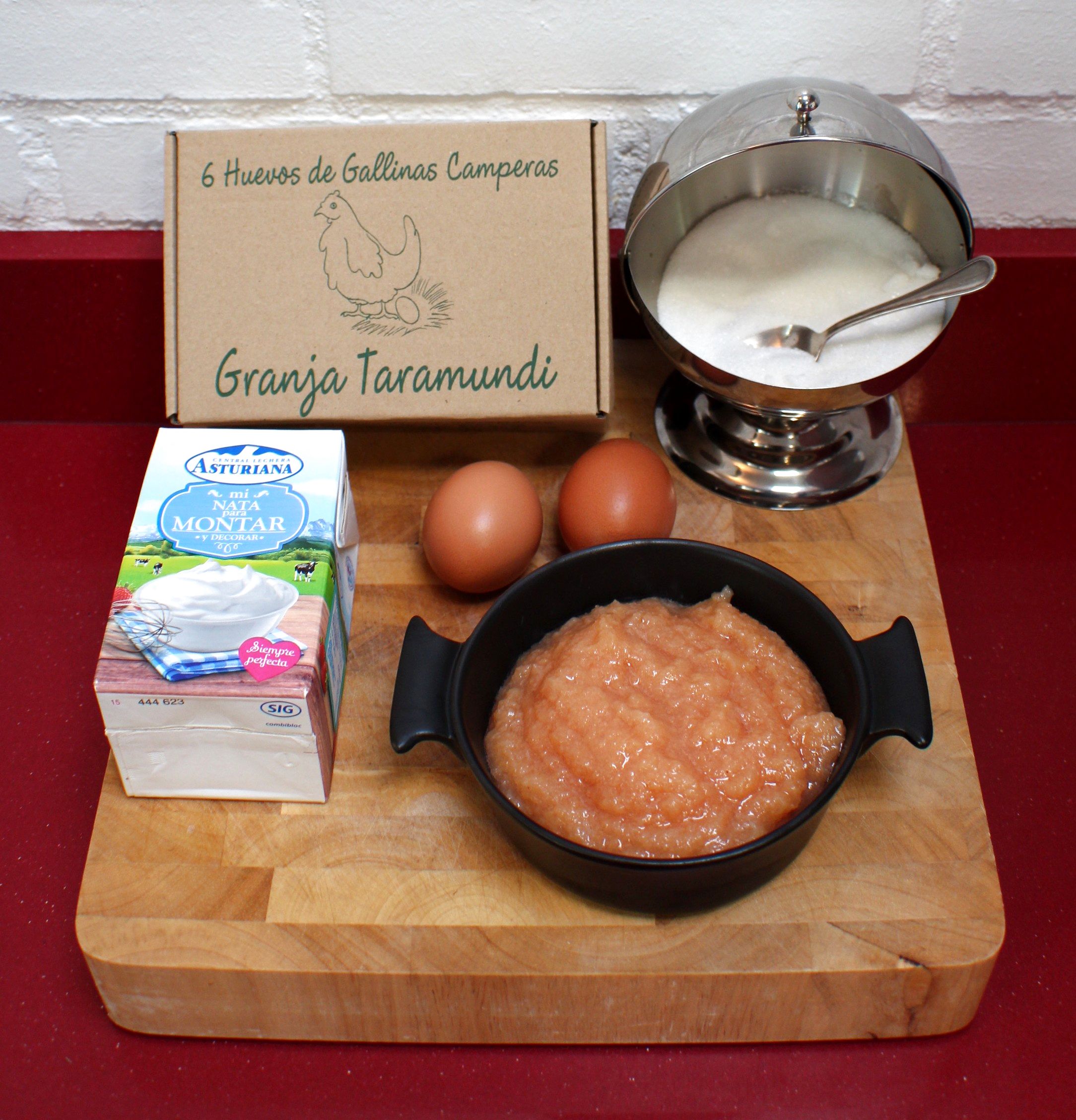 Dulce de membrillo, 2 huevos, 250ml de nata líquida para montar, 50grs de azúcar y una pizca de sal.