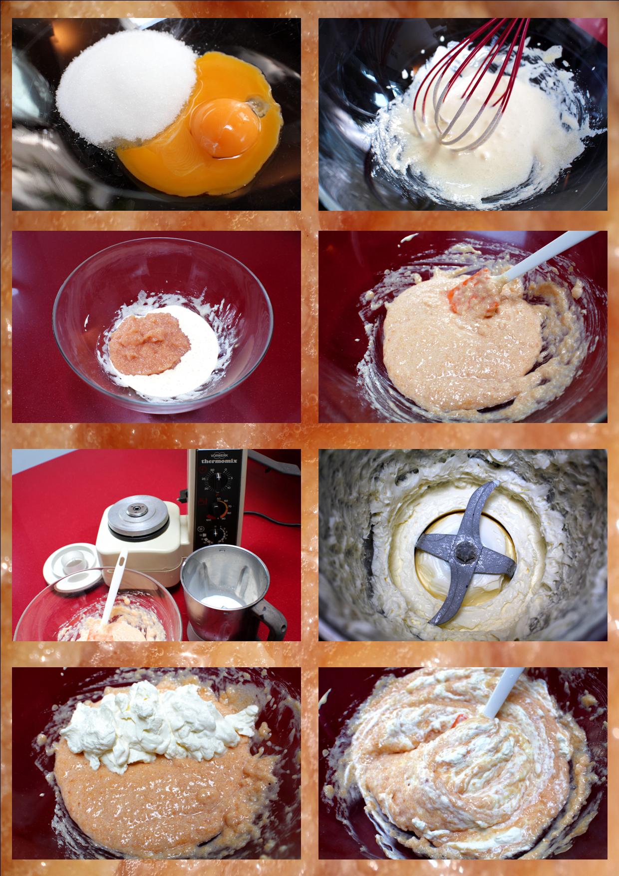 Mezclamos las yemas con el azúcar batiendo con una varilla, incorporamos el membrillo e integramos hasta que quede una pasta homogénea. Con la ayuda de un procesador batimos la nata si añadir azúcar. Volcamos sobre la pasta y con una espátula mezclamos haciendo movimientos envolventes lentos para no desmontar la nata y meterle aire.