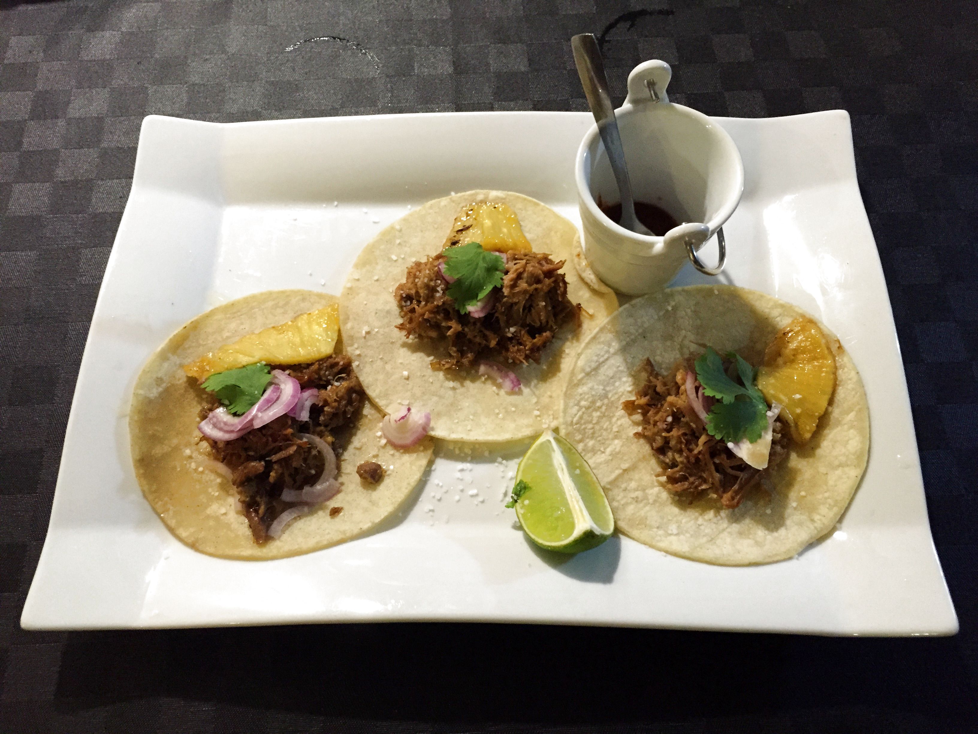 Tacos al pastor de pato confitado a la naranja y piña asada a la canela.