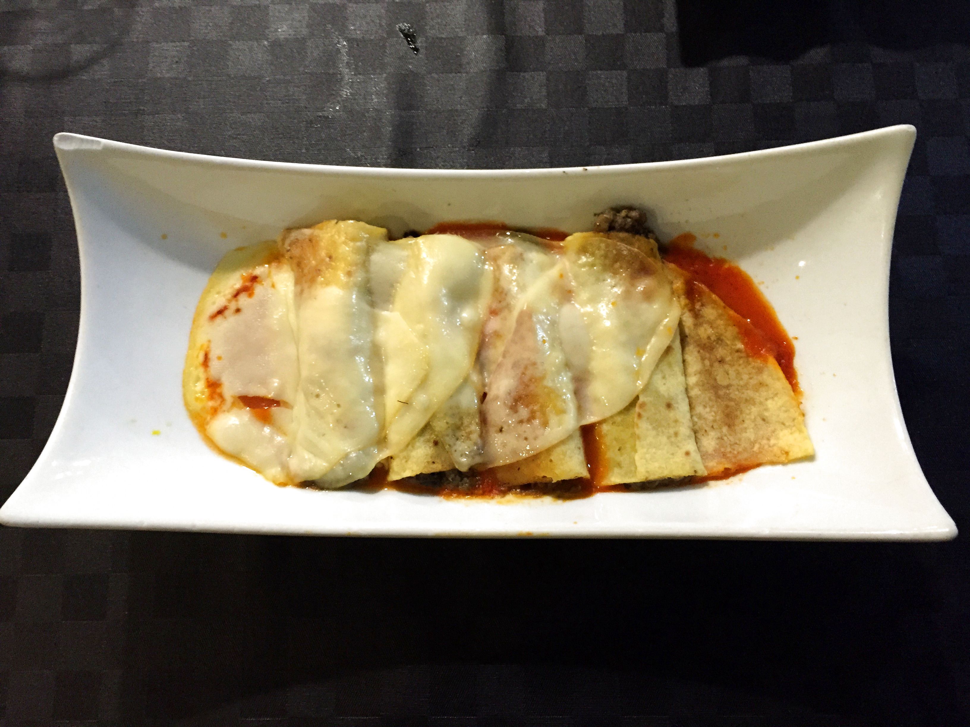 Enchilada gratinada con queso San Simón, rellena de setas silvestres y boletus en salsa de tomatitos ricos.
