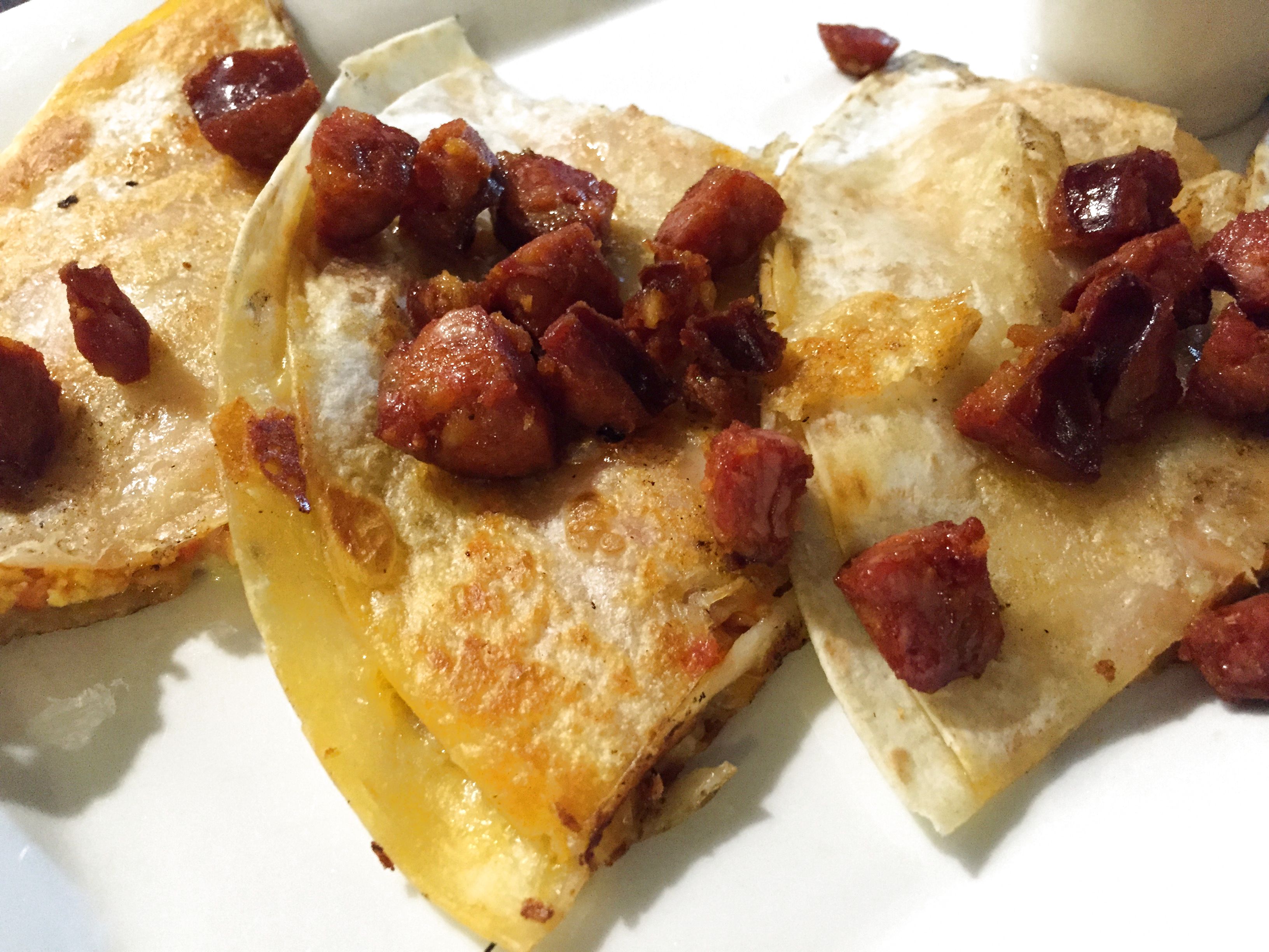 Gringa de pollo de corral estofado con cariño y queso Gouda.