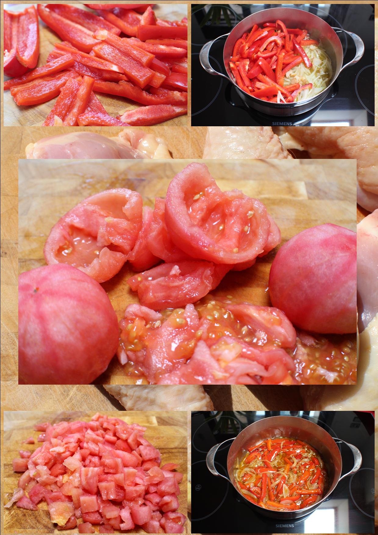 Pelamos las cebollas y cortamos en juliana al igual que los pimientos, en este caso eran del Bierzo y podéis observar su carnosidad. En el mismo aceite de haber frito el pollo y jamón ponemos a pochar las verduras y los ajos cortados que previamente habíamos utilizado, mientras se hacen a una temperatura media pelaremos los tomates, quitaremos las pepitas y cortaremos en dados que incorporamos al pochado una vez que este haya alcanzado una transparencia y ternura adecuada.