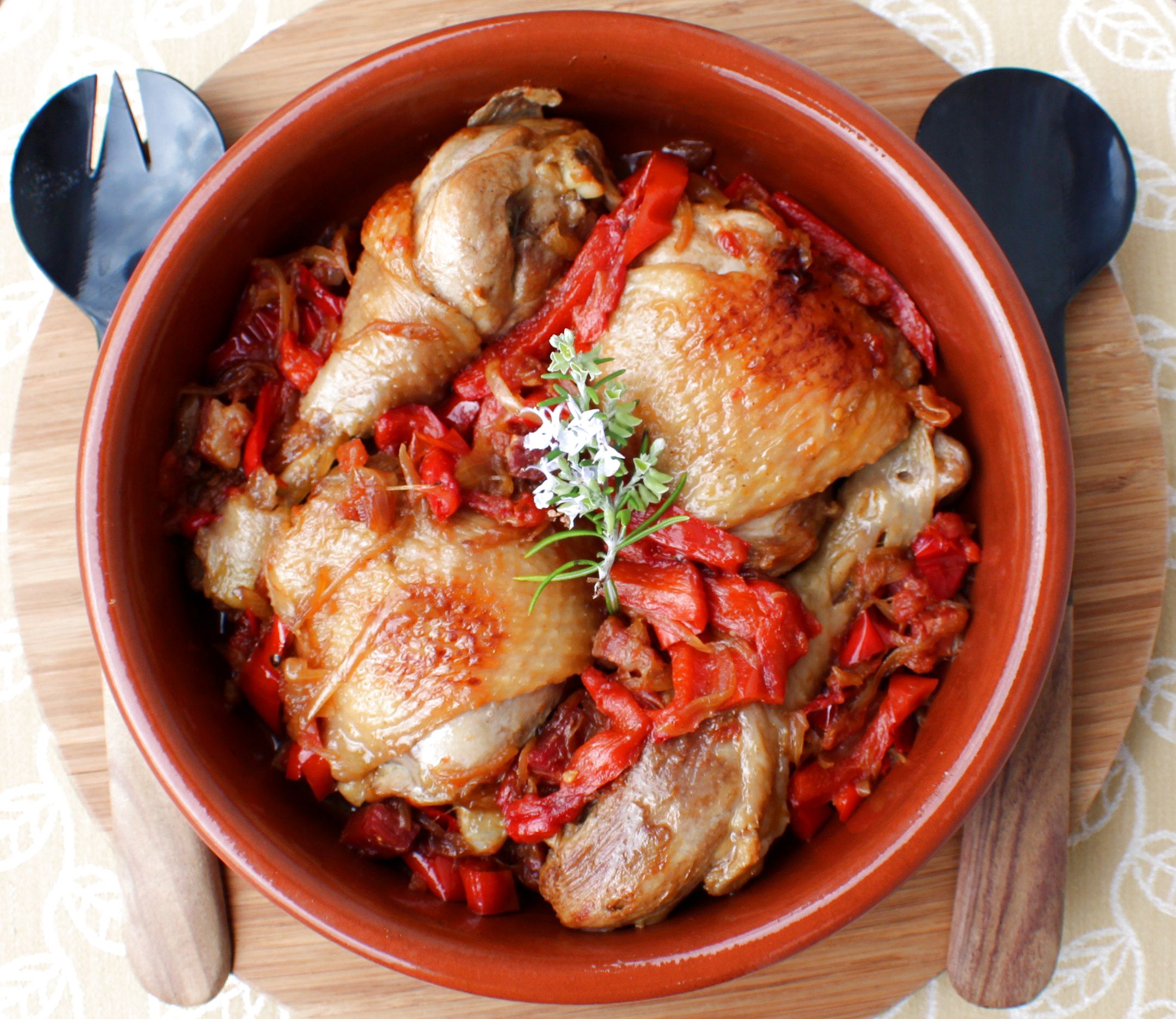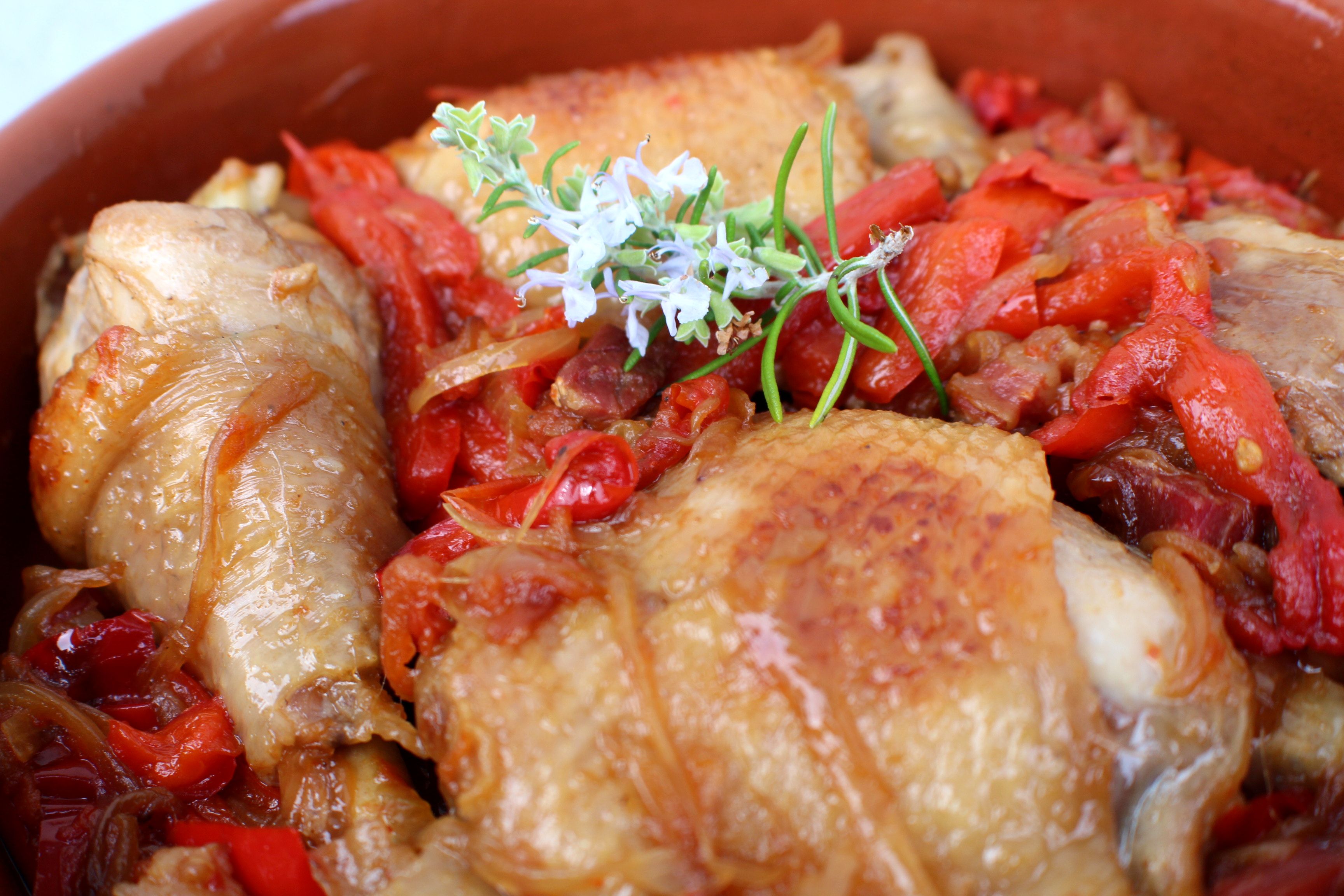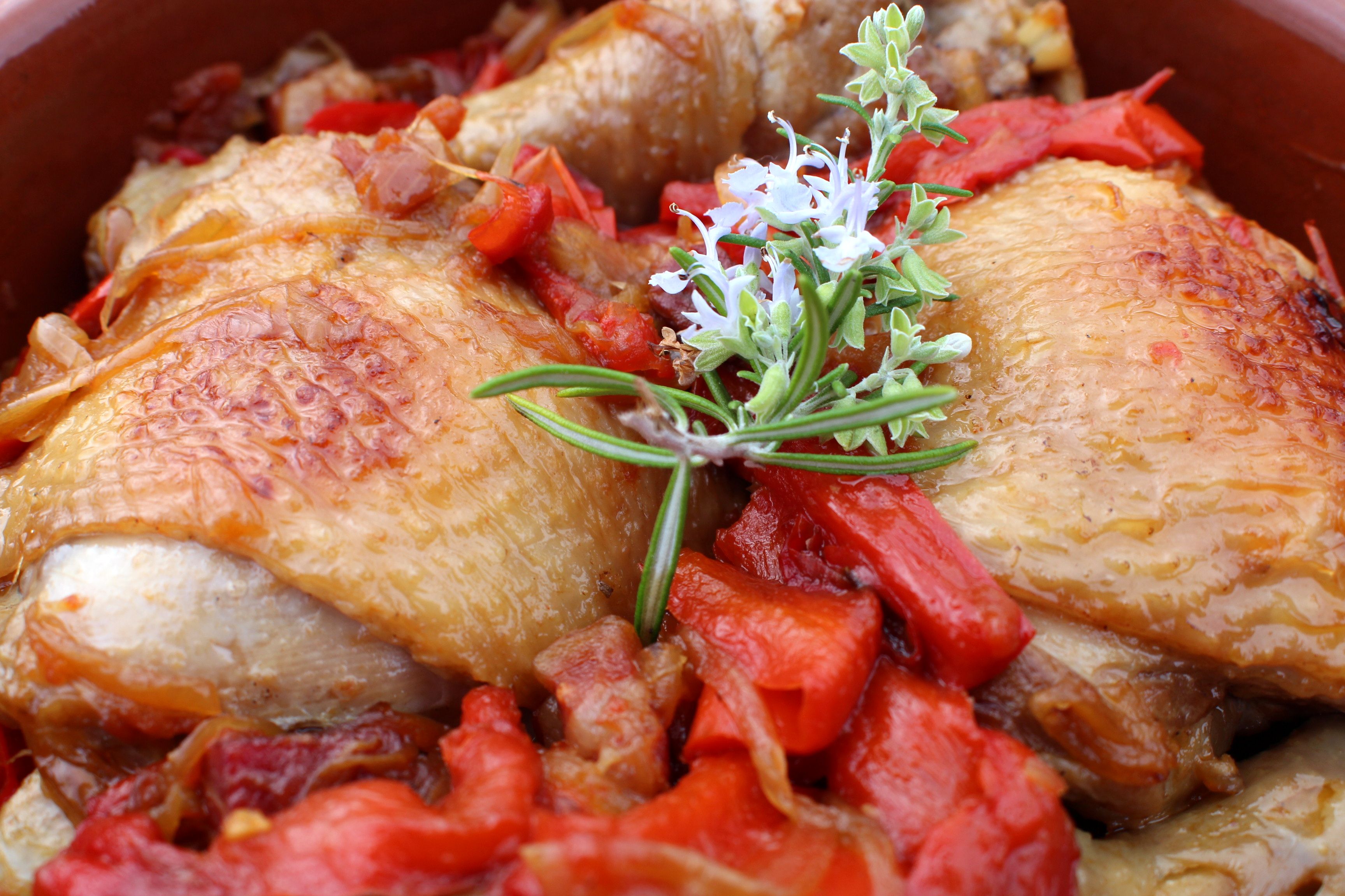Pollo ecológico, jamón de Teruel, 2 dientes de ajo, 2 cebollas, 2 pimientos rojos, 4 tomates, 1 vaso de vino blanco, aceite de oliva virgen extra, sal y pimienta.