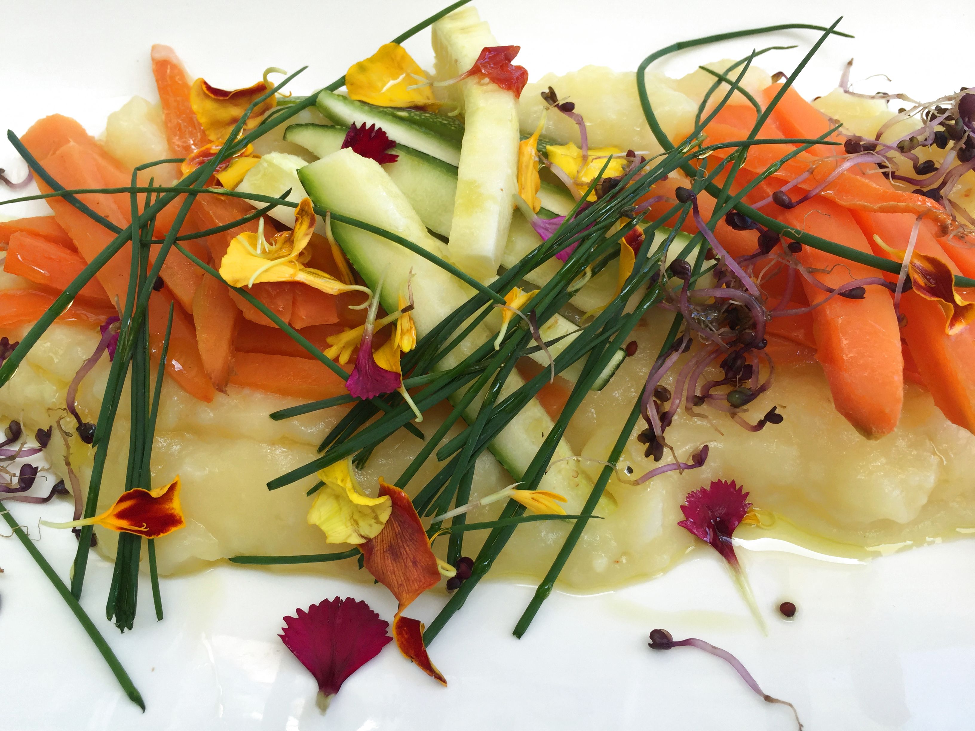 Puré de patatas al romero con germinados y bastoncitos de verduras, para mi manera de entender la gastronomía se trata de una buena guarnición que acompañe a una carne o pescado.