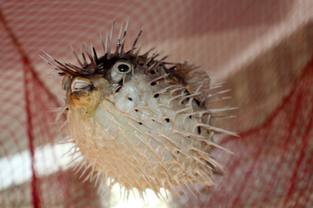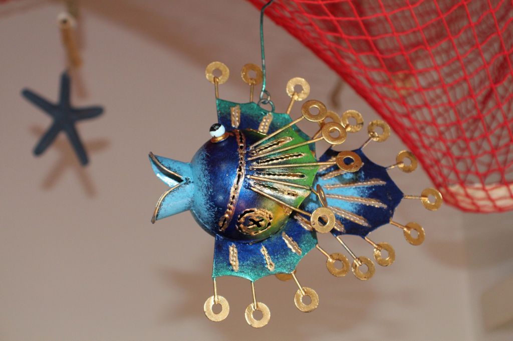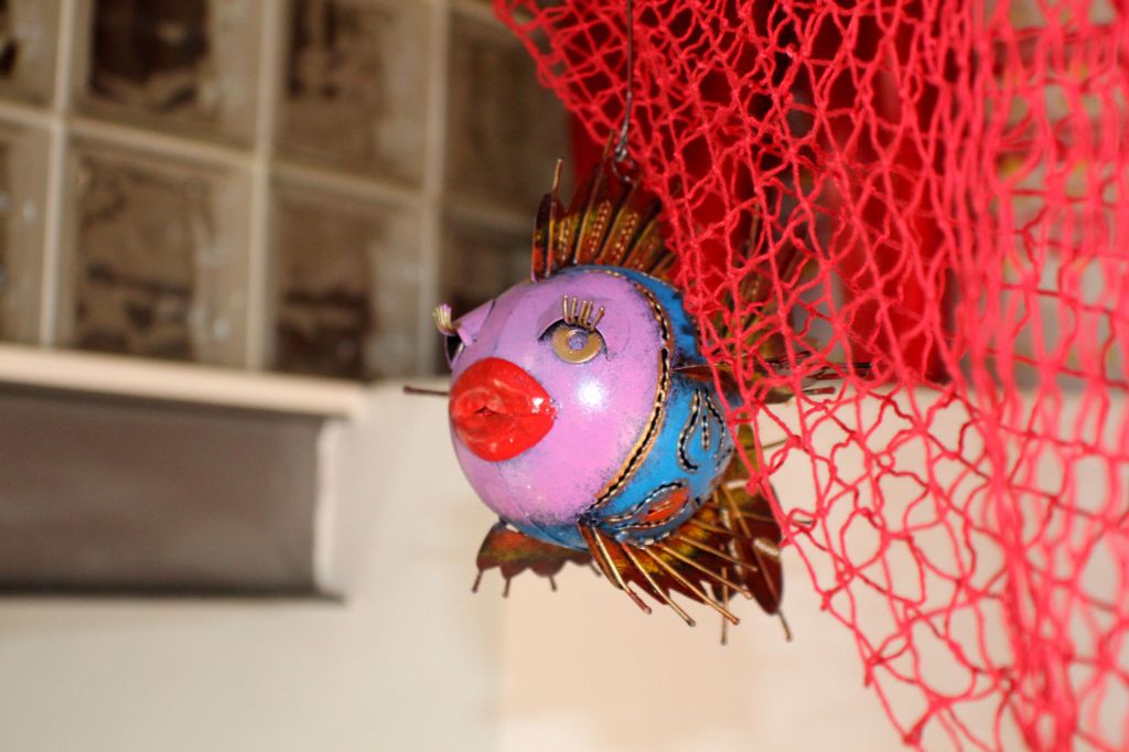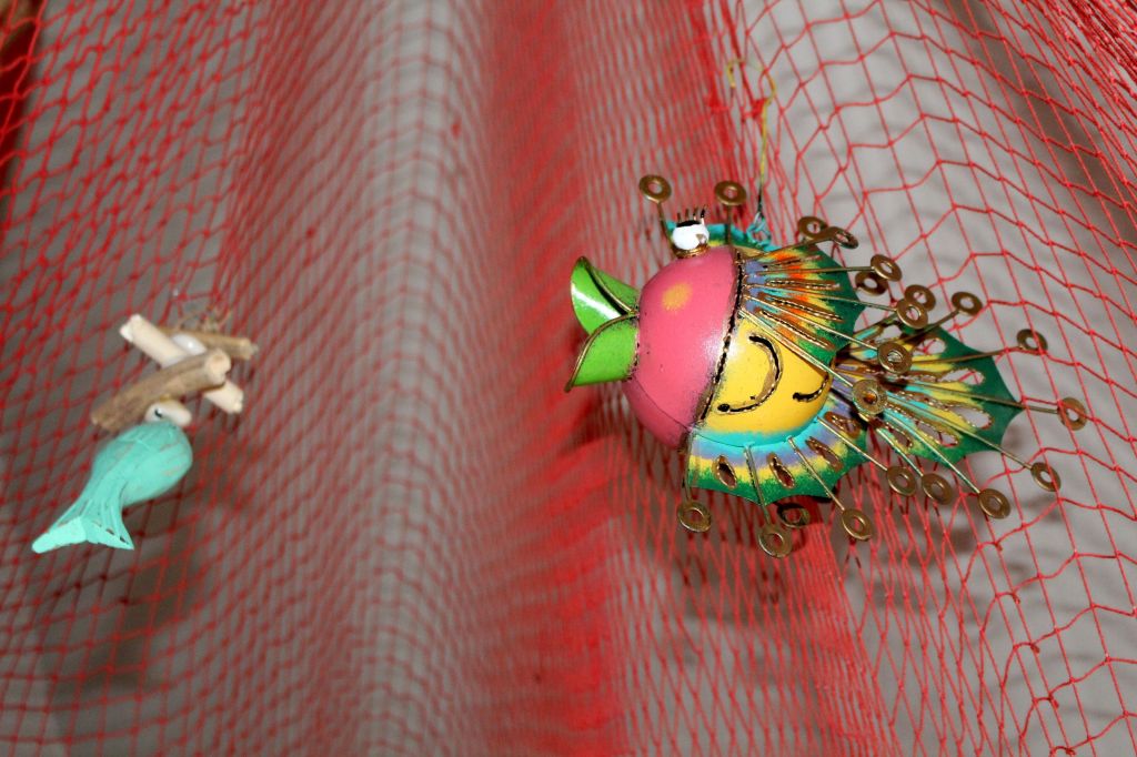 La red, como no podía ser de otra manera, roja como el fuego, entonada con el resto. De ella he colgado unos peces metálicos super originales que encontré en Tarifa, un pez globo y una estrella de mar provenientes de Marbella, algún caparazón de centollo y concha de vieira se ven atrapados sin que resulte muy recargado.