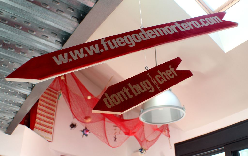 Aunque ya lo había compartido por el Facebook y lleva más de un año colocado, también estoy muy orgulloso de las flechas artesanales que me hizo mi amiga Elena Pérez Bendaña. Colgadas de un sedal cobran vida propia moviendose a su libre albedrío y nos recuerdan que estamos en el territorio de Fuego de Mortero y que no se debe molestar al chef.