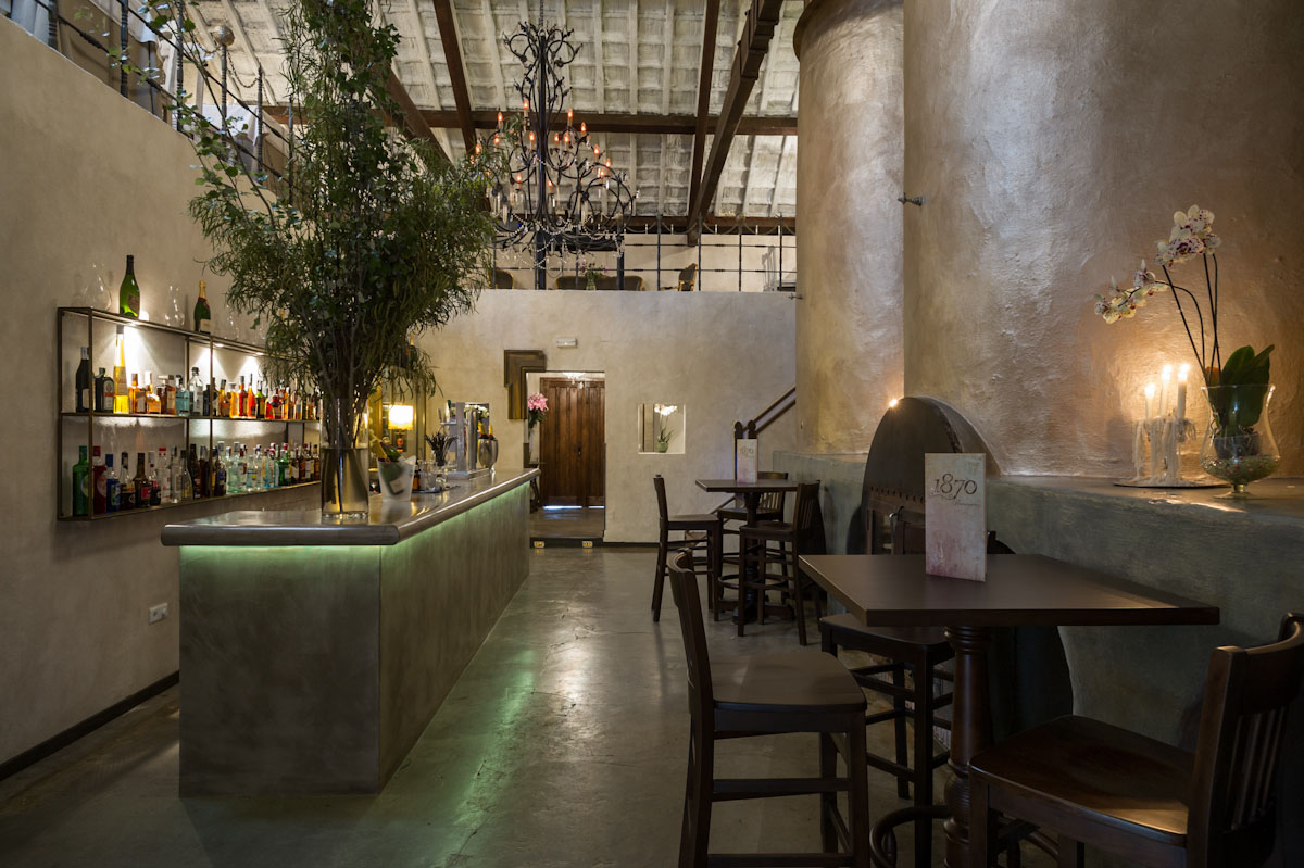 Los imponentes silos son la seña de identidad del local que distribuye el comedor en varias zonas banqueadas que se amoldan a una estructura arquitectónica de techos altos con vigas de madera y muros de carga revestidos con mortero de cemento pintado, en el que predominan los blancos. Escasos son los vanos de luz que aporten iluminación natural, han de ser considerados más bien como huecos de ventilación por lo que debemos hablar de una iluminación artificial orientada a la ambientación, las lamparas de araña, apliques, luces indirectas, lamparas de sobremesa y hasta candelabros proporcionan un ambiente retro, muy íntimo.