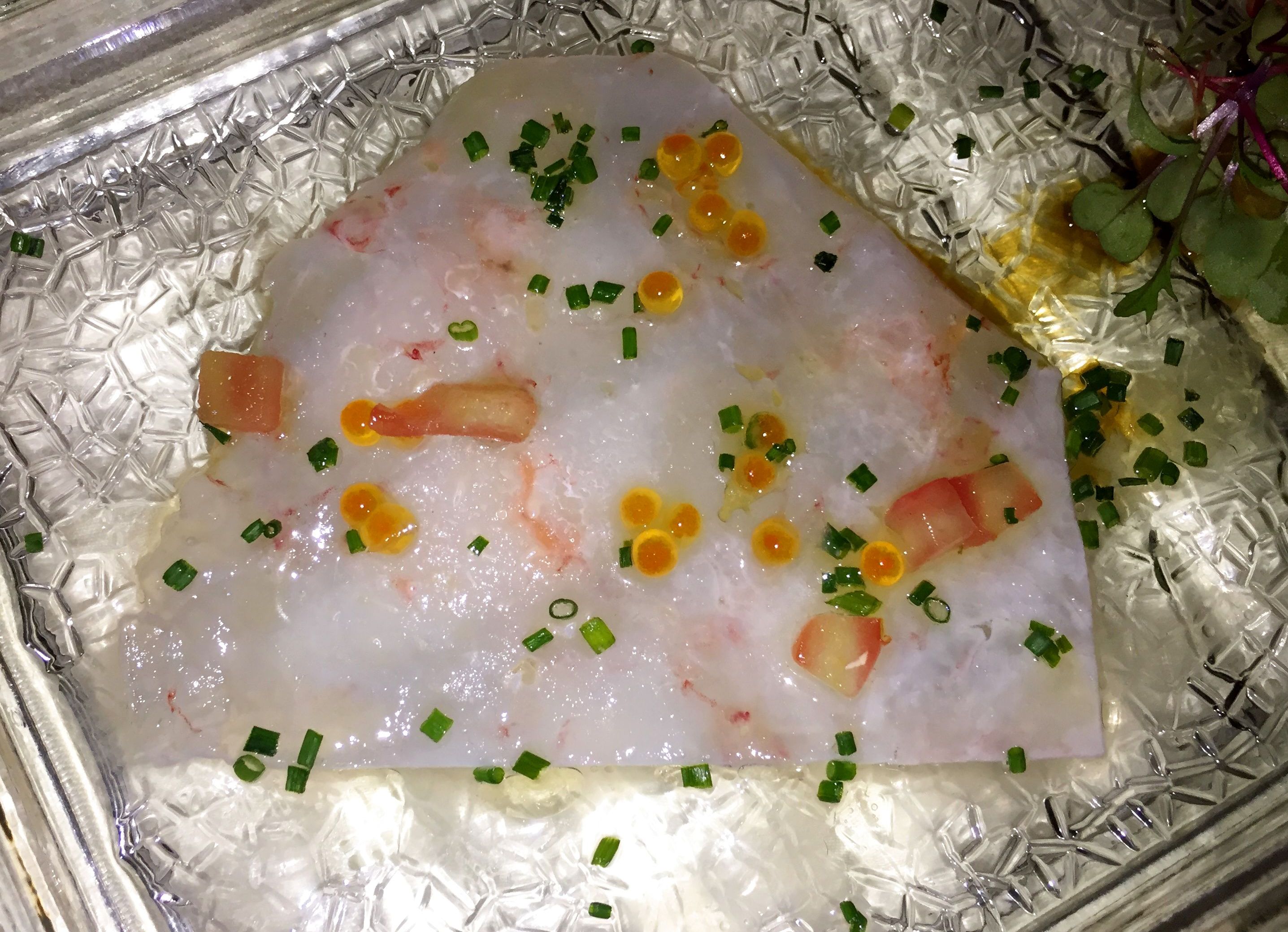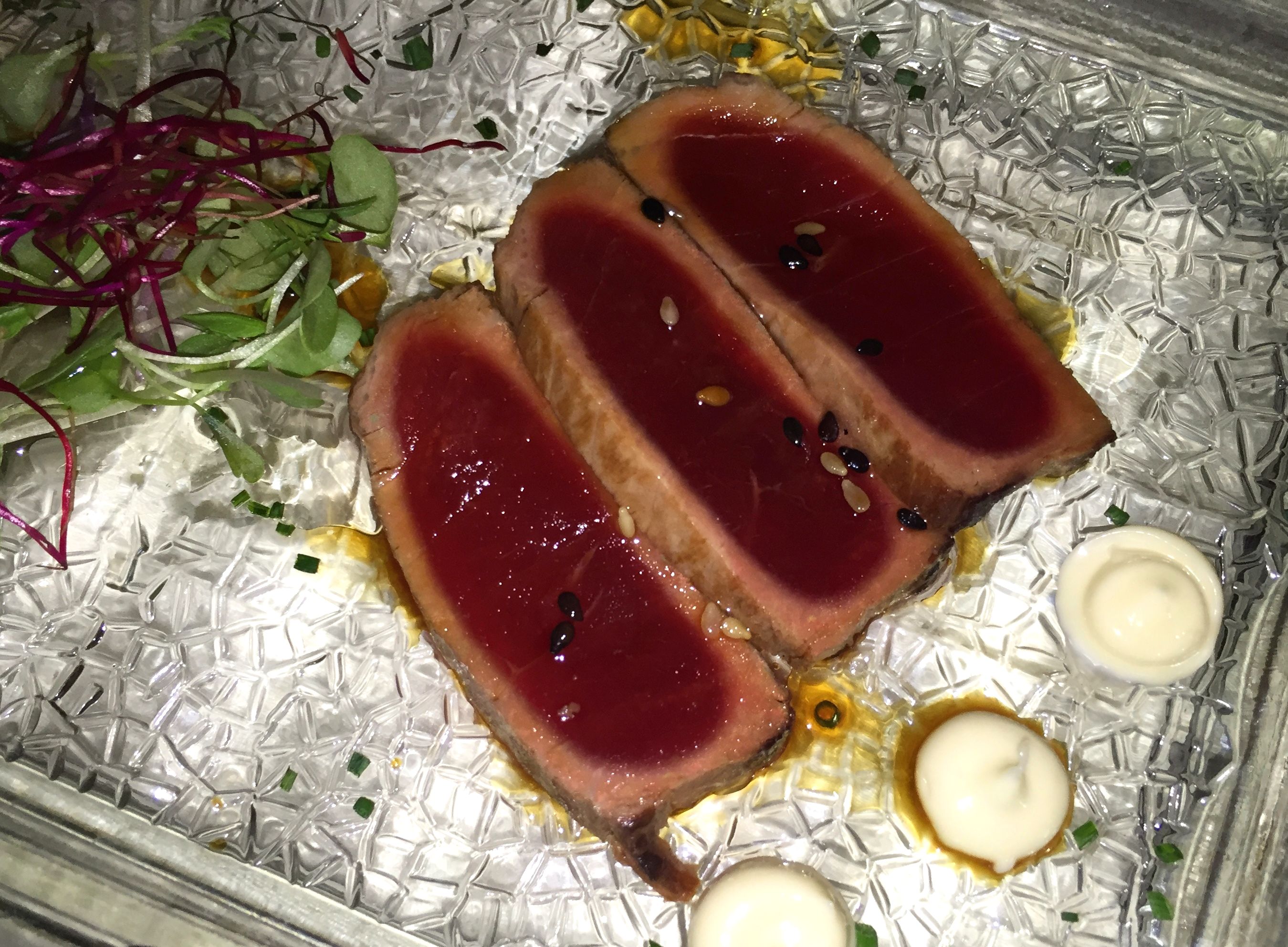 Empezamos refrescándonos con un variado de tataki de atún rojo 1870 con aliño de soja, sésamo y cítricos combinado con un carpaccio de gamba blanca, cítricos y huevas.