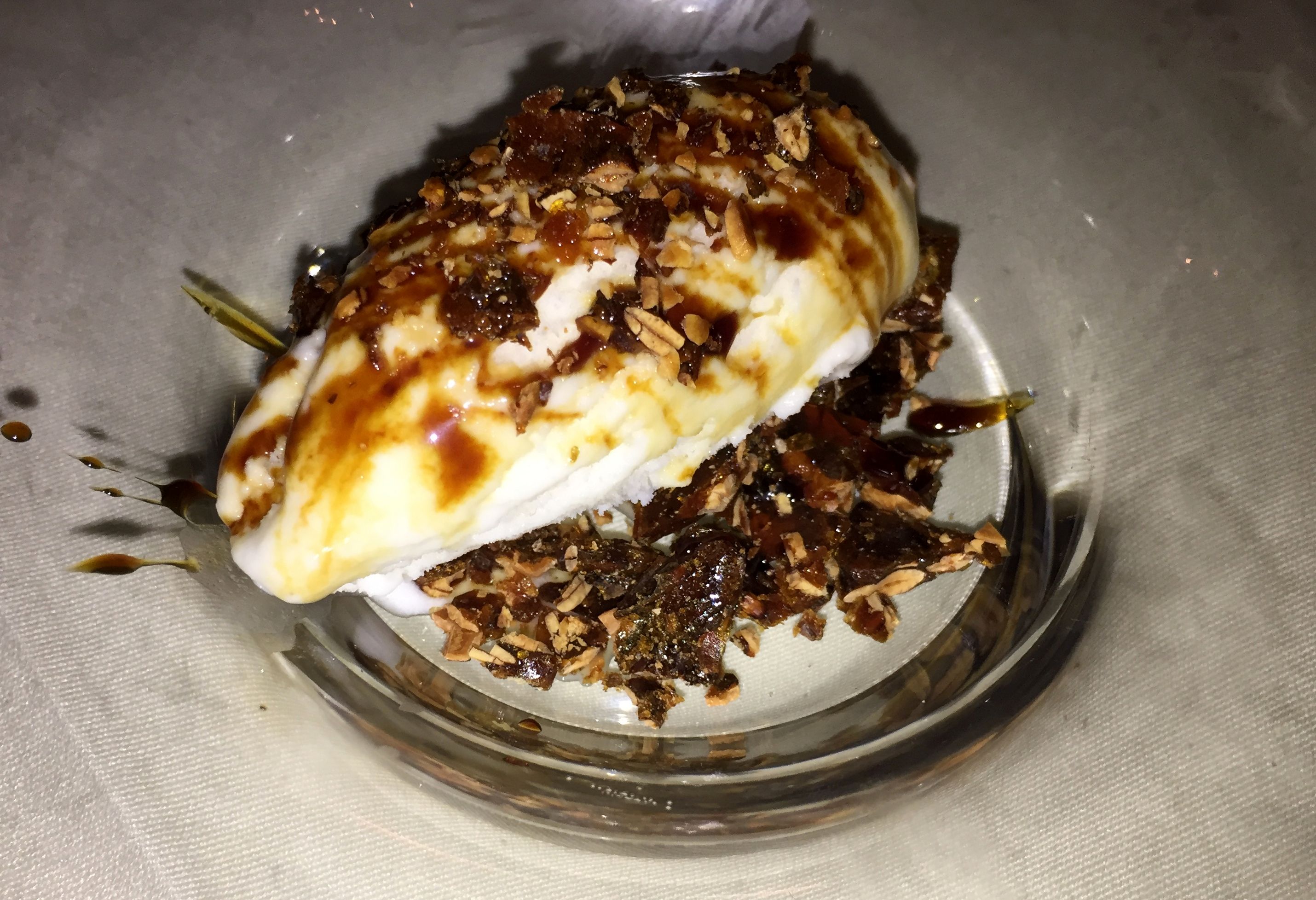 Finalizamos con un quenelle de helado de queso de cabra con unas crujientes garrapiñadas de pipas de calabaza y miel de caña de Frigiliana.
