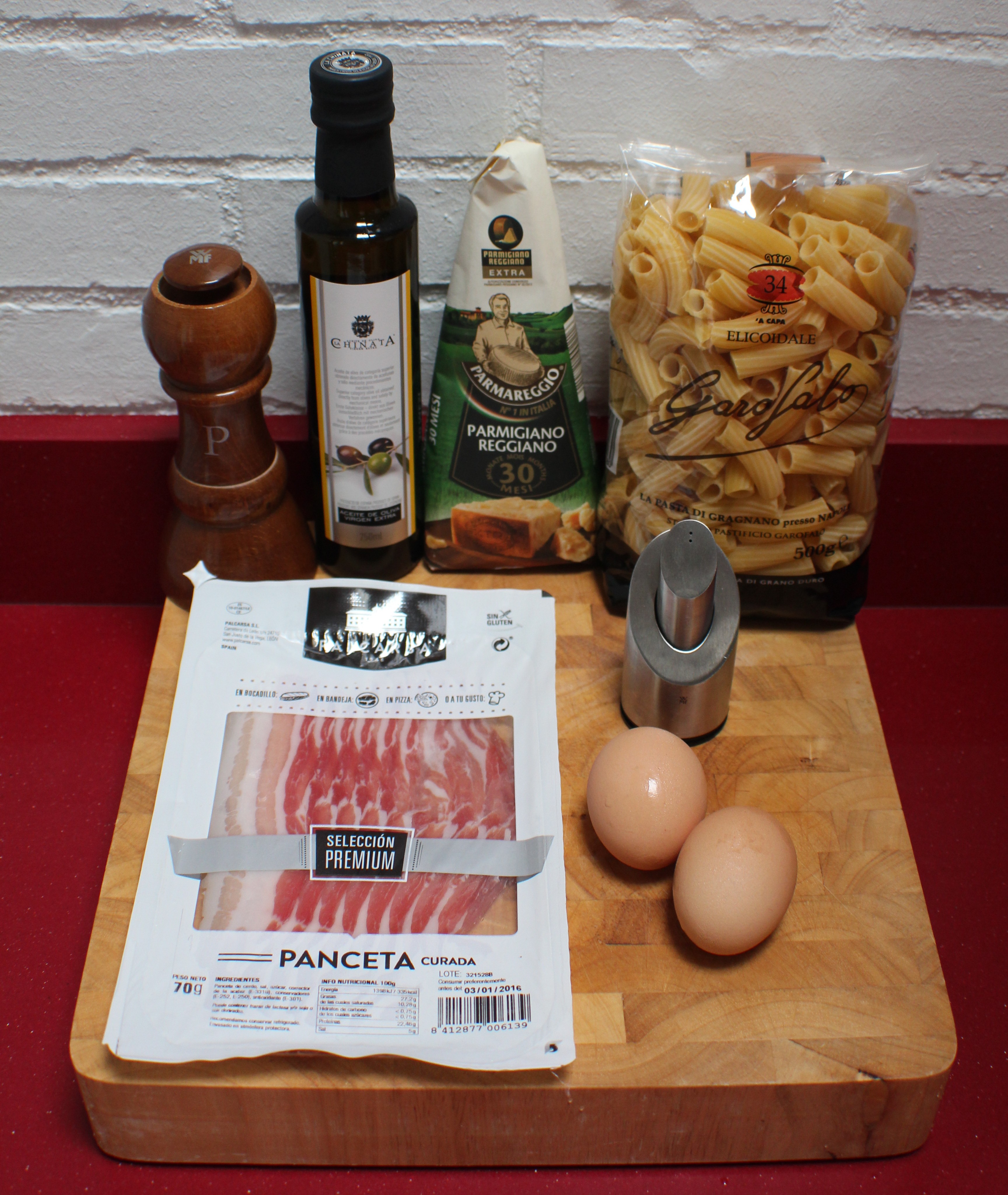 200grs de pasta, 2 yemas de huevo, 50grs de parmesano rallado, 100 grs de panceta, pimienta negra recién molida, agua, sal y aceite de oliva virgen extra.