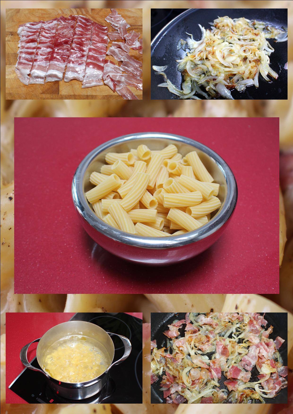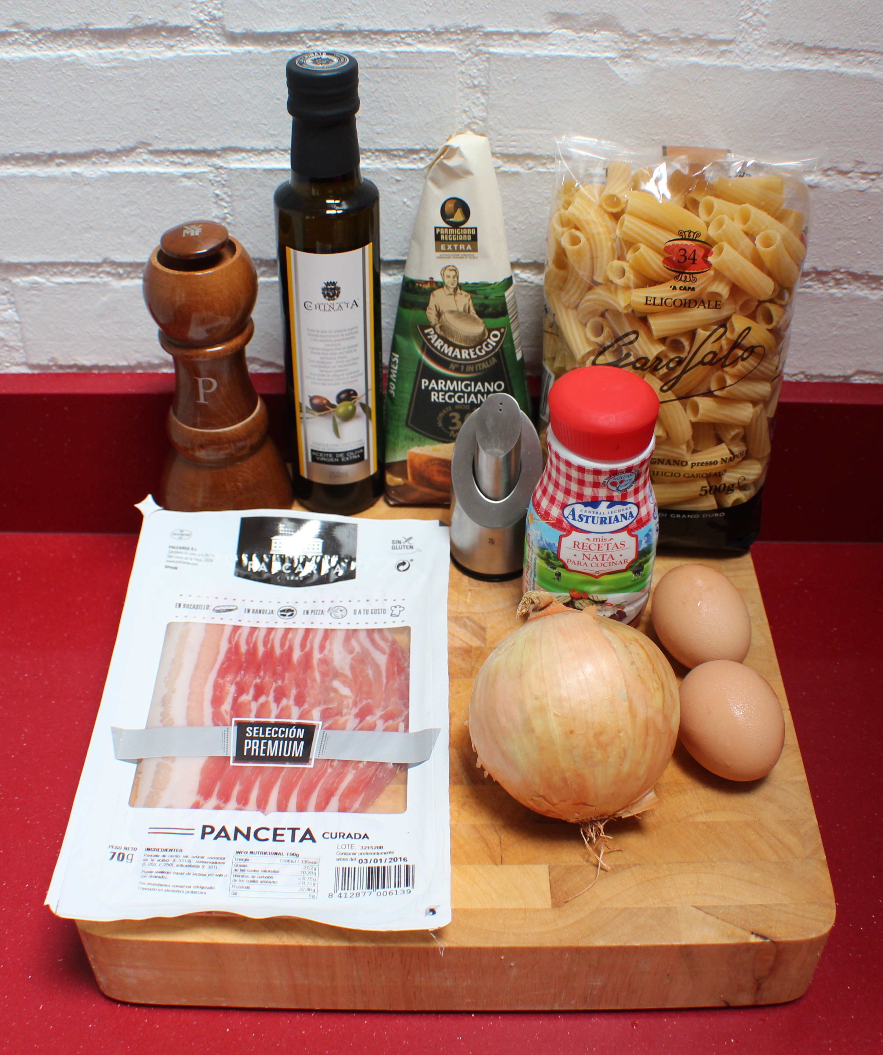 200grs de pasta, 200ml de nata 35%m.g., 2 yemas de huevo, 50grs de parmesano rallado, 100 grs de panceta, 1 cebolla grande, pimienta negra recién molida, agua, sal y aceite de oliva virgen extra.